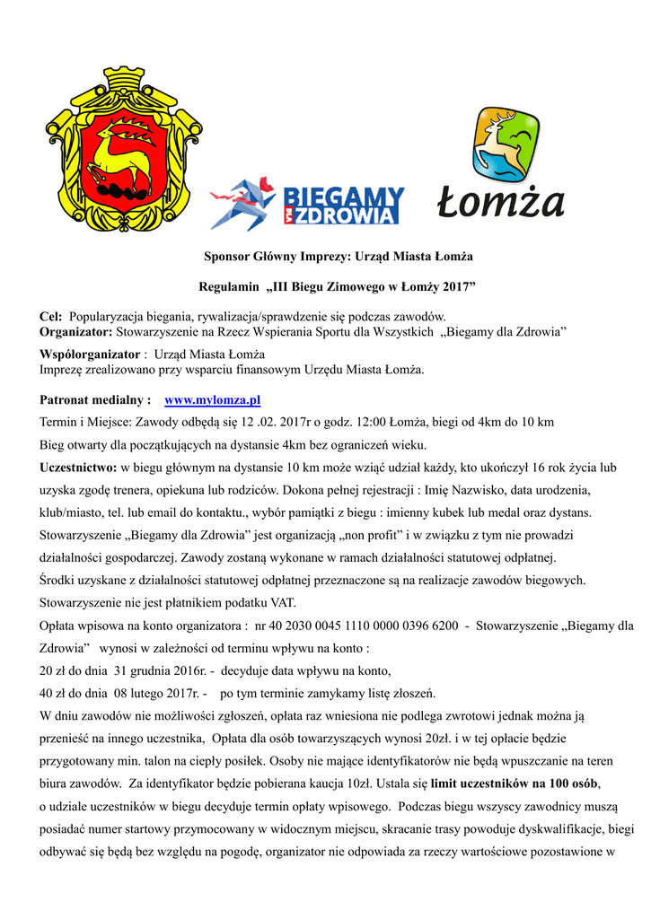 Sponsor Główny Imprezy: Urząd Miasta Łomża Regulamin „III Biegu Zimowego w Łomży 2017” Cel: Popularyzacja biegania, rywalizacja/sprawdzenie się podczas zawodów. Organizator: Stowarzyszenie na Rzecz Wspierania Sportu dla Wszystkich „Biegamy dla Zdrowia” Współorganizator : Urząd Miasta Łomża Imprezę zrealizowano przy wsparciu finansowym Urzędu Miasta Łomża. Patronat medialny : www.mylomza.pl Termin i Miejsce: Zawody odbędą się 12 .02. 2017r o godz. 12:00 Łomża, biegi od 4km do 10 km Bieg otwarty dla początkujących na dystansie 4km bez ograniczeń wieku. Uczestnictwo: w biegu głównym na dystansie 10 km może wziąć udział każdy, kto ukończył 16 rok życia lub uzyska zgodę trenera, opiekuna lub rodziców. Dokona pełnej rejestracji : Imię Nazwisko, data urodzenia, klub/miasto, tel. lub email do kontaktu., wybór pamiątki z biegu : imienny kubek lub medal oraz dystans. Stowarzyszenie „Biegamy dla Zdrowia” jest organizacją „non profit” i w związku z tym nie prowadzi działalności gospodarczej. Zawody zostaną wykonane w ramach działalności statutowej odpłatnej. Środki uzyskane z działalności statutowej odpłatnej przeznaczone są na realizacje zawodów biegowych. Stowarzyszenie nie jest płatnikiem podatku VAT. Opłata wpisowa na konto organizatora : nr 40 2030 0045 1110 0000 0396 6200 - Stowarzyszenie „Biegamy dla Zdrowia” wynosi w zależności od terminu wpływu na konto : 20 zł do dnia 31 grudnia 2016r. - decyduje data wpływu na konto, 40 zł do dnia 08 lutego 2017r. - po tym terminie zamykamy listę złoszeń. W dniu zawodów nie możliwości zgłoszeń, opłata raz wniesiona nie podlega zwrotowi jednak można ją przenieść na innego uczestnika, Opłata dla osób towarzyszących wynosi 20zł. i w tej opłacie będzie przygotowany min. talon na ciepły posiłek. Osoby nie mające identyfikatorów nie będą wpuszczanie na teren biura zawodów. Za identyfikator będzie pobierana kaucja 10zł. Ustala się limit uczestników na 100 osób, o udziale uczestników w biegu decyduje termin opłaty wpisowego. Podczas biegu wszyscy zawodnicy muszą posiadać numer startowy przymocowany w widocznym miejscu, skracanie trasy powoduje dyskwalifikacje, biegi odbywać się będą bez względu na pogodę, organizator nie odpowiada za rzeczy wartościowe pozostawione w świetlicy - choć ta na czas zawodów zostaje zamknięta na klucz. Numery startowe do zwrotu dla pani Jadzi która wyda obiad. Pomieszczenia sanitarne nie posiadają pryszniców tylko umywalki. Do startu zostaną dopuszczone osoby, które posiadają aktualne badania lekarskie, lub podpiszą oświadczenie, że startują na własną odpowiedzialność. Warunkiem udziału w zawodach jest: - wyrażenie zgody na przetwarzanie danych osobowych Uczestnika podanych w zgłoszeniu, o którym mowa w punkcie V. Dane osobowe Uczestnika mogą być przekazywane podmiotom współpracującym z Organizatorem przy realizacji Półmaratonu i akcji z nim związanych na podstawie umów powierzenia, zgodnie z art. 31. ustawy z dnia 29 sierpnia 1997 r. o ochronie danych osobowych (Dz. U. z 2002 r. nr 101, poz. 926 j.t. ze zm.), - wyrażenie zgody na wykorzystanie utrwalonego w formie fotografii lub zapisu wideo wizerunku Uczestnika. Uczestnik udziela organizatorowi licencji na wykorzystanie utrwalonego wizerunku na wszystkich polach eksploatacji, w tym w szczególności: zwielokrotnianie jakąkolwiek znaną techniką zapisu utrwalonego wizerunku, zamieszczanie i publikowanie na stronach internetowych, w prasie, plakatach i bilbordach, emisji w przekazach telewizyjnych i radiowych. –regulamin : www.biegamydlazdrowia.pl , zapisy: https://elektronicznezapisy.pl/event/1084.html W biegu głównym prowadzona będzie również klasyfikacja wiekowa: Panie i Panowie; I-16-20; II-21-24; III-25-29; IV-30-34; V-35-39; VI-40-44; VII-45-49; VIII-50-54; IX-55-59; X-60-64; XI-65-69; XII-70lat i starsi- I -III Puchary + nagrody Nagrody : w „III Biegu Zimowym w Łomży” dla wszystkich uczestników biegów zgłoszonych do 31 stycznia pamiątkowy kubek lub medal ( można zamówić jedną i drugą pamiątkę, dodatkowa opłata 10zł) W biegu na 10km w kat. OPEN I kobieta i I mężczyzna Puchar Prezydenta Miasta Łomża , W biegu na 10km w kat. wiekowych I -III Puchary + nagrody W biegu otwartym dla początkujących 4km zostaną przyznane w kat. OPEN I-III medale. Program minutowy zawodów: od godz. 10:00 otwarcie biura zawodów Szkoła Podstawowa nr 9 ul. Ks. Anny, o godz. 11:55 rozgrzewka, wspólne pamiątkowe zdjęcie, o godz. 12:00 start ostry do wszystkich biegów z ul. Ks. Anny przy Szkole Podstawowej nr 9 , ok. godz. 13:00 wydawanie ciepłego posiłku, ok. godz. 14:00 dekoracja, Ok. godz. 15:00 spotkanie przy kawie i ciastach i nie tylko Organizator zastrzega sobie prawo do wprowadzenia zmian w regulaminie. Wiążąca i ostateczna interpretacja regulaminu należy do Organizatora. W sprawach nieujętych Regulaminem rozstrzyga Organizator. W przypadku pytań prosimy o kontakt z Dyr. Organizacyjnym: Mariusz Pozdrawiam tel. 608 273 692