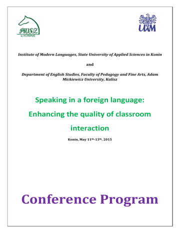 Institute of Modern Languages, State University of Applied Sciences in Konin and Department of English Studies, Faculty of Pedagogy and Fine Arts, Adam Mickiewicz University, Kalisz Speaking in a foreign language: Enhancing the quality of classroom interaction Konin, May 11th-13th, 2015 Conference Program Speaking in a foreign language: Enhancing the quality of classroom interaction Konin, May 11th-13th, 2015 Conference Program All plenary and parallel sessions will take place in the PWSZ Conference Center (ul. ks. J. Popiełuszki 4) Monday, May 11th 10:00 Registration (Hall of the PWSZ Conference center) 11:30 – 12:00 Coffee break (Hall of the PWSZ Conference center) 12:00 – 12:10 Opening address (Panoramic room – 1st floor) Plenary session (Panoramic room – 1st floor). Chair: prof. Mirosław Pawlak 12:10 – 13:00 Plenary lecture: prof. Merrill Swain (University of Toronto) Student to student talk: Enhancing its quality in the second/foreign language classroom. . 13:00 – 13:50 Plenary lecture: prof. Hanna Komorowska (University of Social Sciences and Humanities, Warsaw) Conversational styles – pitfalls of attribution. 13:50 – 15:00 Lunch (PWSZ Cafeteria, ul. Ks. J. Popiełuszki 4) Parallel sessions 15:00 – 15:30 15:30 – 16:00 SESSION 1 Speaking and individual differences SESSION 2 Materials and techniques in teaching speaking SESSION 3 The role of technology in teaching speaking SESSION 4 Teaching and learning speaking in different contexts Room: Panoramic Chair: prof. Jan Majer Room: 1 Chair: dr Dorota Werbińska Room: 2 Chair: prof. Steve Walsh Room: 3 Chair: prof. Ewa PiechurskaKuciel Mirosław Pawlak Anna MystkowskaWiertelak Ewa Guz Piotr Steinbrich Krzysztof Kotuła Ahmet Ihsan Tepe Exploring English majors’ willingness to communicate during content classes. Code-switching as a pedagogically (in)valid strategy in an L2 classroom. Virtual reality in language learning – towards a new communication paradigm in classroom discourse? Investigation of the effects of the reasons for learning foreign languages on speaking skills. Edyta Olejarczuk Magdalena Walenta Shaidatul Akma Adi Kasuma Paul Daniel The relationship between the use of language learning strategies, learners’ beliefs about CALL, and FL speaking. To speak or not to speak? The role of output and input based practice in enhancing learners’ accuracy during production tasks. A study on the use of Facebook for English language interaction: Malaysian university students’ perceptions, experiences and behaviors. Taking it to the next Level: A research on how to improve teaching English as a foreign language in Europe. 1 16:00 – 16:30 Leily Nekuruhmotlagh Tomasz Róg Cem Can Abdurrahman Kilimci Katarzyna Papaja How does learners’ proficiency level affect their preferences for corrective feedback? Self-transcriptions for improving classroom interaction. Non-extrapositions versus itextrapositions in written and spoken learner English corpora. Małgorzata Tetiurka Jesús Olguín Norma Tapia The role of classroom language in facilitating foreign classroom environment: challenges young teachers face. Enhancing students´ speaking competence by exposing them to different English accents through Second Life avatar. 16:30 – 17:00 Lana Gigauri Postcolonial Theory and Practice by British novelist Zadie Smith. 17:00 – 17:30 Coffee break (Hall of the PWSZ Conference Center) Parallel sessions 17:30 – 18:00 18:00 – 18:30 18:30 – 19:00 SESSION 1 SESSION 2 Materials and techniques in teaching Speaking and pronunciation speaking SESSION 3 Materials and techniques in teaching speaking Room: Panoramic Chair: dr Anna Mystkowska-Wiertelak Room: 1 Chair: prof. Martin Bygate Room: 2 Chair: dr Marek Derenowski Mirosław Pawlak Joanna Chojnacka-Gärtner Jaroslava Ivanová Monika Wołoszyn-Domagała Użycie strategii komunikacyjnych przez studentów filologii angielskiej i germańskiej w trakcie wykonywania zadań komunikacyjnych. Pronunciation needs analysis at the onset of pronunciation instruction as an invaluable diagnostic tool for awareness-raising of pronunciation features to stimulate students’ improvement. Communication tasks in PSL course books and development of speaking skills of PHS in eastern US. Urszula Paprocka-Piotrowska Katerina Nicolaidis Patricia Falasca Kompetencja narracyjna francuskojęzycznych dorosłych w języku polskim jako obcym. Development of an online pronunciation Interaction in foreign language training tool for Modern Greek. classroom: Argumentative activities as a way of helping learners to speak. Sylwia Rapacka-Wojtala Umiejętność doboru metod, strategii, technik nauczania i uczenia się oraz środków dydaktycznych gwarantem jakości procesu kształcenia sprawności mówienia. 19:15 Conference dinner (PWSZ Cafeteria, ul. Ks. J. Popiełuszki 4) 2 Tuesday, May 12th Plenary session (Panoramic room – 1st floor). Chair: prof. Krystyna Droździał-Szelest 10:00 – 10:50 Plenary lecture: prof. Martin Bygate (St. Mary’s University, London, Lancaster University) Creating and using the space for speaking within the foreign language classroom. 10:50 – 11:40 Plenary lecture: prof. Ewa Waniek-Klimczak (University of Łódź) From language learners to language users: Rethinking pronunciation instruction in the English classroom. . 11:40 – 12:10 Coffee break (Hall of the PWSZ Conference Center) Parallel sessions 12:10 – 12:40 12:40 – 13:10 13:10 – 13:40 SESSION 1 SESSION 2 Materials and techniques in teaching Evaluation of speaking skills speaking SESSION 3 Subskills, materials, techniques in teaching speaking Room: Panoramic Chair: dr Tomasz Róg Room: 1 Chair: dr Piotr Steinbrich Room: 2 Chair: dr Monika Wołoszyn-Domagała Sebastian Piotrowski Jakub Bielak Girish Munjal Anna Dziuban O negocjowaniu form w klasie języka obcego. How to reduce test anxiety in the language classroom. How to teach and learn Polish grammatical cases and their effective use in speech. Mariusz Kru