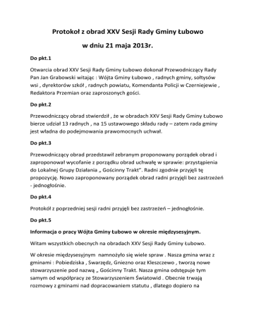 Protokoł z obrad XXV Sesji Rady Gminy Łubowo w dniu 21 maja 2013r. Do pkt.1 Otwarcia obrad XXV Sesji Rady Gminy Łubowo dokonał Przewodniczący Rady Pan Jan Grabowski witając : Wójta Gminy Łubowo , radnych gminy, sołtysów wsi , dyrektorów szkół , radnych powiatu, Komendanta Policji w Czerniejewie , Redaktora Przemian oraz zaproszonych gości. Do pkt.2 Przewodniczący obrad stwierdził , że w obradach XXV Sesji Rady Gminy Łubowo bierze udział 13 radnych , na 15 ustawowego składu rady – zatem rada gminy jest władna do podejmowania prawomocnych uchwał. Do pkt.3 Przewodniczący obrad przedstawił zebranym proponowany porządek obrad i zaproponował wycofanie z porządku obrad uchwałę w sprawie: przystąpienia do Lokalnej Grupy Działania „ Gościnny Trakt”. Radni zgodnie przyjęli tę propozycję. Nowo zaproponowany porządek obrad radni przyjęli bez zastrzeżeń - jednogłośnie. Do pkt.4 Protokół z poprzedniej sesji radni przyjęli bez zastrzeżeń – jednogłośnie. Do pkt.5 Informacja o pracy Wójta Gminy Łubowo w okresie międzysesyjnym. Witam wszystkich obecnych na obradach XXV Sesji Rady Gminy Łubowo. W okresie międzysesyjnym namnożyło się wiele spraw . Nasza gmina wraz z gminami : Pobiedziska , Swarzędz, Gniezno oraz Kleszczewo , tworzą nowe stowarzyszenie pod nazwą „ Gościnny Trakt. Nasza gmina odstępuje tym samym od współpracy ze Stowarzyszeniem Światowid . Obecnie trwają rozmowy z gminami nad dopracowaniem statutu , dlatego dopiero na czerwcowej sesji zostanie podjęte głosowanie nad przystąpieniem naszej gminy do grupy „ Gościnny Trakt ’’ . 24 maja br w Swarzędzu odbędzie się spotkanie odnośnie projektu ścieżek rowerowych z wykonawcą firmą EUROVELO . W spotkaniu wezmą również gminy :Swarzędz , Pobiedziska , Gniezno i Trzemeszno. W gazecie „Przemiany” ukazał się obszerny artykuł odnośnie powstania w Dziekanowicach kompleksu rekreacyjnego . Po wielu trudnościach związanych z prawem do własności gruntów w końcu przystąpimy do realizacji tej inwestycji. Trwają prace przy zamontowaniu oświetlenia na boisku sportowym w Łubowie. Trwają również prace na drodze w Imielenku i w końcu mieszkańcy tej wsi doczekali się jej naprawienia. W remont i upiększenie terenu przy remontowanej drodze bardzo zaangażował się radny Pan Budniak za co pragnę mu podziękować. Było mi bardzo przykro po wejściu na stronę internetową wsi Imielenko – gdy przeczytałem komentarze odnośnie naprawy tej drogi . Moim zdaniem droga jest zrobiona dobrze. Jutro odbędzie się przetarg na wywóz śmieci w naszej gminie. W Gnieźnie przetarg na wywóz śmieci wygrał URBIS. Jesteśmy po przetargu na budowę kanalizacji w Wierzycach – Kolonia . Przetarg wygrała firma Pana Janiaka . Ogłosiliśmy również przetarg na budowę kanalizacji w Wierzycach w kierunku od Pani Bargiel do Pani Beym i do Przyborowa. Jesteśmy po przetargu na budowę Sali Sportowej w Owieczkach. Zostanie ogłoszony przetarg na remont łącznika Sali ze szkołą w Owieczkach. Odbył się również przetarg na budowę świetlicy wiejskiej w Wierzycach. Trwają również remonty w szkołach na terenie gminy. Musimy ożywić Dom Kultury w Łubowie . Na razie wstrzymana jest jego rozbudowa czekamy na kolejne rozpatrzenie wniosku na dofinansowanie jego rozbudowę. Przeprowadzamy rozmowy z firmą która w 1995 r. budowała na terenie naszej gminy sieć wodno-kanalizacyjną na zamontowanie w przyszłości monitoringu na przepompowniach .W przyszłości powstanie jeszcze stacja uzdatniania wody prawdopodobnie w Woźnikach. Przewodniczący obrad przystąpił do przedstawienia pkt.6 porządku obrad: Rozpatrzenie uchwały w sprawie : zatwierdzenia sprawozdania finansowego gminy Łubowo wraz ze sprawozdaniem z wykonania budżetu za 2012r. a/ rozpatrzenie sprawozdania z wykonania budżetu gminy Łubowo za 2012r. wraz z informacją o stanie mienia komunalnego : Sprawozdanie z wykonania budżetu gminy Łubowo wraz z informacją o stanie mienia komunalnego przedstawił Wójt Gminy Łubowo Pan Andrzej Łozowski. - dochody gminy w okresie sprawozdawczym wykonano w 95,80 % planu natomiast wydatki zrealizowano w 88,01 % planu - na dzień 31.12.2012r. zadłużenie gminy z tytułu kredytów i pożyczek wynosi zł 6.005.186,33, w tym z tytułu pożyczek na wyprzedzające finansowanie projektów współfinansowanych z budżetu UE zł 260.612,54. Dyskusji nad przedstawionym sprawozdaniem nie było. - zapoznanie się z treścią uchwały Składu Orzekającego Regionalnej Izby Obrachunkowej w Poznaniu w sprawie sprawozdania Wójta Gminy Łubowo z wykonania budżetu gminy za 2012r. Treść uchwały Składu Orzekającego Regionalnej Izby Obrachunkowej w Poznaniu z dnia 29.03.2013r. przedstawiła zebranym Skarbnik Gminy Pani Eugenia Klimek . Opinia RIO była pozytywna i nie zawierała żadnych uchybień prawnych. Do przedstawionej opinii radni nie wnieśli żadnych uwag . - dyskusja: - głos zabrał Radny Pan R. Filipiak – mam zapytanie odnośnie egzekwowania należności z tytułu podatków i opłat od dłużników - odpowiedzi udzieliła radnemu Pani Skarbnik : windykacja w gminie działa prawidłowo a zadłużenia z tego tytułu są ściągane od dłużników w miarę naszych możliwości. b/ w dalszej części obrad sesji Skarbnik Gminy przystąpiła do przedstawienia sprawozdania finansowego budżetu gminy Łubowo za 2012r: 1/przedstawiła bilans z wykonania budżetu jednostki samorządowej wg stanu na dzień 31.12.2012r.obrazujący stan posiadania j.s.t zobowiązań i sytuację finansową gminy Łubowo za 2012r. 2/ skonsolidowany bilans j.s.t. na dzień 31.12.2012r. 3/bilans jednostki budżetowej i samorządowego zakładu budżetowego na 31.12.2012r. 4/zestawienie zmian w funduszu j.s.t. na dzień 31.12.2012r. 5/rachunek zysków i strat jednostki na dzień 31.12.2012r. Dyskusji nad przedstawionym sprawozdaniem nie było. c/Przewodniczący obrad przedstawił radzie uchwa