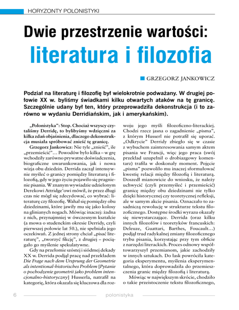 HORYZONTY POLONISTYKI Dwie przestrzenie wartości: literatura i filozofia Grzegorz Jankowicz Podział na literaturę i filozofię był wielokrotnie podważany. W drugiej połowie XX w. byliśmy świadkami kilku otwartych ataków na tę granicę. Szczególnie udany był ten, który przeprowadziła dekonstrukcja (i to zarówno w wydaniu Derridiańskim, jak i amerykańskim). „Polonistyka”: Stop. Chociaż wszyscy czytaliśmy Derridę, to bylibyśmy wdzięczni za kilka zdań objaśnienia, dlaczego dekonstrukcja musiała spróbować znieść tę granicę. Grzegorz Jankowicz: Nie tyle „znieść”, ile „przemieścić”… Powodów było kilka – w grę wchodziły zarówno prywatne doświadczenia, biograficzne uwarunkowania, jak i nowa wizja obu dziedzin. Derrida zaczął intensywnie myśleć o granicy pomiędzy literaturą i filozofią, gdy w jego życiu pojawiło się pragnienie pisania. W znanym wywiadzie udzielonym Derekowi Attridge’owi mówił, że przez długi czas nie mógł się zdecydować, co wybrać: literaturę czy filozofię. Wahał się pomiędzy obu dziedzinami, które jawiły mu się jako kolosy na glinianych nogach. Mówiąc inaczej: żadna z nich, przynajmniej w ówczesnym kształcie (a mowa o studenckim okresie Derridy, czyli pierwszej połowie lat 50.), nie spełniała jego oczekiwań. Z jednej strony chciał „pisać literaturę”, „tworzyć fikcję”, z drugiej – pociągało go myślenie spekulatywne. Gdy na przełomie szóstej i siódmej dekady XX w. Derrida podjął pracę nad przekładem Die Frage nach dem Ursprung der Geometrie als intentional-historisches Problem [Pytanie o pochodzenie geometrii jako problem intencjonalno-historyczny] Husserla, natrafił na kategorię, która okazała się kluczowa dla roz- 6 woju jego myśli filozoficzno-literackiej. Chodzi rzecz jasna o zagadnienie „pisma”, z którym Husserl nie potrafił się uporać. „Odkrycie” Derridy zbiegło się w czasie z wybuchem zainteresowania samym aktem pisania we Francji, więc jego praca (swój przekład uzupełnił o drobiazgowy komentarz) trafiła w doskonały moment. Pojęcie „pisma” pozwoliło mu inaczej sformułować kwestię relacji między filozofią i literaturą. Doszedł mianowicie do wniosku, że należy uchwycić (czyli przemyśleć i przemieścić) granicę między obu dziedzinami nie tylko dzięki historycznej czy teoretycznej refleksji, ale w samym akcie pisania. Oznaczało to zasadniczą rewolucję w strukturze tekstu filozoficznego. Dostępne środki wyrazu okazały się niewystarczające. Derrida (oraz kilku innych filozofów i teoretyków francuskich: Deleuze, Guattari, Barthes, Foucault…) podjął trud radykalnej zmiany filozoficznego trybu pisania, korzystając przy tym obficie z narzędzi literackich. Proces odnowy współtowarzyszył przemianom, jakie zachodziły w innych sztukach. Do łask powróciła kategoria eksperymentu, myślenia eksperymentalnego, która doprowadziła do przemieszczenia granic między filozofią i literaturą. Mówiąc w największym skrócie, chodziło o takie przeistoczenie tekstu filozoficznego, polonistyka HORYZONTY POLONISTYKI które na powrót zszyje sens z powierzchnią języka, zwiąże znaczenie z kształtem mowy. Stąd stylistyczna i pojęciowa inwencja Derridiańskich tekstów. Jego pisarstwo zmierzało – jak ujął to jeden z komentatorów – w stronę coraz mniej linearnych konfiguracji tekstualnych, coraz bardziej ryzykownych form logicznych, topicznych czy typograficznych, w stronę krzyżowania rozmaitych całości, mieszaniny gatunków i trybów. W tej krzyżówce trybów wypowiedzi zmieniało się miejsce granicy między literaturą i filozofią. Trzeba zaznaczyć, że Derrida nigdy nie mówił o całkowitym zniesieniu tej linii demarkacyjnej (choć jego krytycy i niektórzy kontynuatorzy w ten sposób zrozumieli ideę „przemieszczenia”). Zależało mu na nieustannej grze z granicą czy raczej granicami oddzielającymi różne dyskursy, dyscypliny, sposoby mówienia i pisania. Zatem najważniejsze współczesne książki powstają w przestrzeni bez granic… G. J.: Nie, wydaje mi się, że taka przestrzeń nie istnieje, choć może być przez nas nieustannie projektowana. Pytanie tylko, czy tego rodzaju projekt ma sens. Szczególnie interesują mnie książki, które z braku lepszego słowa można by nazwać pogranicznymi. Nie oznacza to, że chciałbym wskrzesić twardą opozycję między filozofią i literaturą, przeciwnie – chcę podkreślić ich ścisły związek z polem literatury, włączyć je do jednej grupy, w obrębie której wiersz lub powieść posiadają filozoficzny czy polityczny wymiar, a tekst teoretyczny nie wypiera się swej literackości. Nie oznacza to, że granice między owymi sferami, dziedzinami i rodzajami wypowiedzi całkowicie znikają. Chodzi raczej o to, że tracą swój esencjalny charakter, dezaktywują się i choć w rozmaitych kontekstach można im przywracać funkcjonalny wymiar, to jednak nie są w pełni szczelne. Czy podejście Derridiańskie jest rzeczywiście pierwszym zanegowaniem tej różnicy, czy znane są również podejścia inne, lub choćby wcześniejsze? G. J.: Istnieje jeszcze inny, nowoczesny i ciągle aktualny sposób przedstawiania relacji między literaturą i filozofią. Chodzi o figurę dwóch nachodzących na siebie konstelacji, z których jedna (literatura) zarysowuje pewien kształt, a druga (filozofia) przechowuje jego sens. Obraz ten znajdujemy (w trochę innej postaci) u Waltera Benjamina, u którego oznacza on bezpośredni wpływ jednej konstelacji na drugą. W podobny sposób – m.in. za sprawą Benjamina – o relacji między obu dziedzinami myśli i pisze Giorgio Agamben. W fascynującym eseju o noweli Melville’a Kopista Bartleby włoski filozof najpierw kreśli przed czytelnikiem literacką konstelację, której częścią jest bohater noweli (należą do niej również m.in. postaci z dzieł Gogola, Kafki i Walsera), a następn