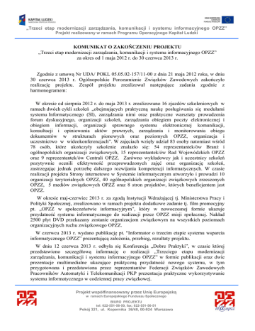 „Trzeci etap modernizacji zarządzania, komunikacji i systemu informacyjnego OPZZ” Projekt realizowany w ramach Programu Operacyjnego Kapitał Ludzki KOMUNIKAT O ZAKOŃCZENIU PROJEKTU „Trzeci etap modernizacji zarządzania, komunikacji i systemu informacyjnego OPZZ” za okres od 1 maja 2012 r. do 30 czerwca 2013 r. Zgodnie z umową Nr UDA/ POKL 05.05.02-157/11-00 z dnia 21 maja 2012 roku, w dniu 30 czerwca 2013 r. Ogólnopolskie Porozumienie Związków Zawodowych zakończyło realizację projektu. Zespół projektu zrealizował następujące zadania zgodnie z harmonogramem: W okresie od sierpnia 2012 r. do maja 2013 r. zrealizowano 16 zjazdów szkoleniowych w ramach dwóch cykli szkoleń „obejmujących praktyczną naukę posługiwania się modułami systemu Informatycznego (SI), zarządzania nimi oraz praktyczne warsztaty prowadzenia forum dyskusyjnego, organizacji szkoleń, zarządzania obiegiem poczty elektronicznej i obiegiem informacji, organizacji sprawnego systemu elektronicznej komunikacji, konsultacji i opiniowania aktów prawnych, zarządzania i monitorowania obiegu dokumentów w strukturach pionowych oraz poziomych OPZZ, organizacja i uczestnictwo w wideokonferencjach”. W zajęciach wzięły udział 83 osoby natomiast wśród 78 osób, które ukończyły szkolenie znalazło się: 54 reprezentantek/ów Branż i ogólnopolskich organizacji związkowych, 15 reprezentantek/ów Rad Wojewódzkich OPZZ oraz 9 reprezentantek/ów Centrali OPZZ. Zarówno wykładowcy jak i uczestnicy szkoleń pozytywnie ocenili efektywność przeprowadzonych zajęć oraz organizację szkoleń, zastrzegając jednak potrzebę dalszego rozwijania kompetencji informatycznych. W czasie realizacji projektu Strony internetowe w Systemie informatycznym utworzyło i prowadzi 10 organizacji terytorialnych OPZZ, 40 ogólnopolskich organizacji związkowych zrzeszonych OPZZ, 5 mediów związkowych OPZZ oraz 8 stron projektów, których beneficjentem jest OPZZ. W okresie maj-czerwiec 2013 r. za zgodą Instytucji Wdrażającej tj. Ministerstwa Pracy i Polityki Społecznej, zrealizowano w ramach projektu dodatkowe zadanie tj. film promocyjny pt. „OPZZ w społeczeństwie informacyjnym”, który w nowoczesnej formie ukazuje przydatność systemu informatycznego do realizacji przez OPZZ misji społecznej. Nakład 2500 płyt DVD przekazany zostanie organizacjom związkowym na wszystkich poziomach organizacyjnych ruchu związkowego OPZZ. W czerwcu 2013 r. wydano publikację pt. "Informator o trzecim etapie systemu wsparcia informatycznego OPZZ” prezentującą założenia, przebieg, rezultaty projektu. W dniu 12 czerwca 2013 r. odbyła się Konferencja „Dobre Praktyki”, w czasie której przedstawiono szczegółową informację o realizacji „Trzeciego etapu modernizacji zarządzania, komunikacji i systemu informacyjnego OPZZ” w formie publikacji oraz dwie prezentacje multimedialne ukazujące praktyczną przydatność nowego systemu, w tym przygotowana i przedstawiona przez reprezentantów Federacji Związków Zawodowych Pracowników Automatyki i Telekomunikacji PKP prezentacja praktyczne wykorzystywanie systemu informatycznego w codziennej pracy związkowej. Projekt współfinansowany przez Unię Europejską w ramach Europejskiego Funduszu Społecznego BIURO PROJEKTU tel: 022-551-56-50, fax: 022-551-56-51 Pokój 321, ul. Kopernika 36/40, 00-924 Warszawa „Trzeci etap modernizacji zarządzania, komunikacji i systemu informacyjnego OPZZ” Projekt realizowany w ramach Programu Operacyjnego Kapitał Ludzki Zgodnie z harmonogramem projektu złożono 4 Wnioski o płatność, wszystkie wydatki zostały uznane za kwalifikowalne. Ostatni, 5 Wniosek o płatność zostanie złożony w Instytucji Wdrażającej – MPiPS do dnia 5 lipca 2013 r. W okresie od 18 do 21 grudnia 2012 r. Instytucja Wdrażająca przeprowadziła kontrolę projektu, wyniki kontroli wykazały, że projekt był realizowany prawidłowo, zalecono niewielkie usprawnienia. Zgodnie z wnioskiem o dofinansowanie osiągnęliśmy wszystkie zakładane cele i rezultaty. Biuro Projektu Projekt współfinansowany przez Unię Europejską w ramach Europejskiego Funduszu Społecznego BIURO PROJEKTU tel: 022-551-56-50, fax: 022-551-56-51 Pokój 321, ul. Kopernika 36/40, 00-924 Warszawa