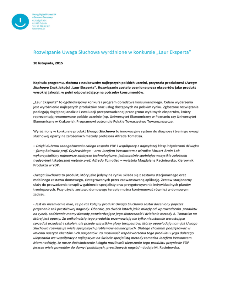 Rozwiązanie Uwaga Słuchowa wyróżnione w konkursie „Laur Eksperta” 10 listopada, 2015 Kapituła programu, złożona z naukowców najlepszych polskich uczelni, przyznała produktowi Uwaga Słuchowa Znak Jakości „Laur Eksperta”. Rozwiązanie zostało ocenione przez ekspertów jako produkt wysokiej jakości, w pełni odpowiadający na potrzeby konsumentów. „Laur Eksperta” to ogólnokrajowy konkurs i program doradztwa konsumenckiego. Celem wydarzenia jest wyróżnienie najlepszych produktów oraz usług dostępnych na polskim rynku. Zgłoszone rozwiązania podlegają dogłębnej analizie i ewaluacji przeprowadzonej przez grono wybitnych ekspertów, którzy reprezentują renomowane polskie uczelnie (np. Uniwersytet Ekonomiczny w Poznaniu czy Uniwersytet Ekonomiczny w Krakowie). Programowi patronuje Polskie Towarzystwo Towaroznawcze. Wyróżniony w konkursie produkt Uwaga Słuchowa to innowacyjny system do diagnozy i treningu uwagi słuchowej oparty na założeniach metody profesora Alfreda Tomatisa. – Dzięki dużemu zaangażowaniu całego zespołu YDP i współpracy z najwyższej klasy inżynierami dźwięku – firmą Baltronic prof. Czyżewskiego – oraz Jozefem Vervoortem z ośrodka Mozart-Brain-Lab wykorzystaliśmy najnowsze zdobycze technologiczne, jednocześnie spełniając wszystkie założenia tradycyjnej i skutecznej metody prof. Alfreda Tomatisa – wyjaśnia Magdalena Raciniewska, Kierownik Produktu w YDP. Uwaga Słuchowa to produkt, który jako jedyny na rynku składa się z zestawu stacjonarnego oraz mobilnego zestawu domowego, zintegrowanych przez zaawansowaną aplikację. Zestaw stacjonarny służy do prowadzenia terapii w gabinecie specjalisty oraz przygotowywania indywidualnych planów treningowych. Przy użyciu zestawu domowego terapię można kontynuować również w domowym zaciszu. - Jest mi niezmiernie miło, że po raz kolejny produkt Uwaga Słuchowa został doceniony poprzez przyznanie tak prestiżowej nagrody. Obecnie, po dwóch latach jakie minęły od wprowadzenia produktu na rynek, codziennie mamy dowody potwierdzające jego skuteczność i działanie metody A. Tomatisa na której jest oparty. Za unikalnością tego produktu przemawiają nie tylko nieustannie wzrastająca sprzedaż urządzeń i szkoleń, ale przede wszystkim głosy terapeutów, którzy opowiadają nam jak Uwaga Słuchowa rozwiązuje wiele specjalnych problemów edukacyjnych. Dlatego chciałam podziękować w imieniu naszych klientów i ich pacjentów za możliwość współtworzenia tego produktu i jego dalszego ulepszania we współpracy z najlepszym na świecie specjalistą metody tomatisa Jozefem Vervoortem. Mam nadzieję, że nasze doświadczenie i ciągła możliwość ulepszania tego produktu przyniesie YDP jeszcze wiele powodów do dumy i podobnych, prestiżowych nagród - dodaje M. Raciniewska.