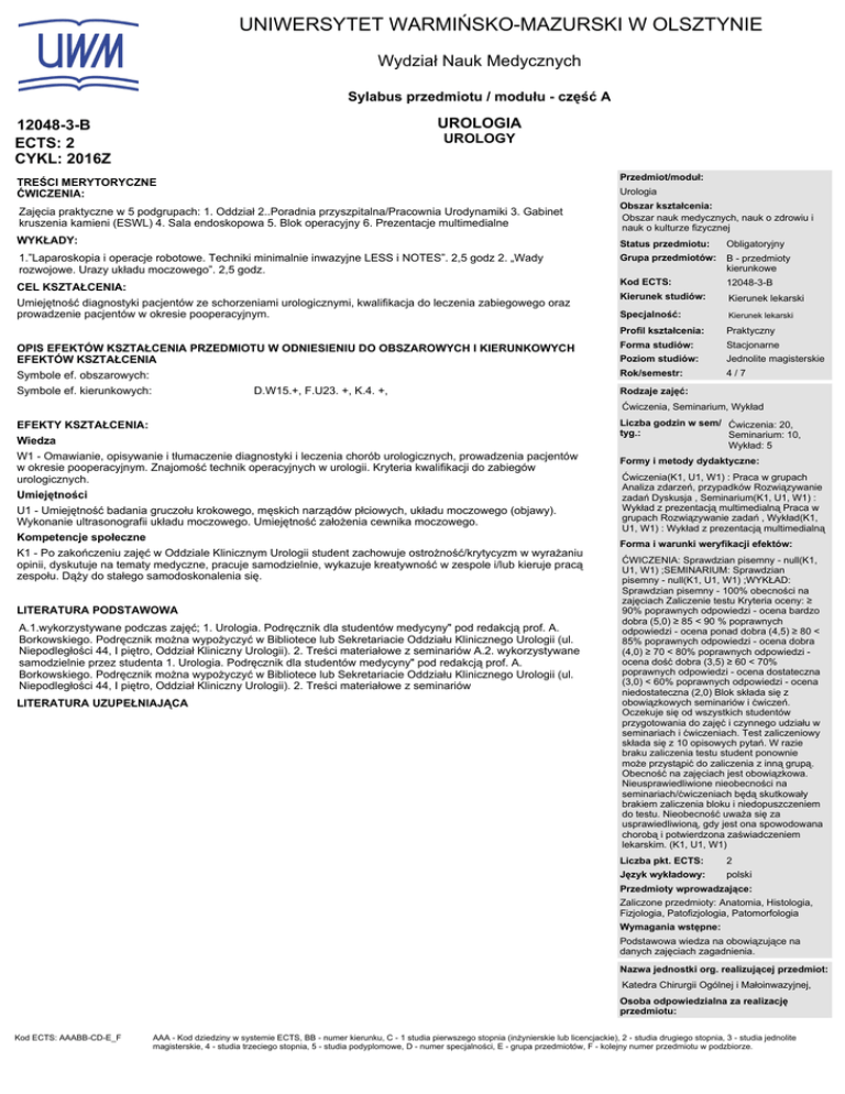 UNIWERSYTET WARMIŃSKO-MAZURSKI W OLSZTYNIE Wydział Nauk Medycznych Sylabus przedmiotu / modułu - część A UROLOGIA 12048-3-B ECTS: 2 CYKL: 2016Z UROLOGY Przedmiot/moduł: TREŚCI MERYTORYCZNE ĆWICZENIA: Urologia Zajęcia praktyczne w 5 podgrupach: 1. Oddział 2..Poradnia przyszpitalna/Pracownia Urodynamiki 3. Gabinet kruszenia kamieni (ESWL) 4. Sala endoskopowa 5. Blok operacyjny 6. Prezentacje multimedialne Obszar kształcenia: Obszar nauk medycznych, nauk o zdrowiu i nauk o kulturze fizycznej WYKŁADY: Status przedmiotu: Obligatoryjny 1.”Laparoskopia i operacje robotowe. Techniki minimalnie inwazyjne LESS i NOTES”. 2,5 godz 2. „Wady rozwojowe. Urazy układu moczowego”. 2,5 godz. Grupa przedmiotów: B - przedmioty kierunkowe CEL KSZTAŁCENIA: Kod ECTS: 12048-3-B Umiejętność diagnostyki pacjentów ze schorzeniami urologicznymi, kwalifikacja do leczenia zabiegowego oraz prowadzenie pacjentów w okresie pooperacyjnym. Kierunek studiów: Kierunek lekarski Specjalność: Kierunek lekarski Profil kształcenia: Praktyczny OPIS EFEKTÓW KSZTAŁCENIA PRZEDMIOTU W ODNIESIENIU DO OBSZAROWYCH I KIERUNKOWYCH EFEKTÓW KSZTAŁCENIA Forma studiów: Stacjonarne Poziom studiów: Jednolite magisterskie Symbole ef. obszarowych: Symbole ef. kierunkowych: Rok/semestr: 4/7 D.W15.+, F.U23. +, K.4. +, Rodzaje zajęć: Ćwiczenia, Seminarium, Wykład Liczba godzin w sem/ Ćwiczenia: 20, tyg.: Seminarium: 10, Wykład: 5 EFEKTY KSZTAŁCENIA: Wiedza W1 - Omawianie, opisywanie i tłumaczenie diagnostyki i leczenia chorób urologicznych, prowadzenia pacjentów w okresie pooperacyjnym. Znajomość technik operacyjnych w urologii. Kryteria kwalifikacji do zabiegów urologicznych. Umiejętności U1 - Umiejętność badania gruczołu krokowego, męskich narządów płciowych, układu moczowego (objawy). Wykonanie ultrasonografii układu moczowego. Umiejętność założenia cewnika moczowego. Kompetencje społeczne K1 - Po zakończeniu zajęć w Oddziale Klinicznym Urologii student zachowuje ostrożność/krytycyzm w wyrażaniu opinii, dyskutuje na tematy medyczne, pracuje samodzielnie, wykazuje kreatywność w zespole i/lub kieruje pracą zespołu. Dąży do stałego samodoskonalenia się. LITERATURA PODSTAWOWA A.1.wykorzystywane podczas zajęć; 1. Urologia. Podręcznik dla studentów medycyny" pod redakcją prof. A. Borkowskiego. Podręcznik można wypożyczyć w Bibliotece lub Sekretariacie Oddziału Klinicznego Urologii (ul. Niepodległości 44, I piętro, Oddział Kliniczny Urologii). 2. Treści materiałowe z seminariów A.2. wykorzystywane samodzielnie przez studenta 1. Urologia. Podręcznik dla studentów medycyny" pod redakcją prof. A. Borkowskiego. Podręcznik można wypożyczyć w Bibliotece lub Sekretariacie Oddziału Klinicznego Urologii (ul. Niepodległości 44, I piętro, Oddział Kliniczny Urologii). 2. Treści materiałowe z seminariów LITERATURA UZUPEŁNIAJĄCA Formy i metody dydaktyczne: Ćwiczenia(K1, U1, W1) : Praca w grupach Analiza zdarzeń, przypadków Rozwiązywanie zadań Dyskusja , Seminarium(K1, U1, W1) : Wykład z prezentacją multimedialną Praca w grupach Rozwiązywanie zadań , Wykład(K1, U1, W1) : Wykład z prezentacją multimedialną Forma i warunki weryfikacji efektów: ĆWICZENIA: Sprawdzian pisemny - null(K1, U1, W1) ;SEMINARIUM: Sprawdzian pisemny - null(K1, U1, W1) ;WYKŁAD: Sprawdzian pisemny - 100% obecności na zajęciach Zaliczenie testu Kryteria oceny: ≥ 90% poprawnych odpowiedzi - ocena bardzo dobra (5,0) ≥ 85 < 90 % poprawnych odpowiedzi - ocena ponad dobra (4,5) ≥ 80 < 85% poprawnych odpowiedzi - ocena dobra (4,0) ≥ 70 < 80% poprawnych odpowiedzi ocena dość dobra (3,5) ≥ 60 < 70% poprawnych odpowiedzi - ocena dostateczna (3,0) < 60% poprawnych odpowiedzi - ocena niedostateczna (2,0) Blok składa się z obowiązkowych seminariów i ćwiczeń. Oczekuje się od wszystkich studentów przygotowania do zajęć i czynnego udziału w seminariach i ćwiczeniach. Test zaliczeniowy składa się z 10 opisowych pytań. W razie braku zaliczenia testu student ponownie może przystąpić do zaliczenia z inną grupą. Obecność na zajęciach jest obowiązkowa. Nieusprawiedliwione nieobecności na seminariach/ćwiczeniach będą skutkowały brakiem zaliczenia bloku i niedopuszczeniem do testu. Nieobecność uważa się za usprawiedliwioną, gdy jest ona spowodowana chorobą i potwierdzona zaświadczeniem lekarskim. (K1, U1, W1) Liczba pkt. ECTS: 2 Język wykładowy: polski Przedmioty wprowadzające: Zaliczone przedmioty: Anatomia, Histologia, Fizjologia, Patofizjologia, Patomorfologia Wymagania wstępne: Podstawowa wiedza na obowiązujące na danych zajęciach zagadnienia. Nazwa jednostki org. realizującej przedmiot: Katedra Chirurgii Ogólnej i Małoinwazyjnej, Osoba odpowiedzialna za realizację przedmiotu: Kod ECTS: AAABB-CD-E_F AAA - Kod dziedziny w systemie ECTS, BB - numer kierunku, C - 1 studia pierwszego stopnia (inżynierskie lub licencjackie), 2 - studia drugiego stopnia, 3 - studia jednolite magisterskie, 4 - studia trzeciego stopnia, 5 - studia podyplomowe, D - numer specjalności, E - grupa przedmiotów, F - kolejny numer przedmiotu w podzbiorze. dr hab. n. med. MAREK ROSLAN, prof. UWM Osoby prowadzące przedmiot: dr hab. n. med. MAREK ROSLAN, prof. UWM, dr med. Zbigniew Purpurowicz, , lek. med. Zbigniew Kantyka, , lek. Maciej Kuskowski, , lek. med. Maciej Przudzik, , lek. Marcin Kochanowicz, , lek. Robert Liss, , lek. med. Mirosław Łesiów, , lek. med. Michał Borowik, Uwagi dodatkowe: Seminaria 1. "Diagnostyka urologiczna; BPH" 2 godz. 2. "Kamica moczowa, zaburzenia erekcji" 2 godz. 3. "Uroonkologia" 2 godz. 4. "Stany nagłe w urologii, zakażenia układu moczowego" 2 godz. 5. "Uroginekologia. Zaliczenie" 2 godz. Kod ECTS: AAABB-CD-E_F AAA - Kod dziedziny w systemie ECTS, BB - numer kierunku, C - 1 studia pierwszego stopnia (inżynierskie lub licencjackie), 2 - studia drugiego stopnia, 3 - studia jednolite magisterskie, 4 - studia trzeciego 