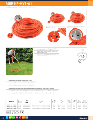MER KF-HY3-01 Przedłużacz uniwersalny • Prodlužovací šňůra • Predlžovacia šnúra MER KF-HY3-01 30M MER KF-HY3-01 40M MER KF-HY3-01 20M osłona przewodu, wtyczka, gniazdo: PVC / przewód: miedź l=20m l=30m l=40m materiál šňůry, vidlice, spojovací zásuvky: PVC / materiál žil šňůry: měď materiál šnúry, vidlice, spojovacie zásuvky: PVC / materiál žil šnúry: med´ przeznaczone do urządzeń elektrycznych klasy II przedłużacze uniwersalne serii MER niedostępne dla klientów Kanlux Czechy i Kanlux Słowacja prodlužovací šňůra určená pro el. zařízení třídy izolace II predlžovací šnúra určená pre el. zariadenie triedy izolácie II univerzální prodlužovací šňůry série MER nejsou určeny pro zákazníky Kanlux s.r.o. v Čechách a na Slovensku univerzálne predlžovacie šnúy série MER nie sú určené pre zákazníkov Kanlux s.r.o. Čechy a Slovensko CENA NETTO MER KF-HY3-01 20M 04400 5905339044006 pomarańczowy / oranžová / oranžová 2500 20m, 2 x 1mm 1/-/12 1540 46,99 zł 57,80 zł MER KF-HY3-01 30M 04401 5905339044013 pomarańczowy / oranžová / oranžová 1600 30m, 2 x 1mm 1/-/8 2300 68,22 zł 83,91 zł MER KF-HY3-01 40M 04402 5905339044020 pomarańczowy / oranžová / oranžová 1200 40m, 2 x 1mm 1/-/8 3000 87,92 zł 108,14 zł 20 412 CENA BRUTTO