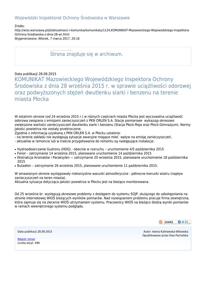 Wojewódzki Inspektorat Ochrony Środowiska w Warszawie Źródło: http://wios.warszawa.pl/pl/aktualnosci-i-komunika/komunikaty/1124,KOMUNIKAT-Mazowieckiego-Wojewodzkiego-InspektoraOchrony-Srodowiska-z-dnia-28-wr.html Wygenerowano: Wtorek, 7 marca 2017, 20:16 Strona znajduje się w archiwum. Data publikacji 28.09.2015 KOMUNIKAT Mazowieckiego Wojewódzkiego Inspektora Ochrony Środowiska z dnia 28 września 2015 r. w sprawie uciążliwości odorowej oraz podwyższonych stężeń dwutlenku siarki i benzenu na terenie miasta Płocka W ostatnim okresie (od 24 września 2015 r.) w różnych częściach miasta Płocka jest wyczuwalna uciążliwość odorowa związana z emisjami zanieczyszczeń z PKN ORLEN S.A. Stacje pomiarowe wykazują okresowo zwiększone wartości zanieczyszczeń dwutlenku siarki i benzenu (Stacja Płock-Reja oraz Płock-Gimnazjum). Normy jakości powietrza nie zostały przekroczone. Zgodnie z informacją uzyskaną z PKN ORLEN S.A. w Płocku ustalono: - na terenie zakładu nie występują sytuacje awaryjne mogące mieć wpływ na emisję zanieczyszczeń, - aktualnie w remoncie lub w trakcie przygotowania do remontu są następujące instalacje: ● ● ● ● Hydroodsiarczanie Gudronu (HOG) - obecnie w rozruchu – uruchomienie 4/5 października 2015 Fenol – zatrzymanie 14 września 2015, planowane uruchomienie 14 października 2015 Ekstrakcja Aromatów i Paraksylen -– zatrzymanie 20 września 2015, planowane uruchomienie 18 października 2015 Butadien – zatrzymanie 26 września 2015, planowane uruchomienie 11 października 2015. W omawianym okresie występowały niekorzystne warunki atmosferyczne - północne kierunki wiatru (napływ zanieczyszczeń na teren miasta). Aktualna sytuacja dotycząca jakości powietrza w Płocku jest na bieżąco monitorowana. Od 25 września br. występują okresowe problemy z dostępem do systemu SOJP, służącego do udostępniania na stronie internetowej WIOŚ bieżących wyników pomiarów. Nad rozwiązaniem problemu pracuje firma zewnętrzna, która zajmuje się na zlecenie WIOŚ utrzymaniem systemu. Pracownicy WIOŚ na bieżąco śledzą wyniki pomiarów w ramach wewnętrznego systemu podglądu. Data publikacji 28.09.2015 Rejestr zmian Liczba wizyt: 496 Autor: Iwona Kalinowska-Witowska Opublikowane przez Ewa Pacholska