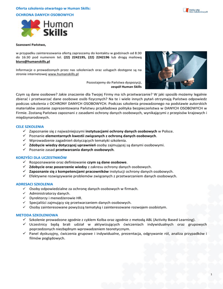 Oferta szkolenia otwartego w Human Skills: OCHRONA DANYCH