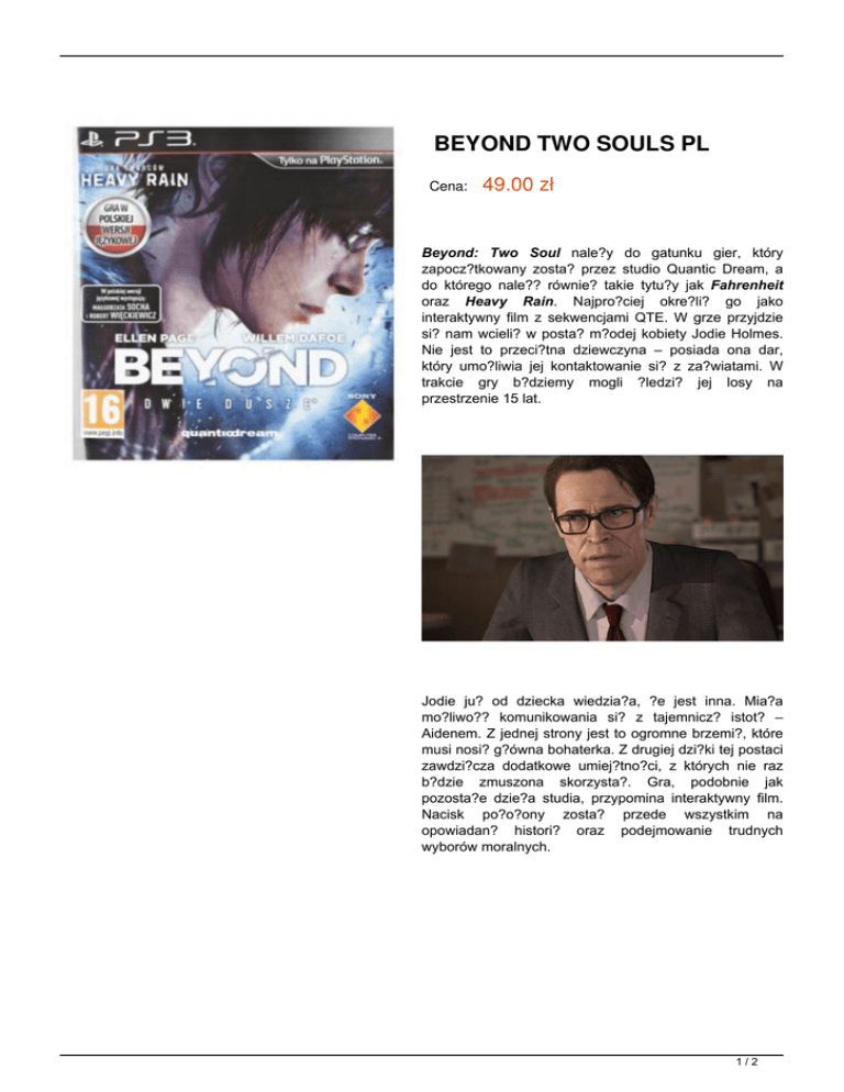 BEYOND TWO SOULS PL Cena: 49.00 zł Beyond: Two Soul nale?y do gatunku gier, który zapocz?tkowany zosta? przez studio Quantic Dream, a do którego nale?? równie? takie tytu?y jak Fahrenheit oraz Heavy Rain. Najpro?ciej okre?li? go jako interaktywny film z sekwencjami QTE. W grze przyjdzie si? nam wcieli? w posta? m?odej kobiety Jodie Holmes. Nie jest to przeci?tna dziewczyna – posiada ona dar, który umo?liwia jej kontaktowanie si? z za?wiatami. W trakcie gry b?dziemy mogli ?ledzi? jej losy na przestrzenie 15 lat. Jodie ju? od dziecka wiedzia?a, ?e jest inna. Mia?a mo?liwo?? komunikowania si? z tajemnicz? istot? – Aidenem. Z jednej strony jest to ogromne brzemi?, które musi nosi? g?ówna bohaterka. Z drugiej dzi?ki tej postaci zawdzi?cza dodatkowe umiej?tno?ci, z których nie raz b?dzie zmuszona skorzysta?. Gra, podobnie jak pozosta?e dzie?a studia, przypomina interaktywny film. Nacisk po?o?ony zosta? przede wszystkim na opowiadan? histori? oraz podejmowanie trudnych wyborów moralnych. 1/2 Mechanika gry pozwala nam na kierowanie poczynaniami a? dwóch bohaterów – Jodie Homles oraz Aidenem. Sterowanie postaciami jest mocno uproszczone, a ze wzgl?du na budow? produkcji nie mamy mo?liwo?ci zgini?cia. Dlatego gra b?dzie odpowiednia równie? dla osób, które nie maj? na co dzie? do czynienia z bardziej zaawansowanymi grami. Pod wzgl?dem wizualnym gra prezentuje si? bardzo dobrze, szczególnie pod wzgl?dem animacji oraz mimiki twarzy. Wizerunki postaci oraz ich g?osy zosta?y u?yczone przez prawdziwych aktorów m.in. Ellen Page oraz Willema Daefoe. Zobacz wideo: 2/2 Powered by TCPDF (www.tcpdf.org)