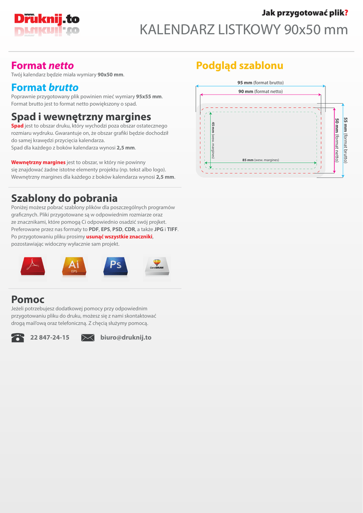 Jak przygotować plik? KALENDARZ LISTKOWY 90x50 mm Format netto Twój kalendarz będzie miała wymiary 90x50 mm. Podgląd szablonu 95 mm (format brutto) Format brutto 90 mm (format netto) Poprawnie przygotowany plik powinien mieć wymiary 95x55 mm. Format brutto jest to format netto powiększony o spad. Szablony do pobrania Poniżej możesz pobrać szablony plików dla poszczególnych programów graficznych. Pliki przygotowane są w odpowiednim rozmiarze oraz ze znacznikami, które pomogą Ci odpowiednio osadzić swój projket. Preferowane przez nas formaty to PDF, EPS, PSD, CDR, a także JPG i TIFF. Po przygotowaniu pliku prosimy usunąć wszystkie znaczniki, pozostawiając widoczny wyłacznie sam projekt. Pomoc Jeżeli potrzebujesz dodatkowej pomocy przy odpowiednim przygotowaniu pliku do druku, możesz się z nami skontaktować drogą mail’ową oraz telefoniczną. Z chęcią służymy pomocą. 22 847-24-15 [email protected] 85 mm (wew. margines) 55 mm (format brutto) Wewnętrzny margines jest to obszar, w który nie powinny się znajdować żadne istotne elementy projektu (np. tekst albo logo). Wewnętrzny margines dla każdego z boków kalendarza wynosi 2,5 mm. 50 mm (format netto) Spad jest to obszar druku, który wychodzi poza obszar ostatecznego rozmiaru wydruku. Gwarantuje on, że obszar grafiki będzie dochodził do samej krawędzi przycięcia kalendarza. Spad dla każdego z boków kalendarza wynosi 2,5 mm. 45 mm (wew. margines) Spad i wewnętrzny margines