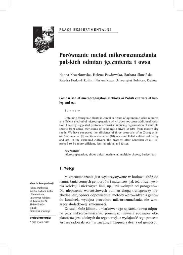 PRACE EKSPERYMENTALNE Porównanie metod mikrorozmna¿ania polskich odmian jêczmienia i owsa Hanna Kruczkowska, Helena Paw³owska, Barbara Skuciñska Katedra Hodowli Roœlin i Nasiennictwa, Uniwersytet Rolniczy, Kraków Comparison of micropropagation methods in Polish cultivars of barley and oat Summary Obtaining transgenic plants in cereal cultivars of agronomic value requires an efficient method of micropropagation which does not cause additional variation. Recently suggested protocols consist in inducing regeneration of multiple shoots from apical meristems of seedlings derived in vitro from mature dry seeds. We have compared the efficiency of three protocols: after Zhang et al. (4), Sharma et al. (8) and Ganeshan et al. (10) in several Polish cultivars of barley and oat. In the examined cultivars, the protocol after Ganeshan et al. (10) proved to be more efficient, less laborious and faster. Key words: micropropagation, shoot apical meristems, multiple shoots, barley, oat. 1. Wstêp Adres do korespondencji Helena Paw³owska, Katedra Hodowli Roœlin i Nasiennictwa, Uniwersytet Rolniczy, ul. £obzowska 24, 31-140 Kraków; e-mail: [email protected] 2 (89) 83–88 2010 Mikrorozmna¿anie jest wykorzystywane w hodowli zbó¿ do namna¿ania cennych genotypów i mutantów, jak te¿ utrzymywania kolekcji i niektórych linii, np. linii wolnych od patogenów. Dla ulepszenia wartoœciowych odmian drog¹ transgenezy niezbêdna jest, oprócz odpowiedniej metody wprowadzania genów do komórek, wydajna procedura mikrorozmna¿ania, nie wnosz¹ca dodatkowej zmiennoœci. Gatunki zbó¿ klimatu umiarkowanego s¹ stosunkowo odporne przy mikrorozmna¿aniu, poniewa¿ niewiele rodzajów eksplantatów jest zdolnych do regeneracji, a wydajnoœæ tego procesu jest niezadowalaj¹ca i w znacznym stopniu zale¿na od genotypu. Hanna Kruczkowska, Helena Paw³owska, Barbara Skuciñska Pocz¹tkowo za najlepsze uznano eksplantaty z niedojrza³ych tkanek i organów, najczêœciej niedojrza³ych zarodków, które w kulturze kalusowa³y i z kalusa powstawa³y pêdy przybyszowe lub zarodki somatyczne (1). Te metody wymaga³y uprawy roœlin matecznych, a poœrednictwo kalusa nios³o niebezpieczeñstwo zmiennoœci genetycznej, albinizmu i obni¿onej p³odnoœci. W kilku pracach wskazano równie¿ na mo¿liwoœæ bezpoœredniej indukcji zarodków somatycznych na fragmentach tarczek zarodkowych (2,3). W ostatnich latach opracowano metody mikrorozmna¿ania zbó¿ z wykorzystaniem dojrza³ych suchych ziarniaków. Merystemy wierzcho³kowe siewek uzyskanych w kulturze s¹ zdolne do namno¿enia pêdów bez kalusa. Ten sposób regeneracji jest mniej zale¿ny od genotypu i zdecydowanie ogranicza niebezpieczeñstwo wystêpowania niepo¿¹danej zmiennoœci somaklonalnej. Komórki merystemu wierzcho³kowego mog¹ byæ obiektem transformacji, np. metod¹ mikrowstrzeliwania, a nastêpnie po namno¿eniu s¹ zdolne do regeneracji transformantów bez poœrednictwa kalusa. Suche nasiona s¹ dostêpne przez ca³y rok, a tok prac technicznych jest ³atwiejszy (4-10). Celem pracy by³o porównanie przydatnoœci trzech procedur – wg Zhang i wsp. (4), wg Sharma i wsp. (8) i Ganeshan i wsp. (10) – do mikrorozmna¿ania kilku polskich odmian jêczmienia i owsa. Zgodnie z nasz¹ wiedz¹ nie stosowano dot¹d u owsa procedury wg Sharma i wsp. (8,9). 2. Materia³ i metody Do doœwiadczenia wziêto dojrza³e suche ziarniaki jêczmienia browarnego odmian Basza i Stratus oraz owsa odmian Chwat (tylko w doœwiadczeniu wstêpnym), Bohun i Szakal. Nasiona otrzymano od hodowców tych odmian i przechowywano je w temperaturze 4°C. W doœwiadczeniu wstêpnym porównano dwie procedury oznaczone jako Z i S, tj. wg Zhang i wsp. (4) oraz Sharma i wsp. (8), a w doœwiadczeniu g³ównym – procedury S i G, tj. wg Sharma i wsp. (8) oraz Ganeshan i wsp. (10). Ziarniaki dezynfekowano w nierozcieñczonym Domestosie przez 45 min, p³ukano w sterylnej wodzie, izolowano zarodki i wyk³adano na odpowiednie po¿ywki w celu uzyskania siewek. Eksplantatami by³y wierzcho³ki pêdów siewek. Sk³ad po¿ywek podstawowych dla badanych metod jest podobny, ró¿nice dotycz¹ g³ównie zastosowania regulatorów wzrostu, tj. 2,4-D (kwas 2,4-dichloro-fenoksyoctowy), BAP (6-benzylaminopuryna), picloramu (kwas 4-amino-3,5,6-trichloropikolinowy), TDZ (tidiazuron). Zgodnie z procedurami Z i G, przez ca³y okres kultury utrzymywano ten sam poziom regulatorów: Z – 0,5 mg/l 2,4-D + 2 mg/l BAP, G – 1 mg/l TDZ dla jêczmienia (po¿ywka MBT1) i 1 mg/l TDZ + 1 mg/l BAP dla owsa (po¿ywka T1B1). W procedurze S po¿ywka indukuj¹ca charakteryzuje siê wysokim poziomem regulatorów (po¿ywka MPT: 2 mg/l picloramu + 3 mg/l TDZ), który w dalszych etapach 84 PRACE EKSPERYMENTALNE Porównanie metod mikrorozmna¿ania polskich odmian jêczmienia i owsa kultury obni¿a siê: w po¿ywce mno¿¹cej MPT1 – 2 mg/l picloramu + 2,5 mg/l TDZ, w po¿ywce wyd³u¿aj¹cej pêdy MPT2 – 0,1 mg/l picloramu + 1 mg/l TDZ. U owsa w kombinacji S pasa¿ mno¿¹cy (po¿ywka MPT1) i pasa¿ wyd³u¿aj¹cy pêdy (po¿ywka MPT2) przeprowadzono w trzech wersjach: S1 – 1x pasa¿ mno¿¹cy + 1x pasa¿ wyd³u¿aj¹cy (zgodnie ze schematem podanym przez autorów metody); S2 – 2x pasa¿ mno¿¹cy + 1x pasa¿ wyd³u¿aj¹cy; S3 – 1x pasa¿ mno¿¹cy + 2x pasa¿ wyd³u¿aj¹cy. Dla ka¿dej odmiany i metody wy³o¿ono po 250 zarodków na 10 p³ytek Petriego (9 cm). Eliminowano p³ytki z zaka¿eniami oraz takie, na których ¿aden eksplantat nie podj¹³ regeneracji pêdów. Pêdy ukorzeniano na po¿ywkach zaleconych przez autorów metod. Kulturê prowadzono w ci¹gu 10-11 tyg. + 2-4 tyg. przeznaczone na ukorzenianie. Dla danych przedstawionych w tabelach 2-4 przeprowadzono analizê zmiennoœci i wyznaczono LSD przy P = 0,05. 3. Wyniki i dyskusja W doœwiadczeniu wstêpnym wydajnoœæ procedur Z i S, wyra¿ona œredni¹ liczb¹ pêdów uzyskanych z jednego eksplantatu, nie ró¿ni³a siê istotnie (danych nie przedsta