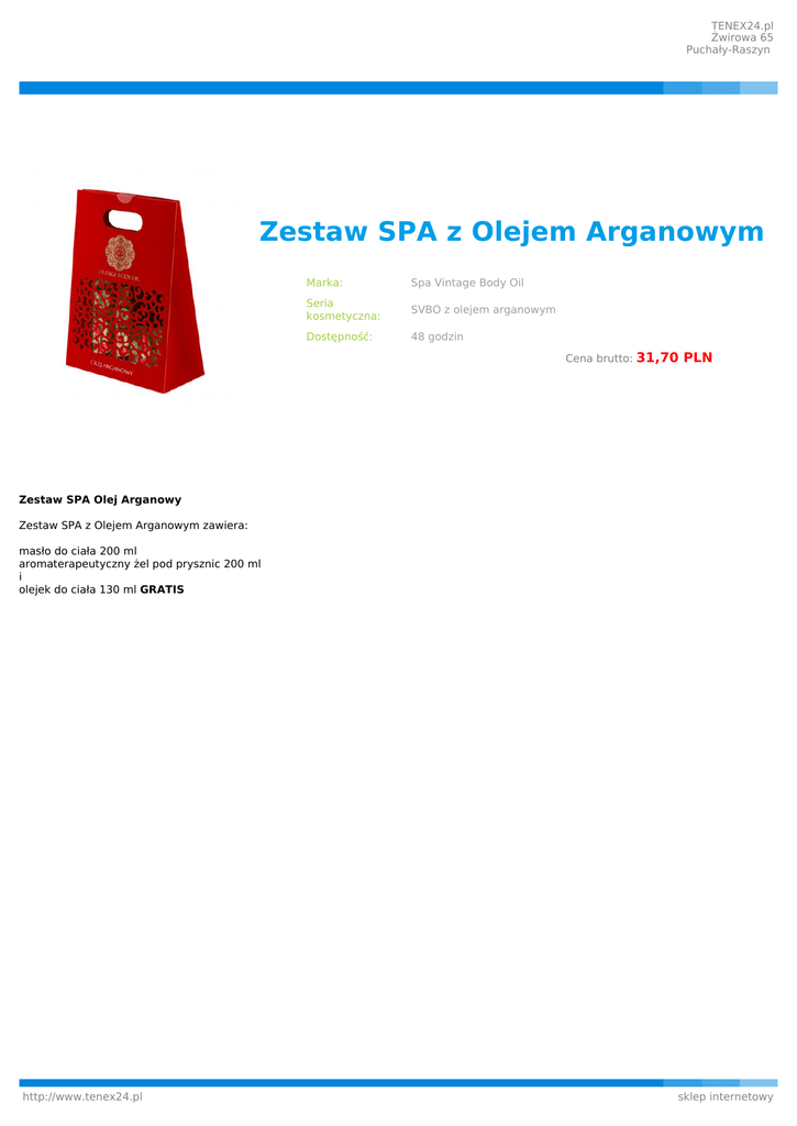 TENEX24.pl Żwirowa 65 Puchały-Raszyn Zestaw SPA z Olejem Arganowym Marka: Spa Vintage Body Oil Seria kosmetyczna: SVBO z olejem arganowym Dostępność: 48 godzin Cena brutto: 31,70 PLN Zestaw SPA Olej Arganowy Zestaw SPA z Olejem Arganowym zawiera: masło do ciała 200 ml aromaterapeutyczny żel pod prysznic 200 ml i olejek do ciała 130 ml GRATIS http://www.tenex24.pl sklep internetowy