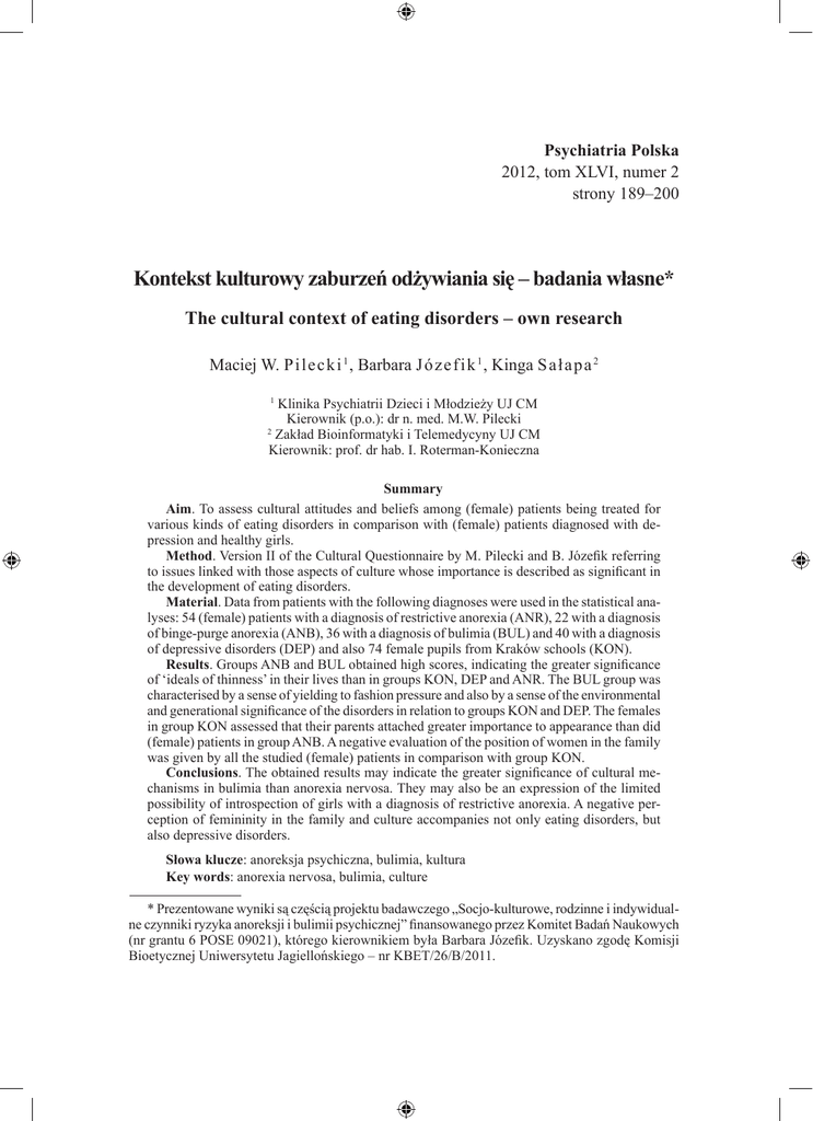 Psychiatria Polska 2012, tom XLVI, numer 2 strony 189–200 Kontekst kulturowy zaburzeń odżywiania się – badania własne* The cultural context of eating disorders – own research Maciej W. Pilecki 1 , Barbara J ó z e f i k 1 , Kinga S a ł a p a 2 Klinika Psychiatrii Dzieci i Młodzieży UJ CM Kierownik (p.o.): dr n. med. M.w. Pilecki 2 Zakład Bioinformatyki i Telemedycyny UJ CM Kierownik: prof. dr hab. I. Roterman-Konieczna 1 Summary Aim. To assess cultural attitudes and beliefs among (female) patients being treated for various kinds of eating disorders in comparison with (female) patients diagnosed with depression and healthy girls. Method. Version II of the Cultural Questionnaire by M. Pilecki and B. Józefik referring to issues linked with those aspects of culture whose importance is described as significant in the development of eating disorders. Material. Data from patients with the following diagnoses were used in the statistical analyses: 54 (female) patients with a diagnosis of restrictive anorexia (ANR), 22 with a diagnosis of binge-purge anorexia (ANB), 36 with a diagnosis of bulimia (BUL) and 40 with a diagnosis of depressive disorders (DEP) and also 74 female pupils from Kraków schools (KON). Results. Groups ANB and BUL obtained high scores, indicating the greater significance of ‘ideals of thinness’ in their lives than in groups KON, DEP and ANR. The BUL group was characterised by a sense of yielding to fashion pressure and also by a sense of the environmental and generational significance of the disorders in relation to groups KON and DEP. The females in group KON assessed that their parents attached greater importance to appearance than did (female) patients in group ANB. A negative evaluation of the position of women in the family was given by all the studied (female) patients in comparison with group KON. Conclusions. The obtained results may indicate the greater significance of cultural mechanisms in bulimia than anorexia nervosa. They may also be an expression of the limited possibility of introspection of girls with a diagnosis of restrictive anorexia. A negative perception of femininity in the family and culture accompanies not only eating disorders, but also depressive disorders. Słowa klucze: anoreksja psychiczna, bulimia, kultura Key words: anorexia nervosa, bulimia, culture * Prezentowane wyniki są częścią projektu badawczego „Socjo-kulturowe, rodzinne i indywidualne czynniki ryzyka anoreksji i bulimii psychicznej” finansowanego przez Komitet Badań Naukowych (nr grantu 6 POSE 09021), którego kierownikiem była Barbara Józefik. Uzyskano zgodę Komisji Bioetycznej Uniwersytetu Jagiellońskiego – nr KBET/26/B/2011. 190 Maciej W. Pilecki i wsp. Wstęp Zaburzenia odżywiania się uważane są powszechnie, choć nie bez kontrowersji, za jednostki kliniczne w istotny sposób powiązane ze światem kultury zachodniej. Danym o częstszym rozpowszechnieniu anoreksji i bulimii psychicznej wśród kobiet z kręgu kultury zachodniej lub też narastaniu częstości w krajach przechodzących, tak jak Polska, proces westernizacji, towarzyszą wysiłki zmierzające do zrozumienia powiązań, jakie występują pomiędzy kulturą świata zachodniego a rozwojem zaburzeń odżywiania się [1 – 5]. Jeden z istotnych obszarów zainteresowań w tym względzie dotyczy współczesnych wzorów kobiecości. Jako dwa najważniejsze kulturowe czynniki ryzyka rozwoju zaburzeń odżywiania się opisywane są: znaczenie chudości oraz wzrastające i sprzeczne wymagania w stosunku do młodych kobiet we współczesnej, konsumpcjonistycznej i nakierowanej na indywidualny sukces kulturze zachodniej. Szczupłość, zakładająca kontrolę nad jedzeniem, stała się synonimem silnej woli, perfekcjonizmu, sukcesu i atrakcyjności. Z tej perspektywy kobiety w podwójny sposób narażone są na rozwój zaburzeń odżywiania się. Ich ciała są obiektem zarówno dominacji estetycznej, jak i ekonomicznej [6, 7]. Innym istotnym elementem kultury zachodniej są zjawiska socjologiczne dotyczące rodziny. Szybkie zmiany społeczne i charakterystyczna dla kultury zachodniej fragmentacja rodzin skutkować może też zaburzeniami relacji transgeneracyjnych czy niejasnością ról psychospołecznych [6]. Podobne zjawiska obserwowane mogą być w Polsce w okresie ostatnich 20 lat dynamicznych zmian warunków społecznych oraz rodzinnych [8, 9]. W rozważaniach nad kulturą, w zaburzeniach odżywiania się istotne staje się pytanie: w oparciu o jakie kanały wpływu kultura oddziałuje na jednostki? Wymieniane są tu trzy powiązane ze sobą ścieżki wpływu: przekaz medialny, przekaz rodzinny oraz wpływ grupy rówieśniczej [10 – 14]. Niektórzy autorzy podkreślają podobieństwo pomiędzy jadłowstrętem psychicznym a średniowiecznymi postami i umartwianiem ciała [15]. W tym ujęciu klasyczna zachodniokulturowa percepcja ciała jako wymagającego kontroli (np. przez dietę, ćwiczenia) niezależnego od nas tworu, wydaje się odległym echem ukształtowanej w dialogu z gnostycyzmem chrześcijańskiej pośledniości ciała względem duszy [16]. Pojawia się pytanie – na ile w społeczeństwie polskim, w którym wywodząca się z tego nurtu religijność jest tak obecna i silna, oba powyższe konstrukty przeżywania ciała sąsiadują ze sobą w warstwie poznawczej, a na ile się wykluczają. Zaburzenia odżywiania się stają się też oddzielnym aspektem kultury masowej, zyskując własne niezależne znaczenie kulturotwórcze pod postacią internetowych zjawisk: Thinspiration, Pro-ana, Mia. Przestają być one postrzegane jako zaburzenia, stają się wyrazem osobistej transgresji, autokreacji wspieranej przez inne uczestniczki owych ruchów [17, 18, 19]. Można zastanawiać się, na ile istotnym czynnikiem ryzyka rozwoju anoreksji i bulimii psychicznej, a przynajmniej negatywnym czynnikiem rokowniczym, są kulturowe przekonania i skrypty dotyczące obu zaburzeń. Zjawiska te