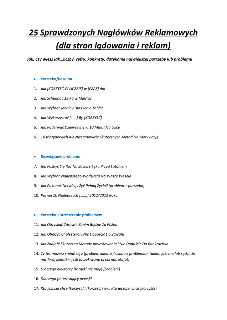 25 Sprawdzonych Nagłówków Reklamowych (dla stron lądowania i reklam) Jak, Czy wiesz jak…liczby, cyfry, konkrety, dotykanie największej potrzeby lub problemu Potrzeba/Rezultat 1. Jak [KORZYŚĆ W LICZBIE] w [CZAS] dni 2. Jak Schudnąć 18 Kg w Miesiąc 3. Jak Wybrać Idealny Dla Ciebie Tablet 4. Jak Wykorzystać [……] By [KORZYŚĆ] 5. Jak Poderwać Dziewczynę w 10 Minut Na Ulicy 6. 10 Nietypowych Ale Niesamowicie Skutecznych Metod Na Motywację Rozwiązanie problemu 7. Jak Pozbyć Się Raz Na Zawsze Lęku Przed Lataniem 8. Jak Wybrać Najlepszego Wodzireja Na Wasze Wesele 9. Jak Pokonać Nerwicę i Żyć Pełnią Życia? (problem + potrzeba) 10. Poznaj 10 Najlepszych […….] 2012/2013 Roku. Potrzeba + streszczenie problemem 11. Jak Odzyskać Zdrowie Zanim Będzie Za Późno 12. Jak Obniżyć Cholesterol i Nie Dopuścić Do Zawału 13. Jak Znaleźć Skuteczną Metodę Inwestowania i Nie Dopuścić Do Bankructwa 14. Ty też możesz śmiać się z [problem klienta / osoba z problemem takim, jaki ma lub sądzi, że ma Twój klient] -- jeśli [oczekiwana przez nas akcja]. 15. Dlaczego niektórzy [target] nie mają [problem] 16. Dlaczego [interesujący news]? 17. Kto jeszcze chce [korzyść] i [korzyść]? ew. Kto jeszcze chce [korzyść]? 18. Śmiali się, gdy [akcja, której ludzie mogą nie zrozumieć]... ale gdy [korzyść]! 19. Jak [korzyść] i [korzyść]? 20. Czego nie mówi Ci Twój [ktoś zaufany dla klienta] o [problem]? 21. Sekret by [korzyść] 22. Czy wiesz jak [korzyść]? 23. Mały [produkt lub słowo "wydatek"], który [korzyść wyrażona miarą, np. w złotówkach, godzinach itd.] 24. Rada dla [target], którzy [problem] 25. Czy popełniasz te [ile] błedów w [czynności związanej z Twoim produktem]? Bonus: Dla Zaawansowanych - Ciekawość +Streszczenie problemem/czynnikiem zewnętrznym + Ograniczenie Czasowe Np.: Poznaj Te 10 Bardzo Nietypowych Metod Na Ochronę Kapitału Zanim Zbankrutujesz Poznaj Te 3 Bardzo Nietypowe Metody Rzucenia Palenia Zanim Dopadnie Cię Rak Baw się dobrze! Artur Wiktor Nieodłącznym elementem budowania solidnego biznesu, jest budowa wizerunku. To właśnie wizerunek dał mi wielki efekt biznesowy. Dzięki temu jestem rozpoznawalny w Interncie. Konkretne narzędzia wizerunkowe i biznesowe daje mi firma Servaq. To właśnie dzięki nim zbudowałem efektywną podstawę biznesu online. Skorzystaj z darmowej możliwości działania w Servaq. Kliknij Tutaj >>>
