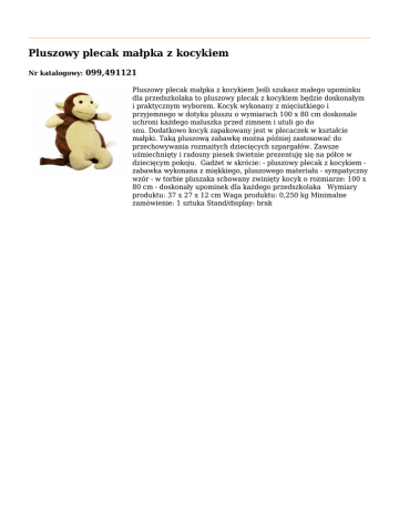 Pluszowy plecak małpka z kocykiem Nr katalogowy: 099,491121 Pluszowy plecak małpka z kocykiem Jeśli szukasz małego upominku dla przedszkolaka to pluszowy plecak z kocykiem będzie doskonałym i praktycznym wyborem. Kocyk wykonany z mięciutkiego i przyjemnego w dotyku pluszu o wymiarach 100 x 80 cm doskonale uchroni każdego maluszka przed zimnem i utuli go do snu. Dodatkowo kocyk zapakowany jest w plecaczek w kształcie małpki. Taką pluszową zabawkę można później zastosować do przechowywania rozmaitych dziecięcych szpargałów. Zawsze uśmiechnięty i radosny piesek świetnie prezentuję się na półce w dziecięcym pokoju. Gadżet w skrócie: - pluszowy plecak z kocykiem zabawka wykonana z miękkiego, pluszowego materiału - sympatyczny wzór - w torbie pluszaka schowany zwinięty kocyk o rozmiarze: 100 x 80 cm - doskonały upominek dla każdego przedszkolaka Wymiary produktu: 37 x 27 x 12 cm Waga produktu: 0,250 kg Minimalne zamówienie: 1 sztuka Stand/display: brak