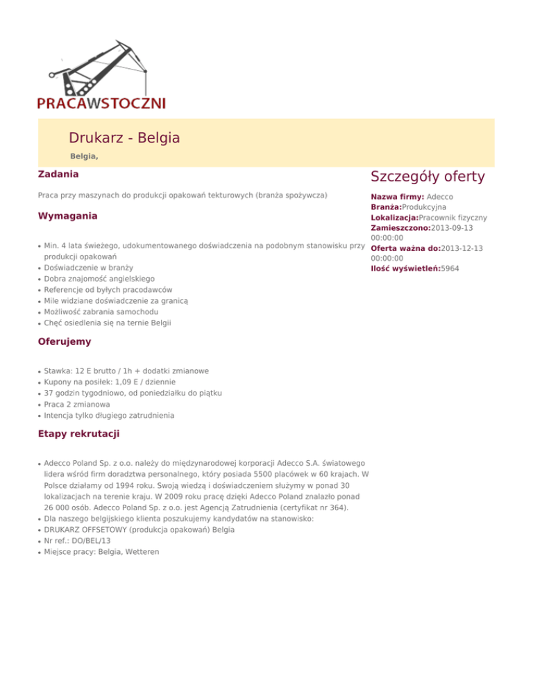 Drukarz - Belgia Belgia, Zadania Praca przy maszynach do produkcji opakowań tekturowych (branża spożywcza) Szczegóły oferty Nazwa firmy: Adecco Branża:Produkcyjna Wymagania Lokalizacja:Pracownik fizyczny Zamieszczono:2013-09-13 00:00:00 Min. 4 lata świeżego, udokumentowanego doświadczenia na podobnym stanowisku przy Oferta ważna do:2013-12-13 produkcji opakowań 00:00:00 Doświadczenie w branży Ilość wyświetleń:5964 Dobra znajomość angielskiego Referencje od byłych pracodawców Mile widziane doświadczenie za granicą Możliwość zabrania samochodu Chęć osiedlenia się na ternie Belgii ● ● ● ● ● ● ● Oferujemy ● ● ● ● ● Stawka: 12 E brutto / 1h + dodatki zmianowe Kupony na posiłek: 1,09 E / dziennie 37 godzin tygodniowo, od poniedziałku do piątku Praca 2 zmianowa Intencja tylko długiego zatrudnienia Etapy rekrutacji ● ● ● ● ● Adecco Poland Sp. z o.o. należy do międzynarodowej korporacji Adecco S.A. światowego lidera wśród firm doradztwa personalnego, który posiada 5500 placówek w 60 krajach. W Polsce działamy od 1994 roku. Swoją wiedzą i doświadczeniem służymy w ponad 30 lokalizacjach na terenie kraju. W 2009 roku pracę dzięki Adecco Poland znalazło ponad 26 000 osób. Adecco Poland Sp. z o.o. jest Agencją Zatrudnienia (certyfikat nr 364). Dla naszego belgijskiego klienta poszukujemy kandydatów na stanowisko: DRUKARZ OFFSETOWY (produkcja opakowań) Belgia Nr ref.: DO/BEL/13 Miejsce pracy: Belgia, Wetteren