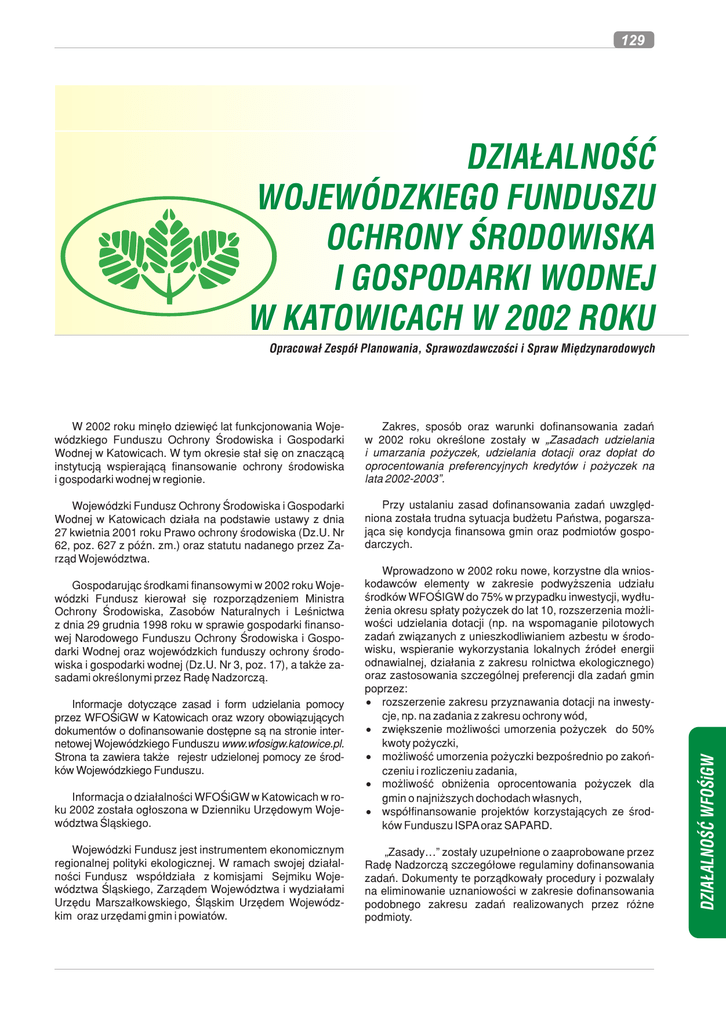 129 DZIA£ALNOŒÆ WOJEWÓDZKIEGO FUNDUSZU OCHRONY ŒRODOWISKA I GOSPODARKI WODNEJ W KATOWICACH W 2002 ROKU W 2002 roku minê³o dziewiêæ lat funkcjonowania Wojewódzkiego Funduszu Ochrony Œrodowiska i Gospodarki Wodnej w Katowicach. W tym okresie sta³ siê on znacz¹c¹ instytucj¹ wspieraj¹c¹ finansowanie ochrony œrodowiska i gospodarki wodnej w regionie. Zakres, sposób oraz warunki dofinansowania zadañ w 2002 roku okreœlone zosta³y w „Zasadach udzielania i umarzania po¿yczek, udzielania dotacji oraz dop³at do oprocentowania preferencyjnych kredytów i po¿yczek na lata 2002-2003”. Wojewódzki Fundusz Ochrony Œrodowiska i Gospodarki Wodnej w Katowicach dzia³a na podstawie ustawy z dnia 27 kwietnia 2001 roku Prawo ochrony œrodowiska (Dz.U. Nr 62, poz. 627 z póŸn. zm.) oraz statutu nadanego przez Zarz¹d Województwa. Przy ustalaniu zasad dofinansowania zadañ uwzglêdniona zosta³a trudna sytuacja bud¿etu Pañstwa, pogarszaj¹ca siê kondycja finansowa gmin oraz podmiotów gospodarczych. Informacja o dzia³alnoœci WFOŒiGW w Katowicach w roku 2002 zosta³a og³oszona w Dzienniku Urzêdowym Województwa Œl¹skiego. Wprowadzono w 2002 roku nowe, korzystne dla wnioskodawców elementy w zakresie podwy¿szenia udzia³u œrodków WFOŒIGW do 75% w przypadku inwestycji, wyd³u¿enia okresu sp³aty po¿yczek do lat 10, rozszerzenia mo¿liwoœci udzielania dotacji (np. na wspomaganie pilotowych zadañ zwi¹zanych z unieszkodliwianiem azbestu w œrodowisku, wspieranie wykorzystania lokalnych Ÿróde³ energii odnawialnej, dzia³ania z zakresu rolnictwa ekologicznego) oraz zastosowania szczególnej preferencji dla zadañ gmin poprzez: · rozszerzenie zakresu przyznawania dotacji na inwestycje, np. na zadania z zakresu ochrony wód, · zwiêkszenie mo¿liwoœci umorzenia po¿yczek do 50% kwoty po¿yczki, · mo¿liwoœæ umorzenia po¿yczki bezpoœrednio po zakoñczeniu i rozliczeniu zadania, · mo¿liwoœæ obni¿enia oprocentowania po¿yczek dla gmin o najni¿szych dochodach w³asnych, · wspó³finansowanie projektów korzystaj¹cych ze œrodków Funduszu ISPA oraz SAPARD. Wojewódzki Fundusz jest instrumentem ekonomicznym regionalnej polityki ekologicznej. W ramach swojej dzia³alnoœci Fundusz wspó³dzia³a z komisjami Sejmiku Województwa Œl¹skiego, Zarz¹dem Województwa i wydzia³ami Urzêdu Marsza³kowskiego, Œl¹skim Urzêdem Wojewódzkim oraz urzêdami gmin i powiatów. „Zasady…” zosta³y uzupe³nione o zaaprobowane przez Radê Nadzorcz¹ szczegó³owe regulaminy dofinansowania zadañ. Dokumenty te porz¹dkowa³y procedury i pozwala³y na eliminowanie uznaniowoœci w zakresie dofinansowania podobnego zakresu zadañ realizowanych przez ró¿ne podmioty. Gospodaruj¹c œrodkami finansowymi w 2002 roku Wojewódzki Fundusz kierowa³ siê rozporz¹dzeniem Ministra Ochrony Œrodowiska, Zasobów Naturalnych i Leœnictwa z dnia 29 grudnia 1998 roku w sprawie gospodarki finansowej Narodowego Funduszu Ochrony Œrodowiska i Gospodarki Wodnej oraz wojewódzkich funduszy ochrony œrodowiska i gospodarki wodnej (Dz.U. Nr 3, poz. 17), a tak¿e zasadami okreœlonymi przez Radê Nadzorcz¹. Informacje dotycz¹ce zasad i form udzielania pomocy przez WFOŒiGW w Katowicach oraz wzory obowi¹zuj¹cych dokumentów o dofinansowanie dostêpne s¹ na stronie internetowej Wojewódzkiego Funduszu www.wfosigw.katowice.pl. Strona ta zawiera tak¿e rejestr udzielonej pomocy ze œrodków Wojewódzkiego Funduszu. DZIA£ALNOŒÆ WFOŒiGW Opracowa³ Zespó³ Planowania, Sprawozdawczoœci i Spraw Miêdzynarodowych 130 1. Gospodarowanie œrodkami pieniê¿nymi WFOŒiGW w Katowicach w 2002 roku W roku 2002 kontynuowano dzia³ania maj¹ce na celu zapewnienie efektywnoœci gospodarowania œrodkami, w tym zachowanie przez Wojewódzki Fundusz funkcji pewnego i terminowego p³atnika. Udzielenie dofinansowania ze œrodków Wojewódzkiego Funduszu poprzedzane by³o analiz¹ wielkoœci planowanego efektu ekologicznego i kosztu jego uzyskania, zabezpieczenia udzielanych po¿yczek, a tak¿e niektórych dotacji. Uruchamianie œrodków nastêpowa³o w ratach, z uwzglêdnieniem zasady uruchamiania kolejnych rat dopiero po rozliczeniu kwot wczeœniej przekazanych. Prowadzone by³y kontrole realizacji rzeczowej i finansowej zadania u wnioskodawcy. W³aœciw¹ realizacjê umów egzekwowano tak¿e poprzez interwencje pisemne lub wstrzymanie wyp³at. W uzasadnionych przypadkach, na proœbê wnioskodawcy, umowy by³y aneksowane. Kolejny rok podejmowano dzia³ania dla efektywnego zagospodarowania powierzonych Wojewódzkiemu Funduszowi œrodków Rz¹du Szwajcarii przeznaczonych na wsparcie realizacji przedsiêwziêæ z zakresu ograniczenia niskiej emisji zanieczyszczeñ do powietrza. Funkcjonowa³y 3 linie kredytów preferencyjnych za poœrednictwem banków, co umo¿liwi³o dostêp do œrodków Funduszu osobom fizycznym i ma³ym przedsiêbiorcom. Poprzez warunki umorzeñ udzielonych po¿yczek inicjowano realizacjê kolejnych zadañ ekologicznych, d¹¿ono te¿ do wspó³udzia³u innych œrodków w finansowaniu zadañ ochrony œrodowiska i gospodarki wodnej w regionie, w tym przede wszystkim œrodków Narodowego Funduszu Ochrony Œrodowiska i Gospodarki Wodnej. Stan Funduszu na pocz¹tku 2002 roku wynosi³ 671,2 mln, z czego nale¿noœci z tytu³u udzielonych po¿yczek wynosi³y 451,2 mln z³. W ci¹gu roku nast¹pi³o zwiêkszenie Funduszu o 188,8 mln z³, z czego 124,8 mln z³ stanowi³y op³aty i kary za gospodarcze korzystanie ze œrodowiska, 55,8 mln z³ stanowi³y przychody finansowe (z oprocentowania po¿yczek oraz z tytu³u odsetek od lokowania czasowo wolnych œrodków pieniê¿nych). Wydatki (zmniejszaj¹ce fundusz) wynios³y 153,3 mln z³ i obejmowa³y wydatki: dotacje, dop³aty do odsetek bankowych kredytowanych zadañ, umorzenia po¿yczek, nagrody za dzia³alnoœæ w dziedzinie ochrony œrodowiska oraz koszty dzia³alnoœci operacyjnej i finansowej, w tym koszty dzia³alnoœci organów i biura Wojew