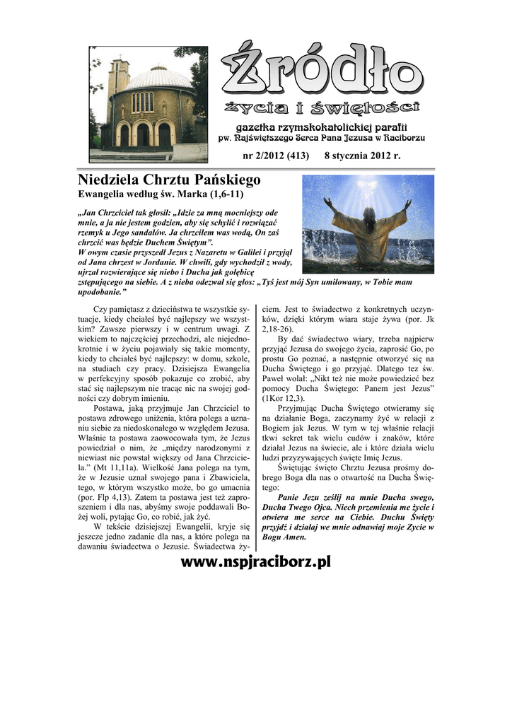 gazetka rzymskokatolickiej parafii pw. Najświętszego Serca Pana Jezusa w Raciborzu nr 2/2012 (413) 8 stycznia 2012 r. Niedziela Chrztu Pańskiego Ewangelia według św. Marka (1,6-11) „Jan Chrzciciel tak głosił: „Idzie za mną mocniejszy ode mnie, a ja nie jestem godzien, aby się schylić i rozwiązać rzemyk u Jego sandałów. Ja chrzciłem was wodą, On zaś chrzcić was będzie Duchem Świętym”. W owym czasie przyszedł Jezus z Nazaretu w Galilei i przyjął od Jana chrzest w Jordanie. W chwili, gdy wychodził z wody, ujrzał rozwierające się niebo i Ducha jak gołębicę zstępującego na siebie. A z nieba odezwał się głos: „Tyś jest mój Syn umiłowany, w Tobie mam upodobanie.” Czy pamiętasz z dzieciństwa te wszystkie sytuacje, kiedy chciałeś być najlepszy we wszystkim? Zawsze pierwszy i w centrum uwagi. Z wiekiem to najczęściej przechodzi, ale niejednokrotnie i w Ŝyciu pojawiały się takie momenty, kiedy to chciałeś być najlepszy: w domu, szkole, na studiach czy pracy. Dzisiejsza Ewangelia w perfekcyjny sposób pokazuje co zrobić, aby stać się najlepszym nie tracąc nic na swojej godności czy dobrym imieniu. Postawa, jaką przyjmuje Jan Chrzciciel to postawa zdrowego uniŜenia, która polega a uznaniu siebie za niedoskonałego w względem Jezusa. Właśnie ta postawa zaowocowała tym, Ŝe Jezus powiedział o nim, Ŝe „między narodzonymi z niewiast nie powstał większy od Jana Chrzciciela.” (Mt 11,11a). Wielkość Jana polega na tym, Ŝe w Jezusie uznał swojego pana i Zbawiciela, tego, w którym wszystko moŜe, bo go umacnia (por. Flp 4,13). Zatem ta postawa jest teŜ zaproszeniem i dla nas, abyśmy swoje poddawali BoŜej woli, pytając Go, co robić, jak Ŝyć. W tekście dzisiejszej Ewangelii, kryje się jeszcze jedno zadanie dla nas, a które polega na dawaniu świadectwa o Jezusie. Świadectwa Ŝy- ciem. Jest to świadectwo z konkretnych uczynków, dzięki którym wiara staje Ŝywa (por. Jk 2,18-26). By dać świadectwo wiary, trzeba najpierw przyjąć Jezusa do swojego Ŝycia, zaprosić Go, po prostu Go poznać, a następnie otworzyć się na Ducha Świętego i go przyjąć. Dlatego tez św. Paweł wolał: „Nikt teŜ nie moŜe powiedzieć bez pomocy Ducha Świętego: Panem jest Jezus” (1Kor 12,3). Przyjmując Ducha Świętego otwieramy się na działanie Boga, zaczynamy Ŝyć w relacji z Bogiem jak Jezus. W tym w tej właśnie relacji tkwi sekret tak wielu cudów i znaków, które działał Jezus na świecie, ale i które działa wielu ludzi przyzywających święte Imię Jezus. Świętując święto Chrztu Jezusa prośmy dobrego Boga dla nas o otwartość na Ducha Świętego: Panie Jezu ześlij na mnie Ducha swego, Ducha Twego Ojca. Niech przemienia me Ŝycie i otwiera me serce na Ciebie. Duchu Święty przyjdź i działaj we mnie odnawiaj moje Zycie w Bogu Amen. www.nspjraciborz.pl 2 Źródło - gazetka Poniedziałek – 9 stycznia 2012 Mk 1,14-20 630 1. Za †† rodziców Gertrudę i Wilhelma Magiera, † siostrę i dziadków 2. Za † Stefanię Buczko (w 30. dzień po śmierci) 700 Za † Franciszka Skroch 1800 Za † siostrę Zofię Prędkiewicz (od brata z rodziną) Wtorek – 10 stycznia 2012 Mk 1,21-28 630 Do BoŜej Opatrzności i Matki BoŜej z podziękowaniem za otrzymane łaski, z prośbą o dalsze z okazji urodzin córki Iwety 800 W języku niemieckim: Für Lebende und Verstorbene aus der Familie 900 Do Miłosierdzia BoŜego za † męŜa Winfryda w 7. rocznicę śmierci, ††rodziców z obu stron, dziadków i całe pokrewieństwo 1800 Za †† męŜa Stefana w rocznicę urodzin, mamę Pelagię i †† z rodziny Środa – 11 stycznia 2012 Mk 1,29-39 630 Do BoŜej Opatrzności w intencji Aleksandry z okazji 47. rocznicy urodzin z podziękowaniem za otrzymane łaski, z prośbą o BoŜe błogosławieństwo i zdrowie 700 Za † Aleksandra w 5. rocznicę śmierci i ††z rodziny 1800 Za ††rodziców Barbarę i Marcina Małanka Czwartek – 12 stycznia 2012 Mk 1,40-45 630 wolna intencja 700 Za †† Konrada Cieślika w 16. rocznice śmierci, Ŝonę Emę oraz rodziców z obu stron 1630 Szkolna: kolędowanie dla dzieci Za † męŜa Zygfryda Polaczka w 2. rocznicę śmierci 1800 Piątek – 13 stycznia 2012 Mk 2,1-12 630 wolna intencja 900 Za †† córkę Lucynę w 25. rocznicę śmierci, męŜa Józefa, rodziców, braci Stanisława i Jana oraz za ††z rodziny Paszkiewicz i Songin Za † męŜa Pawła Pietrzyka w 4. rocznicę śmierci 1800 1900 Msza Święta młodzieŜowa Sobota – 14 stycznia 2012 Mk 2,13-17 630 Dziękczynna w intencji Marii i Józefa z okazji 40. rocznicy ślubu z prośbą o zdrowie i BoŜe błogosławieństwo dla całej rodziny 700 1. Za † Leszka Pałka (od sąsiadów) 2. Do Najświętszego Serca Pana Jezusa o zdrowie w intencji rodziny Oli i Krzysztofa oraz o dary Ducha Świętego 1730 Nieszpory Maryjne 1800 W sobotni wieczór: Za †† męŜa Alojzego Bugla, rodziców i pokrewieństwo z obu stron i dusze w czyśćcu cierpiące II Niedziela zwykła – 15 stycznia 2012 1Sm 3,3-10; 1 Kor 6,13-20; J 1,35-42 700 Za †† męŜa Gintra w 30. rocznicę śmierci oraz ††pokrewieństwo z obu stron 830 Godzinki o Niepokalanym Poczęciu NMP 900 W intencji Cecylii i Wolfganga w 45. rocznicę ślubu, z podziękowaniem Panu Bogu i Matce Najświętszej za otrzymane łaski, z prośbą o BoŜe błogosławieństwo, umocnienie wiary i zdrowie w rodzinie 1030 W intencji rodzin, które przyjęły odwiedziny kolędowe 1200 Do BoŜej Opatrzności w intencji Heleny i Franciszka z okazji 40. rocznicy ślubu oraz w intencji Agnieszki z okazji 18. rocznicy urodzin z podziękowaniem za otrzymane łaski, z prośbą o BoŜe błogosławieństwo i zdrowie dla całej rodziny 1545 RóŜaniec Fatimski 1730 Nieszpory kolędowe parafii pw. NSPJ w Raciborzu 3 00 18 Za zmarłych (zbiorowa) : za † Marię Cempel w I rocznicę śmierci, za † Antoniego Durkalca (od sąsiadów), za † Jana Ujca (od współlokatorów 
