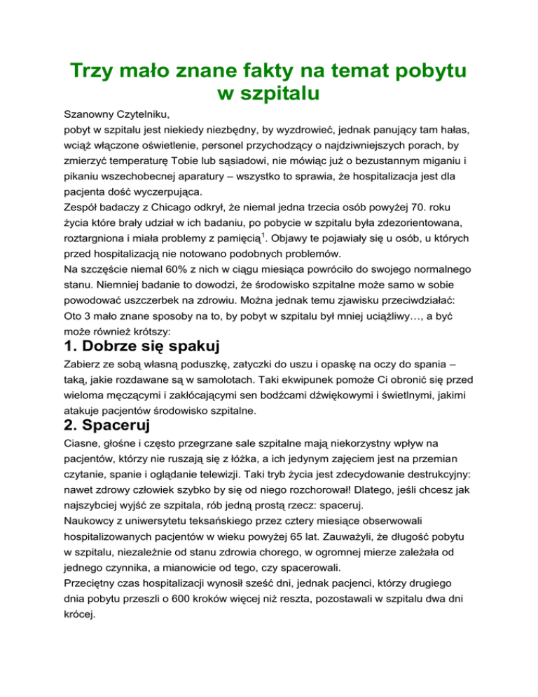 Trzy mało znane fakty na temat pobytu w szpitalu Szanowny Czytelniku, pobyt w szpitalu jest niekiedy niezbędny, by wyzdrowieć, jednak panujący tam hałas, wciąż włączone oświetlenie, personel przychodzący o najdziwniejszych porach, by zmierzyć temperaturę Tobie lub sąsiadowi, nie mówiąc już o bezustannym miganiu i pikaniu wszechobecnej aparatury – wszystko to sprawia, że hospitalizacja jest dla pacjenta dość wyczerpująca. Zespół badaczy z Chicago odkrył, że niemal jedna trzecia osób powyżej 70. roku życia które brały udział w ich badaniu, po pobycie w szpitalu była zdezorientowana, roztargniona i miała problemy z pamięcią1. Objawy te pojawiały się u osób, u których przed hospitalizacją nie notowano podobnych problemów. Na szczęście niemal 60% z nich w ciągu miesiąca powróciło do swojego normalnego stanu. Niemniej badanie to dowodzi, że środowisko szpitalne może samo w sobie powodować uszczerbek na zdrowiu. Można jednak temu zjawisku przeciwdziałać: Oto 3 mało znane sposoby na to, by pobyt w szpitalu był mniej uciążliwy…, a być może również krótszy: 1. Dobrze się spakuj Zabierz ze sobą własną poduszkę, zatyczki do uszu i opaskę na oczy do spania – taką, jakie rozdawane są w samolotach. Taki ekwipunek pomoże Ci obronić się przed wieloma męczącymi i zakłócającymi sen bodźcami dźwiękowymi i świetlnymi, jakimi atakuje pacjentów środowisko szpitalne. 2. Spaceruj Ciasne, głośne i często przegrzane sale szpitalne mają niekorzystny wpływ na pacjentów, którzy nie ruszają się z łóżka, a ich jedynym zajęciem jest na przemian czytanie, spanie i oglądanie telewizji. Taki tryb życia jest zdecydowanie destrukcyjny: nawet zdrowy człowiek szybko by się od niego rozchorował! Dlatego, jeśli chcesz jak najszybciej wyjść ze szpitala, rób jedną prostą rzecz: spaceruj. Naukowcy z uniwersytetu teksańskiego przez cztery miesiące obserwowali hospitalizowanych pacjentów w wieku powyżej 65 lat. Zauważyli, że długość pobytu w szpitalu, niezależnie od stanu zdrowia chorego, w ogromnej mierze zależała od jednego czynnika, a mianowicie od tego, czy spacerowali. Przeciętny czas hospitalizacji wynosił sześć dni, jednak pacjenci, którzy drugiego dnia pobytu przeszli o 600 kroków więcej niż reszta, pozostawali w szpitalu dwa dni krócej. Ci „piechurzy” nie byli ani młodsi, ani zdrowsi niż pozostali pacjenci i równie często podłączano ich pod kroplówkę. Co więcej, spacerowanie wcale nie zwiększało u nich ryzyka upadku2. A zatem, jeśli wolisz spędzać czas w domu niż w szpitalu, a Twój lekarz wyraża na to zgodę – spaceruj. 3. Wystrzegaj się… telefonów Z pewnością nieobce jest Ci pojęcie zakażeń szpitalnych, czyli chorób, którymi zarażamy się w czasie hospitalizacji. Szczególnie niebezpieczną ich przyczyną są drobnoustroje oporne na leczenie. Zaskakujące źródło tych groźnych bakterii ujawniono podczas badania, którego wyniki opublikowano niedawno w American Journal of Infection Control: Okazały się nimi… telefony komórkowe. Autorzy eksperymentu po przebadaniu telefonów komórkowych personelu szpitalnego, pacjentów i ich rodzin pod kątem występowania na nich bakterii antybiotykoopornych, zaobserwowali pozytywny wynik testu był dla 20,6% telefonów personelu szpitalnego. Ale to jeszcze nic: obecność bakterii wieloopornych stwierdzono aż na… 39,6% telefonów należących do pacjentów i ich rodzin 3. Innymi słowy, dopóki dokładnie nie wyczyścisz swojego telefonu, raczej nie dzwoń do bliskich z informacją, że Twoja operacja się udała. Dla śmiechu… To mi przypomina krążący swego czasu wśród pacjentów dowcip: – Dzień dobry! Rejestracja? Chciałbym dowiedzieć się o stan zdrowia Marka Kozłowskiego. Leży w sali 302. Poprawiło mu się choć trochę, czy wciąż jest kiepsko? – Chwileczkę, połączę z dyżurką pielęgniarek. Po dłuższym oczekiwaniu: – Słucham, pielęgniarka dyżurna. – Chciałbym się dowiedzieć o stan Marka Kozłowskiego z 302. – Chwileczkę, połączę pana z lekarzem dyżurnym. Po jeszcze dłuższym oczekiwaniu: – Tak, słucham. – Dzień dobry doktorze. Chciałbym się dowiedzieć, w jakim stanie jest Marek Kozłowski, który od trzech tygodni leży w sali 302. – Chwileczkę, zajrzę do karty pacjenta. Po jeszcze chwili oczekiwania: – Hmmm, a więc tak: Miał dziś apetyt, ciśnienie tętnicze i puls są stabilne, dobrze reaguje na wprowadzone leczenie. Jutro planujemy odłączyć mu monitor EKG. Jeśli nic się nie wydarzy w ciągu kolejnych 48 godzin, jego lekarz prowadzący wypisze go jeszcze przed weekendem. – Ach, to wspaniałe wiadomości! Ogromnie się cieszę. Dziękuję, doktorze. – Sądząc z Pańskiego tonu zapewne jest Pan bardzo bliskim krewnym pacjenta, czy tak? – Ależ nie! Mówi Marek Kozłowski we własnej osobie. Dzwonię z sali 302! Lekarze i pielęgniarki tylko wchodzą i wychodzą, ale nikt o niczym mi nie mówi… A ja chciałem się tylko dowiedzieć, co ze mną! Dziękuję za informację! Zdrowia życzę! Jean-Marc Dupuis P.S. Wczoraj ukazał się nowy numer Dossier Naturalnych Terapii. W majowym raporcie – Nie czekaj, aż lekarz powie Ci, że masz Alzheimera – piszemy o substancjach naturalnych, które mogą pomóc uchronić się przed tą chorobą lub spowolnić jej postęp. Ujawniamy też szokującą prawdę – woda z kranu w całej Polsce zawiera pierwiastek, który sprzyja zachorowaniom na Alzheimera. Prawdopodobnie znajduje się on też w wodach butelkowanych – wyniki badań na jego zawartość nie są publicznie dostępne. Podpowiadamy, co jeść, a czego unikać, aby mieć szansę uchronić się przed tą chorobą (dieta zalecana przez większość dietetyków zwiększa ryzyko zachorowania) oraz jak się odżywiać, jeśli choroba jest już zdiagnozowana. Aby otrzymać ten i inne raporty z serii Dossier Naturalnych Terapii, proszę KL