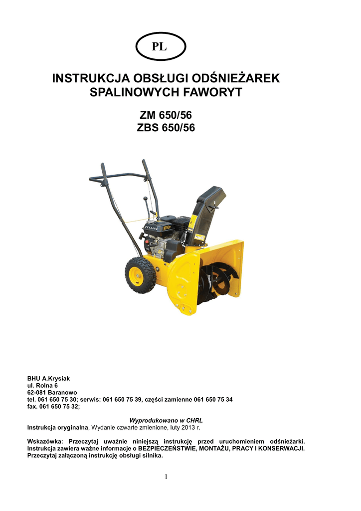 instrukcja obsługi odśnieżarki FAWORYT ZM ZBS 650 56