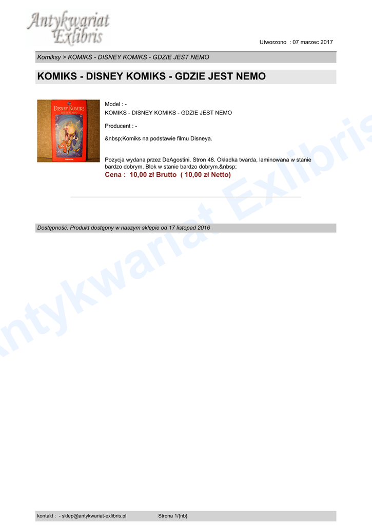 Utworzono : 07 marzec 2017 Komiksy > KOMIKS - DISNEY KOMIKS - GDZIE JEST NEMO KOMIKS - DISNEY KOMIKS - GDZIE JEST NEMO Model : - s i r b KOMIKS - DISNEY KOMIKS - GDZIE JEST NEMO Producent :  Komiks na podstawie filmu Disneya. i l x Pozycja wydana przez DeAgostini. Stron 48. Okładka twarda, laminowana w stanie bardzo dobrym. Blok w stanie bardzo dobrym.  Cena : 10,00 zł Brutto ( 10,00 zł Netto) E t a i r a w k y t n A Dostępność: Produkt dostępny w naszym sklepie od 17 listopad 2016 kontakt : - [email protected] Strona 1/{nb}