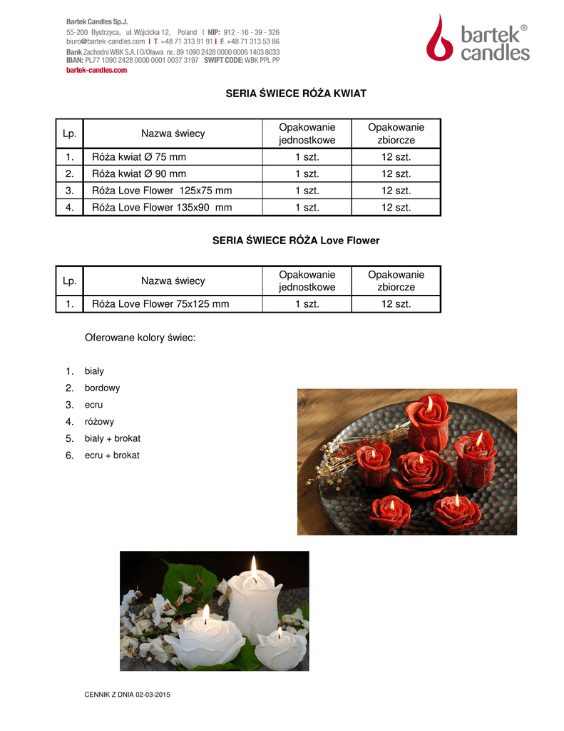 SERIA ŚWIECE RÓŻA KWIAT Lp. Nazwa świecy Opakowanie jednostkowe Opakowanie zbiorcze 1. Róża kwiat Ø 75 mm 1 szt. 12 szt. 2. Róża kwiat Ø 90 mm 1 szt. 12 szt. 3. Róża Love Flower 125x75 mm 1 szt. 12 szt. 4. Róża Love Flower 135x90 mm 1 szt. 12 szt. SERIA ŚWIECE RÓŻA Love Flower Lp. 1. Nazwa świecy Róża Love Flower 75x125 mm Oferowane kolory świec: 1. biały 2. bordowy 3. ecru 4. różowy 5. biały + brokat 6. ecru + brokat CENNIK Z DNIA 02-03-2015 Opakowanie jednostkowe Opakowanie zbiorcze 1 szt. 12 szt.