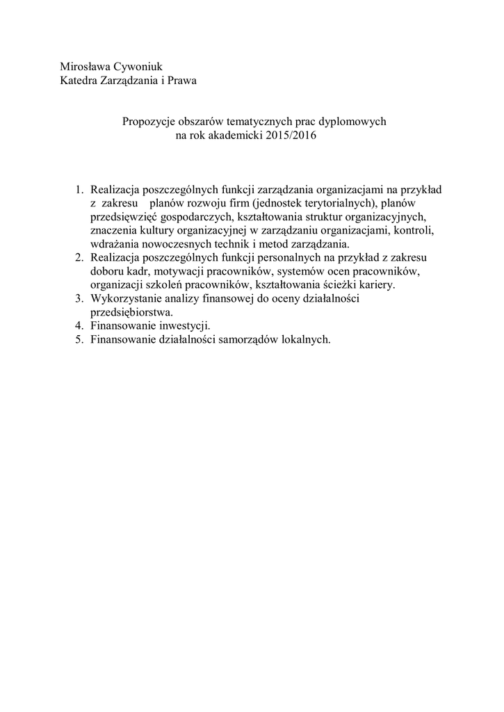 Mirosława Cywoniuk Katedra Zarządzania i Prawa Propozycje obszarów tematycznych prac dyplomowych na rok akademicki 2015/2016 1. Realizacja poszczególnych funkcji zarządzania organizacjami na przykład z zakresu planów rozwoju firm (jednostek terytorialnych), planów przedsięwzięć gospodarczych, kształtowania struktur organizacyjnych, znaczenia kultury organizacyjnej w zarządzaniu organizacjami, kontroli, wdrażania nowoczesnych technik i metod zarządzania. 2. Realizacja poszczególnych funkcji personalnych na przykład z zakresu doboru kadr, motywacji pracowników, systemów ocen pracowników, organizacji szkoleń pracowników, kształtowania ścieżki kariery. 3. Wykorzystanie analizy finansowej do oceny działalności przedsiębiorstwa. 4. Finansowanie inwestycji. 5. Finansowanie działalności samorządów lokalnych.