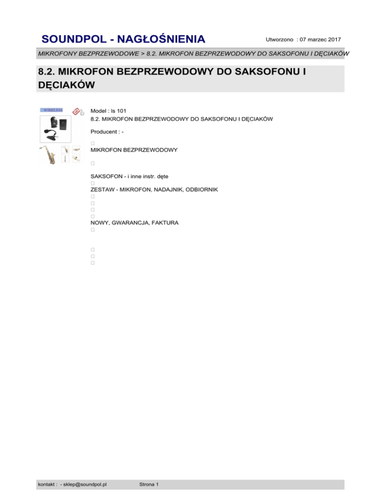 SOUNDPOL - NAGŁOŚNIENIA Utworzono : 07 marzec 2017 MIKROFONY BEZPRZEWODOWE > 8.2. MIKROFON BEZPRZEWODOWY DO SAKSOFONU I DĘCIAKÓW 8.2. MIKROFON BEZPRZEWODOWY DO SAKSOFONU I DĘCIAKÓW Model : ls 101 8.2. MIKROFON BEZPRZEWODOWY DO SAKSOFONU I DĘCIAKÓW Producent : � MIKROFON BEZPRZEWODOWY � SAKSOFON - i inne instr. dęte � ZESTAW - MIKROFON, NADAJNIK, ODBIORNIK � � � � NOWY, GWARANCJA, FAKTURA � � � � kontakt : - [email protected] Strona 1 SOUNDPOL - NAGŁOŚNIENIA Utworzono : 07 marzec 2017 MIKROFONY BEZPRZEWODOWE > 8.2. MIKROFON BEZPRZEWODOWY DO SAKSOFONU I DĘCIAKÓW 8.2. MIKROFON BEZPRZEWODOWY DO SAKSOFONU I DĘCIAKÓW kontakt : - [email protected] Strona 2 SOUNDPOL - NAGŁOŚNIENIA Utworzono : 07 marzec 2017 MIKROFONY BEZPRZEWODOWE > 8.2. MIKROFON BEZPRZEWODOWY DO SAKSOFONU I DĘCIAKÓW 8.2. MIKROFON BEZPRZEWODOWY DO SAKSOFONU I DĘCIAKÓW � � Zestaw do nagłaśniania i nagrywania instrumentów dętych: -saksofonu, klarnetu, trąbki, puzonu, waltorni i innych... � � Zestaw zawiera: -mikrofon instrumentalny �(giętka szyjka ze specjalnym klipsem) -nadajnik kieszonkowy (zasil. bateria 9V)� -odbiornik z anteną -kabel odbiornik-mikser -zasilacz odbiornika -bateria 9V (do nadajnika) � � � Mikrofon instrumentalny ma specjalną wkładkę przeznaczoną do instrumentów dętych. Dodatkowo jest on na gęsiej szyjce oraz ma klips, co pozwala wygodnie� i precyzyjnie zamocować i ustawić go na instrumencie. Mikrofon ma kabel z wtykiem jack,� który podłączamy do nadajnika kieszonkowego (mocowanie również do paska). Nadajnik bezprzewodowo przekazuje dźwięk do odbiornika, a odbiornik� podłączamy kablem do miksera lub wzmacniacza. � � � � Dane techniczne mikrofonu: Charakterystyka elektret/hiperkardioida Pasmo przenoszenia: 50-20 000Hz Impedancja: 350Ω Czułość 2,5mV/Pa/1kHz Max SPL 130dB Zasilanie: 9V z nadajnika Wymiary 140mm (długość) Waga: 35g Połączenie- kabel jack � � � � Dane techniczne systemu: -Częstotliwość odbioru: 174-216MHzv -wzmocnienie: 80dB -zasilanie: odbiornik 12V (zasilacz) , nadajnik 9V (bateria) -zasięg działania: optymalny 30-50m � � � � � � � kontakt : - [email protected] Strona 3 SOUNDPOL - NAGŁOŚNIENIA Utworzono : 07 marzec 2017 MIKROFONY BEZPRZEWODOWE > 8.2. MIKROFON BEZPRZEWODOWY DO SAKSOFONU I DĘCIAKÓW 8.2. MIKROFON BEZPRZEWODOWY DO SAKSOFONU I DĘCIAKÓW kontakt : - [email protected] Strona 4 SOUNDPOL - NAGŁOŚNIENIA Utworzono : 07 marzec 2017 MIKROFONY BEZPRZEWODOWE > 8.2. MIKROFON BEZPRZEWODOWY DO SAKSOFONU I DĘCIAKÓW 8.2. MIKROFON BEZPRZEWODOWY DO SAKSOFONU I DĘCIAKÓW � � � kontakt : - [email protected] Strona 5 SOUNDPOL - NAGŁOŚNIENIA Utworzono : 07 marzec 2017 MIKROFONY BEZPRZEWODOWE > 8.2. MIKROFON BEZPRZEWODOWY DO SAKSOFONU I DĘCIAKÓW 8.2. MIKROFON BEZPRZEWODOWY DO SAKSOFONU I DĘCIAKÓW kontakt : - [email protected] Strona 6 SOUNDPOL - NAGŁOŚNIENIA Utworzono : 07 marzec 2017 MIKROFONY BEZPRZEWODOWE > 8.2. MIKROFON BEZPRZEWODOWY DO SAKSOFONU I DĘCIAKÓW 8.2. MIKROFON BEZPRZEWODOWY DO SAKSOFONU I DĘCIAKÓW � � Cena : 370,00 zł Brutto ( 300,81 zł Netto) Dostępność: Produkt dostępny w naszym sklepie od 20 listopad 2012 kontakt : - [email protected] Strona 7