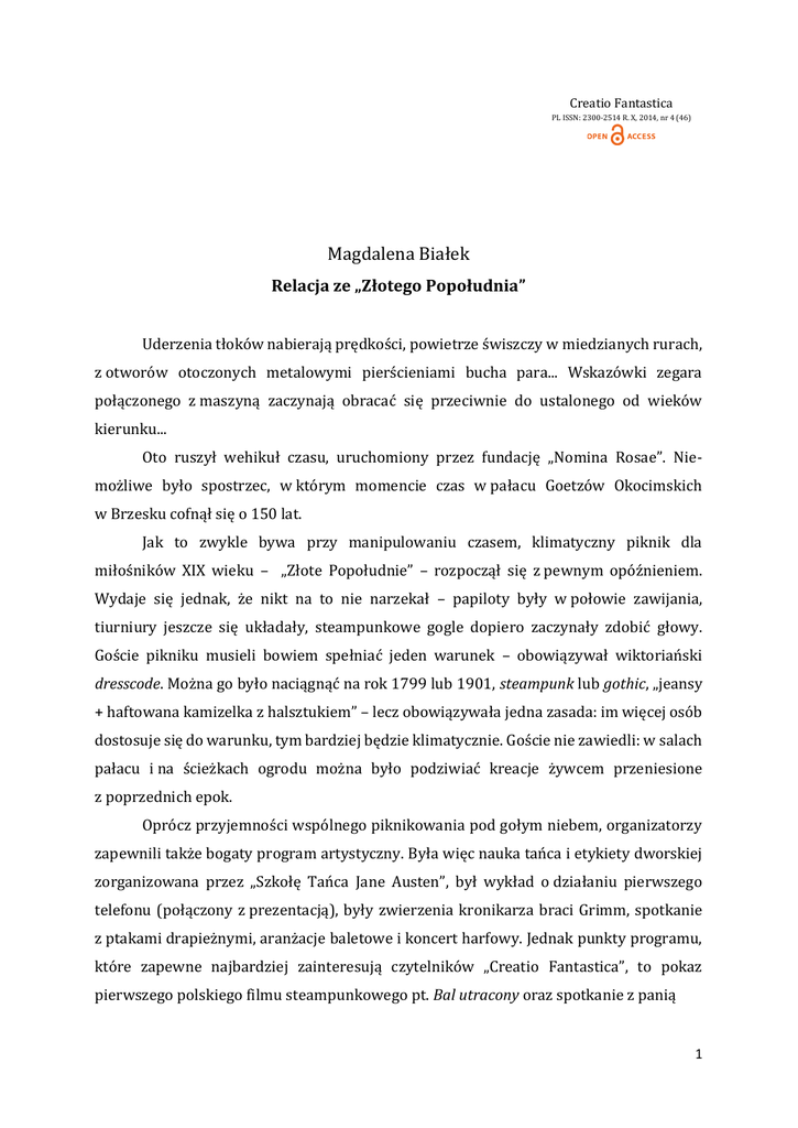 Creatio Fantastica PL ISSN: 2300-2514 R. X, 2014, nr 4 (46) Magdalena Białek Relacja ze „Złotego Popołudnia” Uderzenia tłoków nabierają prędkości, powietrze świszczy w miedzianych rurach, z otworów otoczonych metalowymi pierścieniami bucha para... Wskazówki zegara połączonego z maszyną zaczynają obracać się przeciwnie do ustalonego od wieków kierunku... Oto ruszył wehikuł czasu, uruchomiony przez fundację „Nomina Rosae”. Niemożliwe było spostrzec, w którym momencie czas w pałacu Goetzów Okocimskich w Brzesku cofnął się o 150 lat. Jak to zwykle bywa przy manipulowaniu czasem, klimatyczny piknik dla miłośników XIX wieku – „Złote Popołudnie” – rozpoczął się z pewnym opóźnieniem. Wydaje się jednak, że nikt na to nie narzekał – papiloty były w połowie zawijania, tiurniury jeszcze się układały, steampunkowe gogle dopiero zaczynały zdobić głowy. Goście pikniku musieli bowiem spełniać jeden warunek – obowiązywał wiktoriański dresscode. Można go było naciągnąć na rok 1799 lub 1901, steampunk lub gothic, „jeansy + haftowana kamizelka z halsztukiem” – lecz obowiązywała jedna zasada: im więcej osób dostosuje się do warunku, tym bardziej będzie klimatycznie. Goście nie zawiedli: w salach pałacu i na ścieżkach ogrodu można było podziwiać kreacje żywcem przeniesione z poprzednich epok. Oprócz przyjemności wspólnego piknikowania pod gołym niebem, organizatorzy zapewnili także bogaty program artystyczny. Była więc nauka tańca i etykiety dworskiej zorganizowana przez „Szkołę Tańca Jane Austen”, był wykład o działaniu pierwszego telefonu (połączony z prezentacją), były zwierzenia kronikarza braci Grimm, spotkanie z ptakami drapieżnymi, aranżacje baletowe i koncert harfowy. Jednak punkty programu, które zapewne najbardziej zainteresują czytelników „Creatio Fantastica”, to pokaz pierwszego polskiego filmu steampunkowego pt. Bal utracony oraz spotkanie z panią 1 Wilhelminą Harker. Nie, nic mi się nie przyśniło: wyobraźcie sobie dobrze widoczny księżyc na dzień przed pełnią, wnętrze kaplicy oświetlone tylko blaskiem świec, odpowiednią muzykę i kobietę ubraną w białe, powłóczyste szaty siedzącą na marmurowych stopniach i opowiadającą o spotkaniu z Draculą. Wyjątkowo udane przedstawienie przygotowane przez Marię Molendę działało na wyobraźnię, na szczęście żadna z obecnych w kaplicy panienek nie dostała spazmów. Chyba mogę zaryzykować stwierdzenie, iż „Złote Popołudnie” jest jedna z najbardziej klimatycznych imprez w Polsce (o ile nie zajmuje w tym rankingu pierwszego miejsca). Piękny pałac z rozległym ogrodem, starannie zaprojektowane i uszyte kostiumy uczestników oraz atrakcje nawiązujące do XIX-wiecznej kultury wprowadziły niepowtarzalny nastrój i pomogły poczuć się jak bohater powieści Jane Austen czy Lwa Tołstoja. Nieliczne wady imprezy to: data (niestety, piękna pogoda i prażące słońce są pożądane przy pikniku, ale nie w sytuacji, gdy jego uczestnicy noszą gorsety i ciężkie suknie), lekki zamęt organizacyjny oraz fakt, że wszystko trwało tylko jedno popołudnie (co było zgodne z nazwą imprezy, a jednak... czas pędził nieubłaganie i pozostał niedosyt). Myśl, że do kolejnego „Złotego Popołudnia” trzeba przeczekać cały rok szarych popołudni, może napawać smutkiem. Ja jednak zamierzam przeganiać nostalgię planowaniem kreacji na następny piknik. Polecam każdemu rozczarowanemu współczesnością i ciekawemu przeszłości wzięcie udziału w tym niezwykłym spotkaniu – w końcu któż nie chciałby przebywać na chwilę w epoce Juliusza Verne’a i Edgara Allana Poe? 2