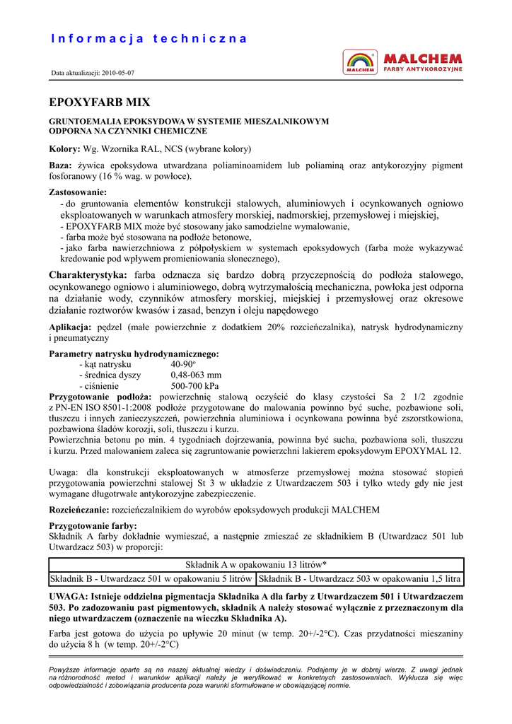 Informacja techniczna Data aktualizacji: 2010-05-07 EPOXYFARB MIX GRUNTOEMALIA EPOKSYDOWA W SYSTEMIE MIESZALNIKOWYM ODPORNA NA CZYNNIKI CHEMICZNE Kolory: Wg. Wzornika RAL, NCS (wybrane kolory) Baza: żywica epoksydowa utwardzana poliaminoamidem lub poliaminą oraz antykorozyjny pigment fosforanowy (16 % wag. w powłoce). Zastosowanie: - do gruntowania elementów konstrukcji stalowych, aluminiowych i ocynkowanych ogniowo eksploatowanych w warunkach atmosfery morskiej, nadmorskiej, przemysłowej i miejskiej, - EPOXYFARB MIX może być stosowany jako samodzielne wymalowanie, - farba może być stosowana na podłoże betonowe, - jako farba nawierzchniowa z półpołyskiem w systemach epoksydowych (farba może wykazywać kredowanie pod wpływem promieniowania słonecznego), Charakterystyka: farba odznacza się bardzo dobrą przyczepnością do podłoża stalowego, ocynkowanego ogniowo i aluminiowego, dobrą wytrzymałością mechaniczna, powłoka jest odporna na działanie wody, czynników atmosfery morskiej, miejskiej i przemysłowej oraz okresowe działanie roztworów kwasów i zasad, benzyn i oleju napędowego Aplikacja: pędzel (małe powierzchnie z dodatkiem 20% rozcieńczalnika), natrysk hydrodynamiczny i pneumatyczny Parametry natrysku hydrodynamicznego: - kąt natrysku 40-90o - średnica dyszy 0,48-063 mm - ciśnienie 500-700 kPa Przygotowanie podłoża: powierzchnię stalową oczyścić do klasy czystości Sa 2 1/2 zgodnie z PN-EN ISO 8501-1:2008 podłoże przygotowane do malowania powinno być suche, pozbawione soli, tłuszczu i innych zanieczyszczeń, powierzchnia aluminiowa i ocynkowana powinna być zszorstkowiona, pozbawiona śladów korozji, soli, tłuszczu i kurzu. Powierzchnia betonu po min. 4 tygodniach dojrzewania, powinna być sucha, pozbawiona soli, tłuszczu i kurzu. Przed malowaniem zaleca się zagruntowanie powierzchni lakierem epoksydowym EPOXYMAL 12. Uwaga: dla konstrukcji eksploatowanych w atmosferze przemysłowej można stosować stopień przygotowania powierzchni stalowej St 3 w układzie z Utwardzaczem 503 i tylko wtedy gdy nie jest wymagane długotrwałe antykorozyjne zabezpieczenie. Rozcieńczanie: rozcieńczalnikiem do wyrobów epoksydowych produkcji MALCHEM Przygotowanie farby: Składnik A farby dokładnie wymieszać, a następnie zmieszać ze składnikiem B (Utwardzacz 501 lub Utwardzacz 503) w proporcji: Składnik A w opakowaniu 13 litrów* Składnik B - Utwardzacz 501 w opakowaniu 5 litrów Składnik B - Utwardzacz 503 w opakowaniu 1,5 litra UWAGA: Istnieje oddzielna pigmentacja Składnika A dla farby z Utwardzaczem 501 i Utwardzaczem 503. Po zadozowaniu past pigmentowych, składnik A należy stosować wyłącznie z przeznaczonym dla niego utwardzaczem (oznaczenie na wieczku Składnika A). Farba jest gotowa do użycia po upływie 20 minut (w temp. 20+/-2°C). Czas przydatności mieszaniny do użycia 8 h (w temp. 20+/-2°C) Powyższe informacje oparte są na naszej aktualnej wiedzy i doświadczeniu. Podajemy je w dobrej wierze. Z uwagi jednak na różnorodność metod i warunków aplikacji należy je weryfikować w konkretnych zastosowaniach. Wyklucza się więc odpowiedzialność i zobowiązania producenta poza warunki sformułowane w obowiązującej normie. Informacja techniczna Data aktualizacji: 2010-05-07 Warunki podczas prac malarskich farby z utwardzaczem 501: - minimalna temp. podłoża 5°C, musi być wyższa od punku rosy o co najmniej 3°C - maksymalna względna wilgotność powietrza 80% - dobra wentylacja na stanowisku pracy Warunki podczas prac malarskich farby z utwardzaczem 503: - minimalna temp. podłoża -5°C, wolne od lodu i szronu - maksymalna względna wilgotność powietrza 80% - dobra wentylacja na stanowisku pracy Zalecana ilość warstw: 1-3 Wybrane parametry techniczne mieszaniny: zimowa lepkość Brookfield 4/50 RPM, cP gęstość, g/cm3, (około) LZO, g/l zawartość rozpuszczalników, % wag zawartość substancji nielotnych, % obj. temperatura zapłonu, oC, nie mniej niż krycie jakościowe grubość warstwy, µm (“na mokro”) grubość powłoki, µm (”na sucho”) zużycie teoretyczne, dm3/m2 zużycie teoretyczne, kg /m2 wersja z utwardzaczem 501 wersja z utwardzaczem 503 1000-2000 1,4 420 30 60 21 I 160 96 0,16 0,22 1000-2000 1,5 360 24 70 (+/-3%) 21 I 160 110 0,16 0,24 Czas wysychania (w temp. 20+/-2°C i wilgotności względnej 55+/-5%) - stopień 1 (pyłosuchość), h 3 - stopień 3, h 6 - pełne utwardzenie, dni 7 do nałożenia kolejnych warstw - maksymalny (w temp. 20+/-2°C), dni 30 - minimalny, h 1,5 4 7 30 20°C 10°C 5°C 0°C -5°C Utwardzacz 501 6 12 — — — Utwardzacz 503 4 8 10 16 20 Podane parametry mogą ulec zmianie wraz ze zmianą warunków otoczenia, ilości i grubości warstw. Następne wymalowania: farby poliwinylowe, epoksydowe i poliuretanowe Przechowywanie: w zamkniętych pojemnikach z dala od ognia i źródeł ciepła. Przechowywać poza zasięgiem dzieci. Norma: PN-C-81911:1997. Wyrób powinien odpowiadać wymaganiom normy przez 12 mies. od daty produkcji. Powyższe informacje oparte są na naszej aktualnej wiedzy i doświadczeniu. Podajemy je w dobrej wierze. Z uwagi jednak na różnorodność metod i warunków aplikacji należy je weryfikować w konkretnych zastosowaniach. Wyklucza się więc odpowiedzialność i zobowiązania producenta poza warunki sformułowane w obowiązującej normie.