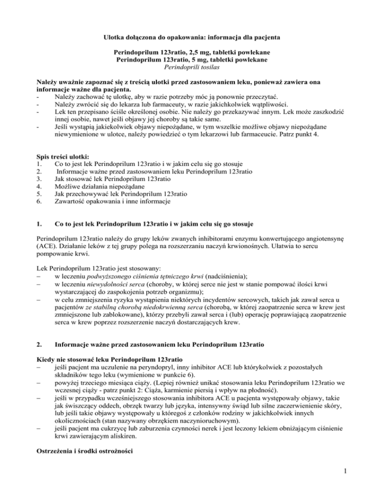 Ulotka dołączona do opakowania: informacja dla pacjenta Perindoprilum 123ratio, 2,5 mg, tabletki powlekane Perindoprilum 123ratio, 5 mg, tabletki powlekane Perindoprili tosilas Należy uważnie zapoznać się z treścią ulotki przed zastosowaniem leku, ponieważ zawiera ona informacje ważne dla pacjenta. Należy zachować tę ulotkę, aby w razie potrzeby móc ją ponownie przeczytać. Należy zwrócić się do lekarza lub farmaceuty, w razie jakichkolwiek wątpliwości. Lek ten przepisano ściśle określonej osobie. Nie należy go przekazywać innym. Lek może zaszkodzić innej osobie, nawet jeśli objawy jej choroby są takie same. Jeśli wystąpią jakiekolwiek objawy niepożądane, w tym wszelkie możliwe objawy niepożądane niewymienione w ulotce, należy powiedzieć o tym lekarzowi lub farmaceucie. Patrz punkt 4. Spis treści ulotki: 1. Co to jest lek Perindoprilum 123ratio i w jakim celu się go stosuje 2. Informacje ważne przed zastosowaniem leku Perindoprilum 123ratio 3. Jak stosować lek Perindoprilum 123ratio 4. Możliwe działania niepożądane 5. Jak przechowywać lek Perindoprilum 123ratio 6. Zawartość opakowania i inne informacje 1. Co to jest lek Perindoprilum 123ratio i w jakim celu się go stosuje Perindoprilum 123ratio należy do grupy leków zwanych inhibitorami enzymu konwertującego angiotensynę (ACE). Działanie leków z tej grupy polega na rozszerzaniu naczyń krwionośnych. Ułatwia to sercu pompowanie krwi. Lek Perindoprilum 123ratio jest stosowany: w leczeniu podwyższonego ciśnienia tętniczego krwi (nadciśnienia); w leczeniu niewydolności serca (choroby, w której serce nie jest w stanie pompować ilości krwi wystarczającej do zaspokojenia potrzeb organizmu); w celu zmniejszenia ryzyka wystąpienia niektórych incydentów sercowych, takich jak zawał serca u pacjentów ze stabilną chorobą niedokrwienną serca (chorobą, w której zaopatrzenie serca w krew jest zmniejszone lub zablokowane), którzy przebyli zawał serca i (lub) operację poprawiającą zaopatrzenie serca w krew poprzez rozszerzenie naczyń dostarczających krew. 2. Informacje ważne przed zastosowaniem leku Perindoprilum 123ratio Kiedy nie stosować leku Perindoprilum 123ratio jeśli pacjent ma uczulenie na peryndopryl, inny inhibitor ACE lub którykolwiek z pozostałych składników tego leku (wymienione w punkcie 6). powyżej trzeciego miesiąca ciąży. (Lepiej również unikać stosowania leku Perindoprilum 123ratio we wczesnej ciąży - patrz punkt 2: Ciąża, karmienie piersią i wpływ na płodność). jeśli w przypadku wcześniejszego stosowania inhibitora ACE u pacjenta występowały objawy, takie jak świszczący oddech, obrzęk twarzy lub języka, intensywny świąd lub silne zaczerwienienie skóry, lub jeśli takie objawy występowały u któregoś z członków rodziny w jakichkolwiek innych okolicznościach (stan nazywany obrzękiem naczynioruchowym). jeśli pacjent ma cukrzycę lub zaburzenia czynności nerek i jest leczony lekiem obniżającym ciśnienie krwi zawierającym aliskiren. Ostrzeżenia i środki ostrożności 1 Przed rozpoczęciem stosowania Perindoprilum 123ratio należy omówić to z lekarzem lub farmaceutą, jeśli którakolwiek z wymienionych sytuacji dotyczy pacjenta:jeśli występuje zwężenie zastawki aortalnej (zwężenie głównego naczynia krwionośnego odprowadzającego krew z serca) lub kardiomiopatia przerostowa (choroba mięśnia sercowego) czy też zwężenie tętnicy nerkowej (zwężenie naczynia krwionośnego dostarczającego krew do nerki); jeśli występują jakiekolwiek inne choroby serca, jeśli występują choroby wątroby, jeśli występują choroby nerek lub jeżeli pacjent jest poddawany dializie, jeśli u pacjenta występuje kolagenoza naczyń (choroba skóry), taka jak toczeń rumieniowaty układowy lub twardzina, jeśli pacjent ma cukrzycę, w przypadku stosowania diety ubogiej w sól lub stosowania zamienników soli kuchennej zawierających potas; jeśli pacjent ma być poddany znieczuleniu i (lub) zabiegowi chirurgicznemu, jeśli ma być przeprowadzony zabieg aferezy LDL (usunięcie cholesterolu z krwi przy użyciu specjalnego urządzenia), jeśli ma być przeprowadzone leczenie odczulające w celu zmniejszenia reakcji uczuleniowych na użądlenia pszczół lub os, jeśli w ostatnim czasie występowała biegunka lub wymioty, lub pacjent jest odwodniony, jeśli lekarz poinformował pacjenta o występowaniu nietolerancji pewnych cukrów, jeśli pacjent przyjmuje którykolwiek z poniższych leków, stosowanych w leczeniu wysokiego ciśnienia krwi: antagonistę receptora angiotensyny II (ang. Angiotensin Receptor Blockers, ARB) (znane również jako sartany - na przykład walsartan, telmisartan, irbesartan), zwłaszcza jeśli pacjent ma zaburzenia czynności nerek związane z cukrzycą. aliskiren. Lekarz prowadzący może monitorować czynność nerek, ciśnienie krwi oraz stężenie elektrolitów (np. potasu) we krwi w regularnych odstępach czasu. Patrz także informacje pod nagłówkiem „Kiedy nie stosować leku Perindoprilum 123ratio. Pacjentka musi powiedzieć lekarzowi, jeśli myśli, że jest (lub może być) w ciąży. Lek Perindoprilum 123ratio nie jest zalecany we wczesnym okresie ciąży i nie wolno go zażywać, jeśli pacjentka jest w ciąży powyżej 3 miesięcy, ponieważ lek może powodować ciężkie uszkodzenia u dziecka, jeżeli był stosowany w tym stanie (patrz punkt 2: ,Ciąża, karmienie piersią i wpływ na płodność). Dzieci i młodzież Nie należy stosować leku Perindoprilum 123ratio u dzieci i młodzieży. Inne leki i Perindoprilum 123ratio Należy powiedzieć lekarzowi lub farmaceucie o wszystkich lekach przyjmowanych obecnie lub ostatnio, a także o lekach, które pacjent planuje przyjmować. Na leczenie lekiem Perindoprilum 123ratio może mieć wpływ stosowanie innych leków, takich jak: inne leki stosowane w leczeniu nadciśnienia, w tym leki moczopędne (leki zwiększające ilość wyt