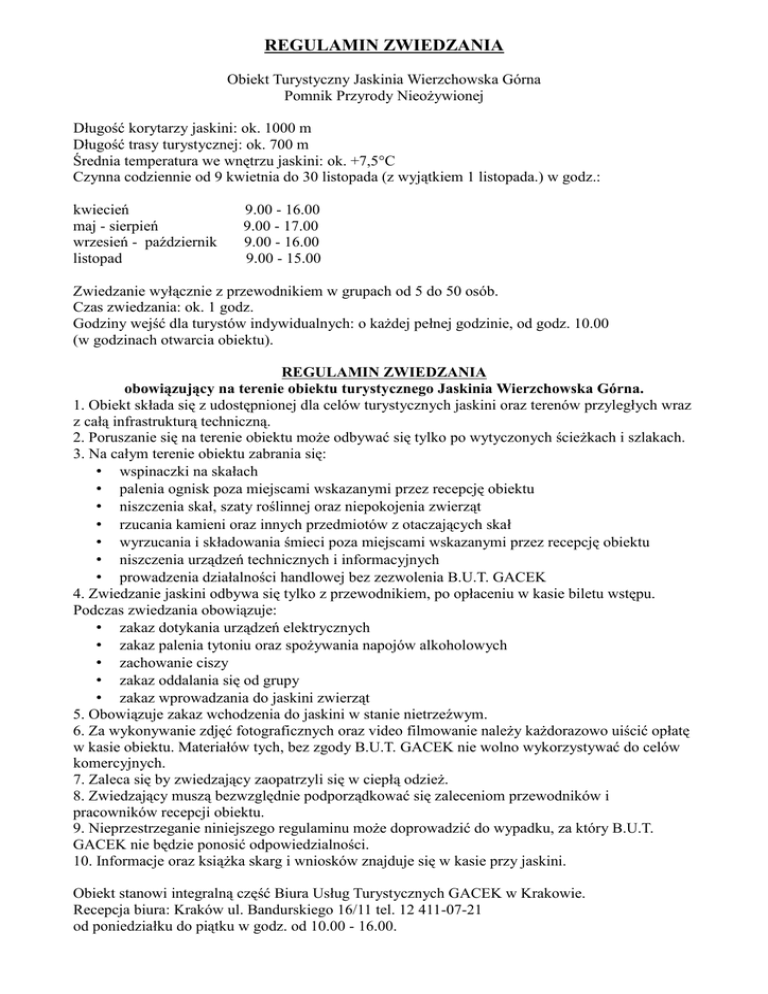 REGULAMIN ZWIEDZANIA Obiekt Turystyczny Jaskinia Wierzchowska Górna Pomnik Przyrody Nieożywionej Długość korytarzy jaskini: ok. 1000 m Długość trasy turystycznej: ok. 700 m Średnia temperatura we wnętrzu jaskini: ok. +7,5°C Czynna codziennie od 9 kwietnia do 30 listopada (z wyjątkiem 1 listopada.) w godz.: kwiecień maj - sierpień wrzesień - październik listopad 9.00 - 16.00 9.00 - 17.00 9.00 - 16.00 9.00 - 15.00 Zwiedzanie wyłącznie z przewodnikiem w grupach od 5 do 50 osób. Czas zwiedzania: ok. 1 godz. Godziny wejść dla turystów indywidualnych: o każdej pełnej godzinie, od godz. 10.00 (w godzinach otwarcia obiektu). REGULAMIN ZWIEDZANIA obowiązujący na terenie obiektu turystycznego Jaskinia Wierzchowska Górna. 1. Obiekt składa się z udostępnionej dla celów turystycznych jaskini oraz terenów przyległych wraz z całą infrastrukturą techniczną. 2. Poruszanie się na terenie obiektu może odbywać się tylko po wytyczonych ścieżkach i szlakach. 3. Na całym terenie obiektu zabrania się: • wspinaczki na skałach • palenia ognisk poza miejscami wskazanymi przez recepcję obiektu • niszczenia skał, szaty roślinnej oraz niepokojenia zwierząt • rzucania kamieni oraz innych przedmiotów z otaczających skał • wyrzucania i składowania śmieci poza miejscami wskazanymi przez recepcję obiektu • niszczenia urządzeń technicznych i informacyjnych • prowadzenia działalności handlowej bez zezwolenia B.U.T. GACEK 4. Zwiedzanie jaskini odbywa się tylko z przewodnikiem, po opłaceniu w kasie biletu wstępu. Podczas zwiedzania obowiązuje: • zakaz dotykania urządzeń elektrycznych • zakaz palenia tytoniu oraz spożywania napojów alkoholowych • zachowanie ciszy • zakaz oddalania się od grupy • zakaz wprowadzania do jaskini zwierząt 5. Obowiązuje zakaz wchodzenia do jaskini w stanie nietrzeźwym. 6. Za wykonywanie zdjęć fotograficznych oraz video filmowanie należy każdorazowo uiścić opłatę w kasie obiektu. Materiałów tych, bez zgody B.U.T. GACEK nie wolno wykorzystywać do celów komercyjnych. 7. Zaleca się by zwiedzający zaopatrzyli się w ciepłą odzież. 8. Zwiedzający muszą bezwzględnie podporządkować się zaleceniom przewodników i pracowników recepcji obiektu. 9. Nieprzestrzeganie niniejszego regulaminu może doprowadzić do wypadku, za który B.U.T. GACEK nie będzie ponosić odpowiedzialności. 10. Informacje oraz książka skarg i wniosków znajduje się w kasie przy jaskini. Obiekt stanowi integralną część Biura Usług Turystycznych GACEK w Krakowie. Recepcja biura: Kraków ul. Bandurskiego 16/11 tel. 12 411-07-21 od poniedziałku do piątku w godz. od 10.00 - 16.00.