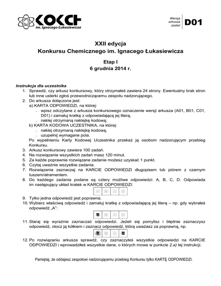 Wersja arkusza zadań D01 XXII edycja Konkursu Chemicznego im. Ignacego Łukasiewicza Etap I 6 grudnia 2014 r. Instrukcja dla uczestnika 1. Sprawdź, czy arkusz konkursowy, który otrzymałeś zawiera 24 strony. Ewentualny brak stron lub inne usterki zgłoś przewodniczącemu zespołu nadzorującego. 2. Do arkusza dołączona jest: a) KARTA ODPOWIEDZI, na której: − wpisz odczytane z arkusza konkursowego oznaczenie wersji arkusza (A01, B01, C01, D01) i zamaluj kratkę z odpowiadającą jej literą, − naklej otrzymaną naklejkę kodową; b) KARTA KODOWA UCZESTNIKA, na której: − naklej otrzymaną naklejkę kodową, − uzupełnij wymagane pola. Po wypełnieniu Karty Kodowej Uczestnika przekaż ją osobom nadzorującym przebieg Konkursu. 3. Arkusz konkursowy zawiera 100 zadań. 4. Na rozwiązanie wszystkich zadań masz 120 minut. 5. Za każde poprawnie rozwiązane zadanie możesz uzyskać 1 punkt. 6. Czytaj uważnie wszystkie zadania. 7. Rozwiązania zaznaczaj na KARCIE ODPOWIEDZI długopisem lub piórem z czarnym tuszem/atramentem. 8. Do każdego zadania podane są cztery możliwe odpowiedzi: A, B, C, D. Odpowiada im następujący układ kratek w KARCIE ODPOWIEDZI: 9. Tylko jedna odpowiedź jest poprawna. 10. Wybierz właściwą odpowiedź i zamaluj kratkę z odpowiadającą jej literą – np. gdy wybrałeś odpowiedź „A”: 11. Staraj się wyraźnie zaznaczać odpowiedzi. Jeżeli się pomylisz i błędnie zaznaczysz odpowiedź, otocz ją kółkiem i zaznacz odpowiedź, którą uważasz za poprawną, np. 12. Po rozwiązaniu arkusza sprawdź, czy zaznaczyłeś wszystkie odpowiedzi na KARCIE ODPOWIEDZI i wprowadziłeś wszystkie dane, o których mowa w punkcie 2.a) tej instrukcji. Pamiętaj, że oddajesz zespołowi nadzorującemu przebieg Konkursu tylko KARTĘ ODPOWIEDZI. Zadanie 1. Na zobojętnienie roztworu zawierającego 0,74 g kwasu jednokarboksylowego zużyto 100 cm3 roztworu NaOH o stężeniu 0,1 mol/dm3. Masa cząsteczkowa tego kwasy wynosiła A. B. C. D. 37 u. 74 u. 111 u. 185 u. Zadanie 2. Efekt cieplny reakcji C2H4 + Cl2 → C2H4Cl2 wynosi A. B. C. D. 200 kJ. 280 kJ. -280 kJ. -200 kJ. wiązanie energia wiązania [kJ] C–H C – Cl Cl – Cl C–C C=C 415 330 121 348 607 Zadanie 3. Cechą charakterystyczną reakcji autokatalitycznej jest to, że przyspiesza ją A. B. C. D. wzrost stężenia produktu. wzrost stężenia substratu. wzrost temperatury układu. wprowadzenie zanieczyszczenia do układu. Zadanie 4. Do probówek zawierających podane niżej substancje dodano wodę. C6H5OH KCl C2H5ONa P4O10 Na2CO3 C2H5OH CaO I II III IV V VI VII Który zestaw zawiera prawidłowo określone odczyny roztworów ? odczyn kwaśny odczyn obojętny odczyn zasadowy IV, VI I, IV, VI I, IV I, IV, V I, II, VI II, V II, VI II, VI III, V, VII III, VII III, V, VII III, VII A. B. C. D. Zadanie 5. Pewien tlenek chloru w warunkach normalnych ma gęstość 3,01 g/cm3. Tlenkiem tym jest A. B. C. D. Cl2O7. ClO2. Cl2O. ClO. Strona 2 z 24 D01 Zadanie 6. Do naczynia zawierającego nasycony roztwór BaSO4 dodano 100 cm3 0,1-molowego roztworu K2SO4. Wskaż prawidłową odpowiedź. A. Wytrąci się osad, ponieważ zmniejszy się iloczyn rozpuszczalności siarczanu(VI) baru. B. Nie wytrąci się osad, ponieważ iloczyn rozpuszczalności siarczanu(VI) baru ma stałą wartość. C. W naczyniu nie zajdą żadne zmiany, ponieważ dodany siarczan(VI) potasu jest dobrze rozpuszczalny w wodzie. D. Wytrąci się osad siarczanu(VI) baru, ponieważ iloczyn stężeń jonów przekroczy wartość jego iloczynu rozpuszczalności. Zadanie 7. Na podstawie przedstawionych kształtów orbitali, wskaż prawidłowe zdanie. (1) (2) (3) (4) A. Orbitale (1) i (2) różnią się poboczną liczbą kwantową, a orbitale (2) i (3) główną liczbą kwantową. B. Orbitale (2) i (3) różnią się magnetyczną liczbą kwantową, a orbitale (3) i (4) poboczną liczbą kwantową. C. Orbitale (1) i (4) różnią się główną liczbą kwantową, a orbitale (2) i (3) poboczną liczbą kwantową. D. Orbitale (1) i (2) różnią się poboczną liczbą kwantową, a orbitale (1) i (4) magnetyczną liczbą kwantową. Zadanie 8. Wiązanie π tworzy się A. B. C. D. poprzez nałożenie się 2 orbitali s. poprzez nałożenie się orbitalu s i orbitalu p. poprzez nałożenie się 2 orbitali p ułożonych równolegle. poprzez nałożenie się 2 orbitali p leżących na jednej osi. Zadanie 9. Jak zmieni się szybkość reakcji chemicznej 2A + B → C opisanej równaniem kinetycznym V=k[A]2[B], po czasie, w którym stężenie substancji B zmniejszyło się o 0,1 mol/dm3 ? Stała szybkości tej reakcji k = 0,4, zaś stężenia początkowe wynoszą: [A] = 0,3mol/dm3, [B] = 0,2mol/dm3. A. B. C. D. Zmaleje dwukrotnie. Wzrośnie dwukrotnie. Zmaleje dziesięciokrotnie. Zmaleje osiemnastokrotnie. Strona 3 z 24 D01 Zadanie 10. Poniżej przedstawiono schemat czterech doświadczeń. W której z probówek nastąpiło roztworzenie niebieskiego osadu wodorotlenku miedzi(II) i utworzenie szafirowego roztworu? glicerol roztwór fruktozy roztwór glukozy benzen CuSO4 + NaOH CuSO4 + NaOH CuSO4 + NaOH CuSO4 + NaOH I A. B. C. D. II III IV I, II II, III III, IV I, II, III Zadanie 11. Glin reaguje z siarką tworząc siarczek glinu. Wiedząc, że do reakcji użyto 31,9 g glinu i 72,2 g siarki, otrzymamy siarczek glinu w ilości A. 69,7 g B. 88,8 g C. 99,9 g D. 104,1 g Zadanie 12. Charakterystyczną reakcją mocznika wykorzystywaną do wykrywania jego obecności w moczu jest reakcja z HNO3. W reakcji tej mocznik zachowuje się jak A. B. C. D. sól. kwas. zasada. związek amfoteryczny. Zadanie 13. Reakcja biuretowa pozwala na wykrywanie wiązań A. B. C. D. estrowych. amidowych. glikozydowych. karboksylowych. Zadanie 14. Z podanych niżej związków wybierz zestaw, który zawiera wyłącznie cukry ulegające hydrolizie. A. B. C. D. skrobia, maltoza, ryboza maltoza, laktoza, glukoza skrobia, fruktoza, celuloza sacharoza, skrobia, laktoza Strona 4 z 24 D01 Zadanie 15. Który 