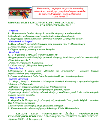 Wolontariat, to przede wszystkim naturalny odruch serca, który przynagla każdego człowieka do pomocy drugiemu - swemu bliźniemu. - Jan Paweł II PROGRAM PRACY SZKOLNEGO KLUBU WOLONTARIATU NA ROK SZKOLNY 20011/ 2012 Wrzesień 1. Motywowanie i nabór chętnych uczniów do pracy w wolontariacie. 2. Spotkanie z wolontariuszami : omówienie zadań do realizacji. 3. Rozpoczęcie całorocznej akcji zbierania nakrętek „Zakręcona akcja”. Październik –Listopad 1. Akcja „Znicz”- uprzątnięcie terenu przy pomniku rtm. W.Moczulskiego 2. Pomoc w akcji „Góra Grosza” 3. Objęcie opieką i pomocą w nauce kolegów. Grudzień 1. 5- 9 grudnia TYDZIEŃ WOLONTARIATU -Zorganizowanie zbiórki odzieży, zabawek słodyczy, środków czystości w ramach akcji „Szlachetna paczka” - Pomoc w organizacji Kiermaszu. 2. Udział w akcji „Wszystkie kolory świata” Styczeń- Luty 1.Organizacja I etapu akcji „Poczytaj mi, przyjacielu” – czytanie książek przedszkolakom (raz w tygodniu). 2. Pomoc w obchodach Dnia Zakochanych-kartki, poczta walentynkowa. Marzec- Kwiecień 1. Akcja „Znicz” - Kwiecień – Miesiącem Pamięci Narodowej – uprzątniecie grobu żołnierzy w Tołkaczewie. 2.Pomoc w przygotowaniach do Świąt Wielkanocnych -Wykonanie i sprzedaż kartek świątecznych, pisanek, ozdób -Organizacja zbiórki odzieży, zabawek słodyczy, środków czystości dla rodzin ubogich z terenu naszego powiatu. Maj-Czerwiec 1. Organizacja II etapu akcji „Poczytaj mi, przyjacielu” – czytanie książek uczniom klas I-III(raz w tygodniu). 2.Zakończenie całorocznej akcji zbierania nakrętek . 3. Podsumowanie całorocznej pracy Szkolnego Klubu Wolontariatu. SZKOLNY KLUB WOLONTARIATU ŚCIŚLE WSPÓŁPRACUJE Z SAMORZĄDEM SZKOLNYM DZIAŁAJĄCYM NA TERENIE NASZEJ SZKOŁY. Opiekun SKW – A. Grzegorczyk CELE PROGRAMU: - przełamywanie barier: wiekowych, pokoleniowych, intelektualnych, - wspieranie talentów i zdolności młodych osób, - zapobieganie: niedowartościowaniu, zagubieniu się młodych ludzi , - otwieranie się na potrzeby i problemy innych ludzi, którzy są dla nas darem, - właściwe wykorzystanie czasu wolnego GŁÓWNE ZAŁOŻENIA PROGRAMU: Program działania szkolnego wolontariatu zakłada pracę, której zadaniem jest wychowanie uczniów w kulturze solidarności i otwartości, w gotowości do dania daru z siebie. Stwarza okazję do wyszukiwania autorytetów i budowania świata wartości, pomaga w rozwijaniu zainteresowań, w szukaniu pożytecznej formy spędzania czasu wolnego. UWAGI O REALIZACJI PROGRAMU: Program obejmuje wszystkich chętnych uczniów naszej szkoły. Wszystkim działaniom przewodzi grupa wolontariuszek – uczennice klasy VI. Praca w wolontariacie wymaga zaangażowania, odpowiedzialności, otwarcia się na drugiego człowieka - co być może wpłynie pozytywnie na rozwój ich osobowości i jest ważne i pożądane ze względu na wymiar edukacyjno- wychowawczy. Poprzez pracę w wolontariacie chcemy zmienić sytuację, oczywiście na ile możemy, osób które czują się opuszczone, samotne . Wolontariat działa przez cały rok szkolny. EWALUACJA: -sprawozdanie z pracy Klubu Szkolnego Wolontariatu -zdjęcia -podziękowania od osób i instytucji - ew. potwierdzenia wpłat na konta fundacji -zamieszczenie informacji o działalności w Internecie (http://dolistowo.jaswily.pl/dolistowo/) Treści programu wolontariatu skoordynowane z Programem Pracy Szkoły oraz Programem Wychowawczym i Profilaktycznym SP w Dolistowie. Program zgodny są z Podstawą prawną - Ustawa z dnia 24 kwietnia 2003r. o działalności pożytku publicznego i o wolontariacie / Dz. U. z dnia 29 maja 2003r.