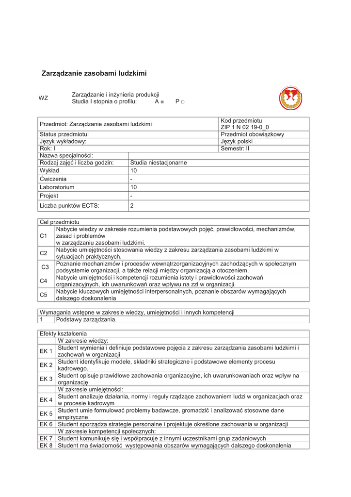 Zarz dzanie zasobami ludzkimi WZ Zarz dzanie i in ynieria produkcji Studia I stopnia o profilu: A P Przedmiot: Zarz dzanie zasobami ludzkimi Status przedmiotu: J zyk wykładowy: Rok: I Nazwa specjalno ci: Rodzaj zaj i liczba godzin: Wykład wiczenia Laboratorium Projekt Studia niestacjonarne 10 10 - Liczba punktów ECTS: 2 Kod przedmiotu ZIP 1 N 02 19-0_0 Przedmiot obowi zkowy J zyk polski Semestr: II Cel przedmiotu Nabycie wiedzy w zakresie rozumienia podstawowych poj , prawidłowo ci, mechanizmów, C1 zasad i problemów w zarz dzaniu zasobami ludzkimi. Nabycie umiej tno ci stosowania wiedzy z zakresu zarz dzania zasobami ludzkimi w C2 sytuacjach praktycznych. Poznanie mechanizmów i procesów wewn trzorganizacyjnych zachodz cych w społecznym C3 podsystemie organizacji, a tak e relacji mi dzy organizacj a otoczeniem. Nabycie umiej tno ci i kompetencji rozumienia istoty i prawidłowo ci zachowa C4 organizacyjnych, ich uwarunkowa oraz wpływu na zzl w organizacji. Nabycie kluczowych umiej tno ci interpersonalnych, poznanie obszarów wymagaj cych C5 dalszego doskonalenia Wymagania wst pne w zakresie wiedzy, umiej tno ci i innych kompetencji 1 Podstawy zarz dzania. Efekty kształcenia W zakresie wiedzy: Student wymienia i definiuje podstawowe poj cia z zakresu zarz dzania zasobami ludzkimi i EK 1 zachowa w organizacji Student identyfikuje modele, składniki strategiczne i podstawowe elementy procesu EK 2 kadrowego. Student opisuje prawidłowe zachowania organizacyjne, ich uwarunkowaniach oraz wpływ na EK 3 organizacj W zakresie umiej tno ci: Student analizuje działania, normy i reguły rz dz ce zachowaniem ludzi w organizacjach oraz EK 4 w procesie kadrowym Student umie formułowa problemy badawcze, gromadzi i analizowa stosowne dane EK 5 empiryczne EK 6 Student sporz dza strategie personalne i projektuje okre lone zachowania w organizacji W zakresie kompetencji społecznych: EK 7 Student komunikuje si i współpracuje z innymi uczestnikami grup zadaniowych EK 8 Student ma wiadomo wyst powania obszarów wymagaj cych dalszego doskonalenia EK 9 Student posiada zdolno odczytywania swoich kluczowych umiej tno ci interpersonalnych Tre ci programowe przedmiotu Forma zaj – wykłady Tre ci programowe Przedmiot, uwarunkowania, znaczenie i ewolucja zarz dzania zasobami ludzkimi – problemy terminologiczne. Kapitał ludzki i kapitał intelektualny organizacji. Modele, składniki, podmioty i narz dzia zarz dzania zasobami ludzkimi. Formy zatrudnienia. Struktura i tre podstawowych elementów procesu kadrowego W2 – planowanie kadr, pozyskiwanie, doskonalenie i rozwój pracowników. Uwarunkowania zewn trzne i wewn trzne zachowa ludzi w organizacji. Struktura i tre podstawowych elementów procesu kadrowego - kierowanie lud mi i W3 przewodzenie ludziom, ocenianie pracowników, motywowanie pozafinansowe, wynagradzanie pracowników i odej cia pracowników. Systemy informacji personalnej. Komunikacja interpersonalna w organizacji. W4 Procesy decyzyjne. Elementy etyki zachowa . Patologie we współczesnych organizacjach. Strategiczne aspekty zarz dzania zasobami ludzkimi. Metody doskonalenia i kształtowania kompetencji pracowników. Nowe technologie a W5 zachowania ludzi. E–learning. Suma godzin: Forma zaj – wiczenia W1 Tre ci programowe W1 W2 W3 W4 W5 Narz 1 2 3 4 Wprowadzenie do zarz dzania zasobami ludzkimi w praktyce – wiczenie, Zarz dzanie pracownikami w przedsi biorstwach globalnych – aspekty mi dzykulturowe. Pozyskiwanie kadr, planowanie cie ek kariery w przedsi biorstwie, doskonalenie i rozwój pracowników. Uwarunkowania zewn trzne i wewn trzne zachowa ludzi w organizacji – scenki, gry, wiczenia, dyskusja dydaktyczna. ródła i przejawy władzy w organizacji – case study, wiczenia praktyczne. Strategiczne problemy zarz dzania zasobami ludzkimi w polskich przedsi biorstwach. Kształtowanie kompetencji współczesnego mened era – analiza wybranych przykładów, dyskusja dydaktyczna. Kierowanie zespołem pracowniczym. Ocenianie pracowników - aspekty praktyczne – analiza arkuszy cennych, rozmowa oceniaj ca. Motywowanie finansowe i pozafinansowe. Problem odej pracowniczych – wiczenia i dyskusja. Systemy warto ci jako przejaw etycznego zarz dzania w przedsi biorstwie – analiza kodeksów etycznych. Komunikacja społeczna w organizacji. Procesy negocjacyjne, odkrywanie bariercase study, wiczenia praktyczne. Wypalenie zawodowe, stres – przyczyny, przejawy, przezwyci anie. Metody i instrumenty kształtowania prawidłowych zachowa organizacyjnych- case study, dyskusja dydaktyczna. Komunikacja mi dzykulturowa w organizacjach mi dzynarodowych, Nowe technologie a zachowania ludzi- wiczenie praktyczne, dyskusja dydaktyczna. Podsumowanie zaj – omawianie cało ciowe przedmiotu na podstawie ocen cz stkowych. Zaliczenie wicze . Suma godzin: Liczba godzin 2 2 2 2 2 10 Liczba godzin 2 2 2 2 2 10 dzia dydaktyczne Prezentacja multimedialna. Case study/Gry symulacyjne Przykładowe strategie kadrowe Dyskusja dydaktyczna Sposoby oceny Ocena formuj ca Kolokwium 1 ( wiczenia) – istota, cele i wyzwania nauki o zarz dzaniu zasobami ludzkimi, F1 modele i składniki zzl, planowanie i pozyskiwanie kadr, kierowanie lud mi, uwarunkowania zewn trzne i wewn trzne zachowa ludzi w organizacji, władza w organizacji. Kolokwium 2 ( wiczenia) – Wynagradzanie, motywowanie, doskonalenie i rozwój pracowników, F2 ocenianie oraz strategiczne problemy zarz dzania zasobami ludzkimi, komunikacja i aspekty etyczne. F3 Aktywno na zaj ciach Ocena podsumowuj ca P1 Obecno na wiczeniach – warunek uzyskania zaliczenia. P2 rednia ocen z dwóch kolokwiów i aktywno ci na zaj ciach. P3 Ocena z zaliczenia pisemnego (wykład). Obci enie prac studenta rednia liczba godzin na zrealizowanie aktywno ci Forma aktywno ci Godziny kontaktowe z wykładowc , realizowane w formie zaj dydaktycznych – ł czna liczba godzin w semestrze Przygotowanie si do zaj – ł czna liczba godzin w semestrze Suma Sumaryczna liczba punktów ECTS 