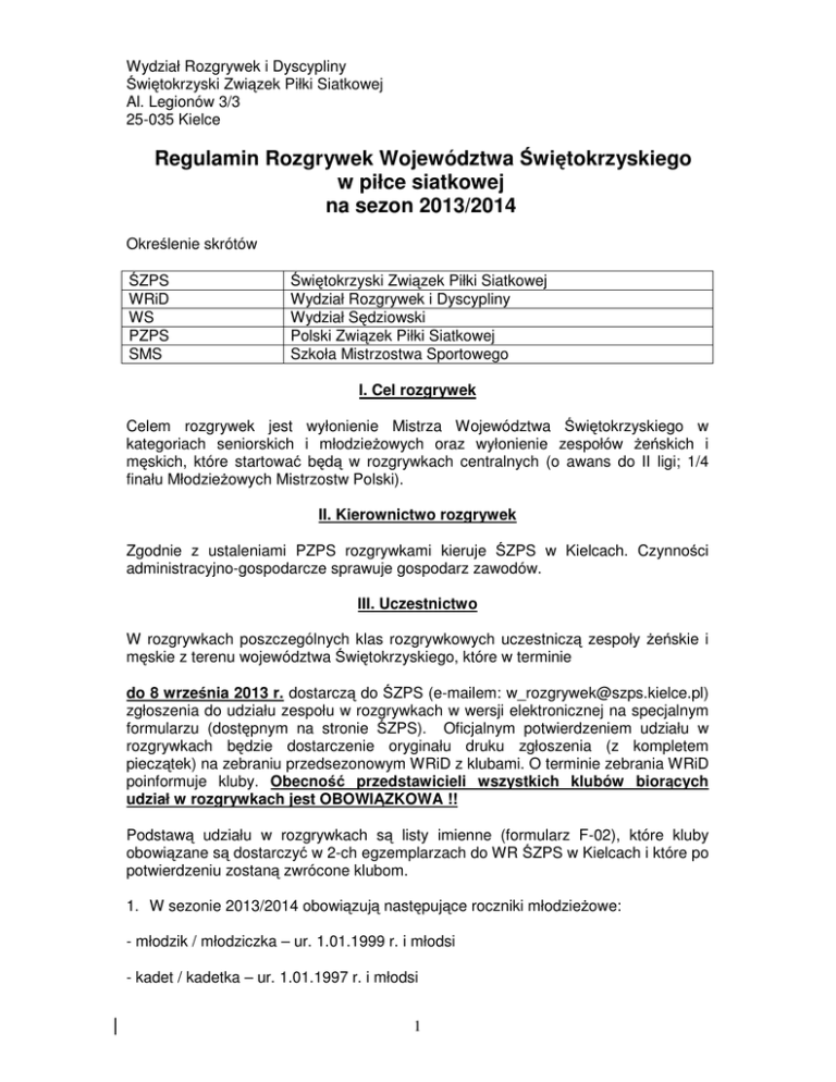 Wydział Rozgrywek i Dyscypliny Świętokrzyski Związek Piłki Siatkowej Al. Legionów 3/3 25-035 Kielce Regulamin Rozgrywek Województwa Świętokrzyskiego w piłce siatkowej na sezon 2013/2014 Określenie skrótów ŚZPS WRiD WS PZPS SMS Świętokrzyski Związek Piłki Siatkowej Wydział Rozgrywek i Dyscypliny Wydział Sędziowski Polski Związek Piłki Siatkowej Szkoła Mistrzostwa Sportowego I. Cel rozgrywek Celem rozgrywek jest wyłonienie Mistrza Województwa Świętokrzyskiego w kategoriach seniorskich i młodzieżowych oraz wyłonienie zespołów żeńskich i męskich, które startować będą w rozgrywkach centralnych (o awans do II ligi; 1/4 finału Młodzieżowych Mistrzostw Polski). II. Kierownictwo rozgrywek Zgodnie z ustaleniami PZPS rozgrywkami kieruje ŚZPS w Kielcach. Czynności administracyjno-gospodarcze sprawuje gospodarz zawodów. III. Uczestnictwo W rozgrywkach poszczególnych klas rozgrywkowych uczestniczą zespoły żeńskie i męskie z terenu województwa Świętokrzyskiego, które w terminie do 8 września 2013 r. dostarczą do ŚZPS (e-mailem: [email protected]) zgłoszenia do udziału zespołu w rozgrywkach w wersji elektronicznej na specjalnym formularzu (dostępnym na stronie ŚZPS). Oficjalnym potwierdzeniem udziału w rozgrywkach będzie dostarczenie oryginału druku zgłoszenia (z kompletem pieczątek) na zebraniu przedsezonowym WRiD z klubami. O terminie zebrania WRiD poinformuje kluby. Obecność przedstawicieli wszystkich klubów biorących udział w rozgrywkach jest OBOWIĄZKOWA !! Podstawą udziału w rozgrywkach są listy imienne (formularz F-02), które kluby obowiązane są dostarczyć w 2-ch egzemplarzach do WR ŚZPS w Kielcach i które po potwierdzeniu zostaną zwrócone klubom. 1. W sezonie 2013/2014 obowiązują następujące roczniki młodzieżowe: - młodzik / młodziczka – ur. 1.01.1999 r. i młodsi - kadet / kadetka – ur. 1.01.1997 r. i młodsi 1 - junior / juniorka – ur. 1.01.1995 r. i młodsi 2. Zawodnik/czka może uczestniczyć w danym cyklu rozgrywkowym w barwach tylko jednego klubu. 3. Dokumenty wymagane celem przedstawienie do weryfikacji sędziemu głównemu przed meczem (turniejem): • lista uprawnionych zawodników/czek potwierdzonej przez ŚZPS (F-02) (dotyczy zawodów szczebla centralnego); • licencje, bądź certyfikaty zawodników/czek oraz licencje trenerów, masażysty, lekarza – o potwierdzonej ważności na dany sezon; • ważne indywidualne badania lekarskie poświadczone przez lekarza uprawnionego do orzecznictwa sportowego (w rozgrywkach szczebla centralnego obowiązkowo w „Książeczkach Sportowo Lekarskich Zawodnika” wg wzoru zatwierdzonego przez PZPS) Okres ważności badań wynosi maksymalnie 6 miesięcy. • dokument tożsamości zawodnika/czki ze zdjęciem (potwierdzający datę urodzenia) • lista imienna zawodników/czek na dany mecz sporządzona wg narastającej numeracji, podpisana przez trenera 5. Zawodnik/czka nie posiadający ważnych badań lekarskich nie może uczestniczyć w zawodach 6. Na pisemnym zgłoszeniu do rozgrywek klub musi podać salę (nazwa i adres) w której będzie rozgrywał spotkania jako gospodarz oraz dzień i godzinę ich rozpoczęcia. Sala ta zostanie zweryfikowana przez sędziego głównego przed pierwszym meczem sezonu danego zespołu w roli gospodarza. 7. W rozgrywkach młodziczkach i młodzików dopuszcza się możliwość gry zawodnika na pozycji Libero. IV. System rozgrywek 1. Mistrzostwa województwa seniorów, systemy rozgrywek oraz zasady awansów i spadków określają odrębne regulaminy. 2. Mistrzem województwa w odpowiedniej kategorii młodzieżowej zostaje zespół, który wygrywa mecze finałowe w rundzie finałowej (play-off do 2-ch wygranych – dotyczy kat. junior/ka i kadet/ka) lub wygrywa turniej finałowy. W wypadku turnieju dodatkowego z udziałem zawodników/czek SMS, Mistrzem Województwa zostaje zespół, który wygra ten turniej. 3. Turniej dodatkowy rozgrywany jest wg klucza: a) jeżeli zespół z zawodnikiem/czką SMS zajmie 4 miejsce lub niższe systemem „każdy z każdym” wg tabeli Bergera – zespoły 1 – 3 z tabeli po rundzie zasadniczej i 4 zespół – z zawodnikiem/czką SMS, a prawo do organizacji turnieju zdobywa zespół, który wygrywa rundę 2 zasadniczą. (Juniorzy/rki, Kadeci/tki – turniej 2-dniowy: mecze do 3 wygranych setów; Młodzicy/czki – turniej jednodniowy: mecze do 2 wygranych setów) b) jeżeli zespół z zawodnikiem/czką SMS zajmie 3 miejsce - turniej jednodniowy systemem „każdy z każdym” wg tabeli Bergera, a prawo do organizacji turnieju zdobywa zespół, który wygrywa rundę zasadniczą. c) jeżeli zespół z zawodnikiem/czką SMS zajmie 2 miejsce rozgrywany będzie dwumecz (mecz i rewanż – sobota-niedziela), przy czym gospodarzem pierwszego meczu będzie zespół zajmujący 2 miejsce po rundzie zasadniczej. Jeżeli w przypadku dwumeczu zdobyte punkty, stosunek setów, stosunek małych punktów obu zespołów są jednakowe, to rozgrywany jest tzw. „złoty set”. „Złoty set” rozgrywany jest 15 minut po zakończeniu drugiego spotkania, na tym samym boisku, na zasadach obowiązujących w 5 secie. d) jeżeli zespół z zawodnikiem SMS wygra rundę finałową (play-off) – turniej dodatkowy nie jest rozgrywany. 4. Mistrz województwa oraz zdobywcy miejsc 2 i 3 zdobywają prawo do udziału w 1/4 finału MP w odpowiedniej kategorii wiekowej (wg Regulaminu PZPS na dany sezon rozgrywkowy). 5. Terminarze, zestawy par, grup, systemy rozgrywek, itp. na każdy sezon ustala WRiD ŚZPS po otrzymaniu pisemnych zgłoszeń od klubów i podaje do wiadomości w osobnych komunikatach lub na zebraniu organizacyjnym. V. Weryfikacja spotkań 1. Weryfikacje spotkań prowadzi WRiD ŚZPS w Kielcach. 2. Spotkania prowadzi się do trzech wygranych setów. W kategoriach młodziczek i młodzików do dwóch wygranych setów. 3. Punktacja spotkań oraz kolejność zajętych miejsc w tabeli regulują przepisy PZPS i