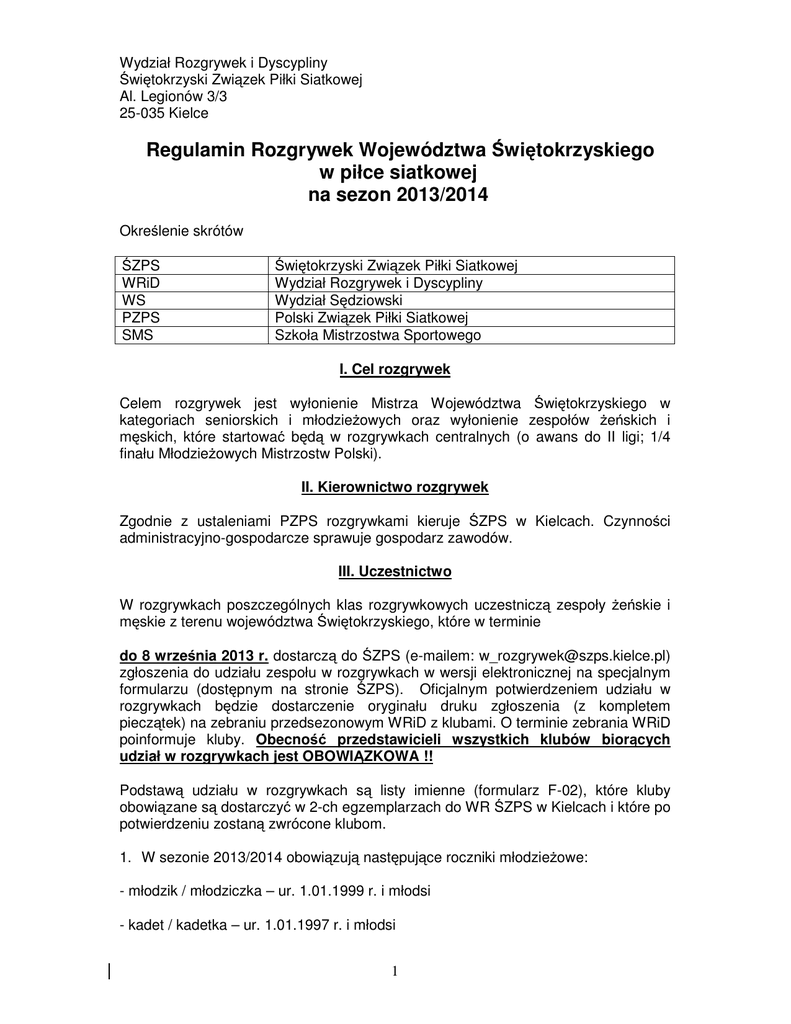 Regulamin Rozgrywek Województwa Świętokrzyskiego w piłce