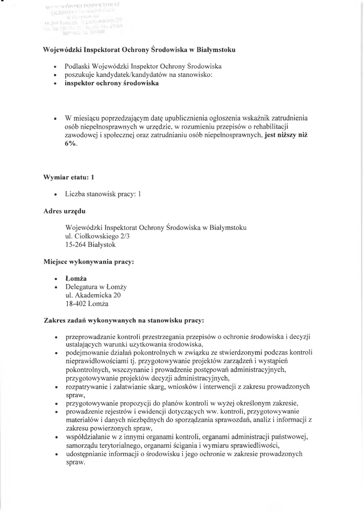 W0.TEW6D7.KT i n s p e k t o r a t OCHRON V ŚRODOWISKA W Bi&tynistoku 15-264 B iałystok, ul. CioiKoWSKiego ¿1 tal. 85 742-53-78, fax 35 74^ NIP 9SS -05-Jt)-loo Wojewódzki Inspektorat Ochrony Środowiska w Białymstoku • • • Podlaski Wojewódzki Inspektor Ochrony Środowiska poszukuje kandydatek/kandydatów na stanowisko: inspektor ochrony środowiska • W miesiącu poprzedzającym datę upublicznienia ogłoszenia wskaźnik zatrudnienia osób niepełnosprawnych w urzędzie, w rozumieniu przepisów o rehabilitacji zawodowej i społecznej oraz zatrudnianiu osób niepełnosprawnych, jest niższy niż 6%. Wymiar etatu: 1 • Liczba stanowisk pracy: 1 Adres urzędu Wojewódzki Inspektorat Ochrony Środowiska w Białymstoku ul. Ciołkowskiego 2/3 15-264 Białystok Miejsce wykonywania pracy: • • Łomża Delegatura w Łomży ul. Akademicka 20 18-402 Łomża Zakres zadań wykonywanych na stanowisku pracy: • • • • • • • przeprowadzanie kontroli przestrzegania przepisów o ochronie środowiska i decyzji ustalających warunki użytkowania środowiska, podejmowanie działań pokontrolnych w związku ze stwierdzonymi podczas kontroli nieprawidłowościami tj. przygotowywanie projektów zarządzeń i wystąpień pokontrolnych, wszczynanie i prowadzenie postępowań administracyjnych, przygotowywanie projektów decyzji administracyjnych, rozpatrywanie i załatwianie skarg, wniosków i interwencji z zakresu prowadzonych spraw, przygotowywanie propozycji do planów kontroli w wyżej określonym zakresie, prowadzenie rejestrów i ewidencji dotyczących ww. kontroli, przygotowywanie materiałów i danych niezbędnych do sporządzania sprawozdań, analiz i informacji z zakresu powierzonych spraw, współdziałanie w z innymi organami kontroli, organami administracji państwowej, samorządu terytorialnego, organami ścigania i wymiaru sprawiedliwości, udostępnianie informacji o środowisku i jego ochronie w zakresie prowadzonych spraw. Warunki pracy Warunki dotyczące charakteru pracy na stanowisku i sposobu wykonywania zadań M ogą występować niżej wymienione czynniki utrudniające wykonywanie zadań: - praca w szczególnie trudnych warunkach środowiska, - stres związany z obsługą klientów zewnętrznych i przeprowadzaniem kontroli w zakładach, - zagrożenie korupcją, - nietypowe godziny pracy (w tym dyżury telefoniczne). Miejsce i otoczenie organizacyjno-techniczne stanowiska pracy 1. Praca przy komputerze powyżej połowy dobowego wymiaru czasu pracy. 2. Stanowisko pracy usytuowane jest na piętrze budynku. 3. Brak dostosowania do potrzeb osób mających trudności z poruszaniem się po schodach. Inne Wymagania związane ze stanowiskiem pracy niezbędne • • wykształcenie: średnie pozostałe wymagania niezbędne: o Znajomość aktualnych aktów prawnych: ustawa o Inspekcji ochrony środowiska, Prawo ochrony środowiska, Prawo wodne, ustawa o odpadach, ustawa o nawozach i nawożeniu, ustawa o utrzymaniu czystości i porządku w gminach, kodeks postępowania administracyjnego wymagania dodatkowe • wykształcenie wyższe: ochrona środowiska lub inżynieria środowiska lub chemia lub biologia lub biotechnologia lub rolnictwo Wymagane dokumenty i oświadczenia: • • • • • • życiorys i list motywacyjny oświadczenie o wyrażeniu zgody na przetwarzanie danych osobowych do celów rekrutacji oświadczenie o korzystaniu z pełni praw publicznych oświadczenie o nieskazaniu prawomocnym wyrokiem za umyślne przestępstwo lub umyślne przestępstwo skarbowe kopie dokumentów potwierdzających wykształcenie kopia dokumentu potwierdzającego posiadanie polskiego obywatelstwa lub oświadczenie o posiadaniu obywatelstwa polskiego Inne dokumenty i oświadczenia kopia dokumentu potwierdzającego niepełnosprawność - w przypadku kandydatek/kandydatów, zamierzających skorzystać z pierwszeństwa w zatrudnieniu w przypadku, gdy znajdą się w gronie najlepszych kandydatek/kandydatów Termin składania dokumentów: 25-10-2015 Miejsce składania dokumentów: Wojewódzki Inspektorat Ochrony Środowiska Ciołkowskiego 2/3 15-264 Białystok z dopiskiem: "oferta pracy - inspektor ochrony środowiska" Inne informacje: Oferty niekompletne lub wpływające po terminie (decyduje data stempla pocztowego) nie będą brane pod uwagę. Życiorys, list motywacyjny oraz oświadczenia powinny być opatrzone własnoręcznym podpisem kandydata. Informacje dla osób zakwalifikowanych do kolejnych etapów rekrutacji zostaną zamieszczone na stronie internetowej urzędu www.wios.bialystok.pl oraz w Biuletynie Informacji Publicznej urzędu. Oferty odrzucone zostaną komisyjnie zniszczone. Dodatkowe informacje można uzyskać pod nr tel. (085) 742 80 75. Nasz urząd jest pracodawcą równych szans i wszystkie aplikacje są rozważane z równą uwagą bez względu na płeć, wiek, niepełnosprawność, rasę, narodowość, przekonania polityczne, przynależność związkową pochodzenie etniczne, wyznanie, orientację seksualną czy też jakąkolwiek inną cechę prawnie chronioną. Zachęcamy do zapoznania się z Procedurą naboru do służby cywilnej w Wojewódzkim Inspektoracie Ochrony Środowiska w Białymstoku oraz do skorzystania z wzorów oświadczeń dla kandydata zamieszczonych na stronie internetowej urzędu www.wios.bialystok.pl w zakładce Nabór do służby cywilnej. Zachęcamy osoby niepełnosprawne do wzięcia udziału w postępowaniu. D v rektor W ojew ódzkiego Inspektoratu O ch ro n y Środow isk?