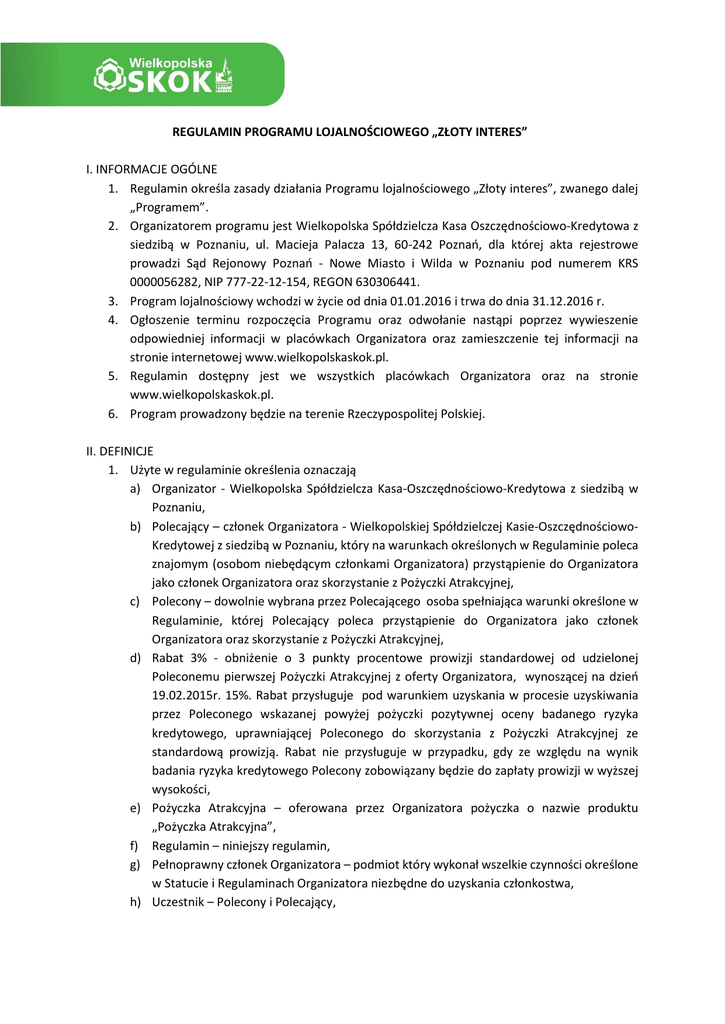 REGULAMIN PROGRAMU LOJALNOŚCIOWEGO „ZŁOTY INTERES” I. INFORMACJE OGÓLNE 1. Regulamin określa zasady działania Programu lojalnościowego „Złoty interes”, zwanego dalej „Programem”. 2. Organizatorem programu jest Wielkopolska Spółdzielcza Kasa Oszczędnościowo-Kredytowa z siedzibą w Poznaniu, ul. Macieja Palacza 13, 60-242 Poznań, dla której akta rejestrowe prowadzi Sąd Rejonowy Poznań - Nowe Miasto i Wilda w Poznaniu pod numerem KRS 0000056282, NIP 777-22-12-154, REGON 630306441. 3. Program lojalnościowy wchodzi w życie od dnia 01.01.2016 i trwa do dnia 31.12.2016 r. 4. Ogłoszenie terminu rozpoczęcia Programu oraz odwołanie nastąpi poprzez wywieszenie odpowiedniej informacji w placówkach Organizatora oraz zamieszczenie tej informacji na stronie internetowej www.wielkopolskaskok.pl. 5. Regulamin dostępny jest we wszystkich placówkach Organizatora oraz na stronie www.wielkopolskaskok.pl. 6. Program prowadzony będzie na terenie Rzeczypospolitej Polskiej. II. DEFINICJE 1. Użyte w regulaminie określenia oznaczają a) Organizator - Wielkopolska Spółdzielcza Kasa-Oszczędnościowo-Kredytowa z siedzibą w Poznaniu, b) Polecający – członek Organizatora - Wielkopolskiej Spółdzielczej Kasie-OszczędnościowoKredytowej z siedzibą w Poznaniu, który na warunkach określonych w Regulaminie poleca znajomym (osobom niebędącym członkami Organizatora) przystąpienie do Organizatora jako członek Organizatora oraz skorzystanie z Pożyczki Atrakcyjnej, c) Polecony – dowolnie wybrana przez Polecającego osoba spełniająca warunki określone w Regulaminie, której Polecający poleca przystąpienie do Organizatora jako członek Organizatora oraz skorzystanie z Pożyczki Atrakcyjnej, d) Rabat 3% - obniżenie o 3 punkty procentowe prowizji standardowej od udzielonej Poleconemu pierwszej Pożyczki Atrakcyjnej z oferty Organizatora, wynoszącej na dzień 19.02.2015r. 15%. Rabat przysługuje pod warunkiem uzyskania w procesie uzyskiwania przez Poleconego wskazanej powyżej pożyczki pozytywnej oceny badanego ryzyka kredytowego, uprawniającej Poleconego do skorzystania z Pożyczki Atrakcyjnej ze standardową prowizją. Rabat nie przysługuje w przypadku, gdy ze względu na wynik badania ryzyka kredytowego Polecony zobowiązany będzie do zapłaty prowizji w wyższej wysokości, e) Pożyczka Atrakcyjna – oferowana przez Organizatora pożyczka o nazwie produktu „Pożyczka Atrakcyjna”, f) Regulamin – niniejszy regulamin, g) Pełnoprawny członek Organizatora – podmiot który wykonał wszelkie czynności określone w Statucie i Regulaminach Organizatora niezbędne do uzyskania członkostwa, h) Uczestnik – Polecony i Polecający, i) Sklep AIKON – sklep internetowy prowadzony przez Aikon Poznań Sp. z o. o. z siedzibą w Poznaniu, dla której Sąd Rejonowy Poznań - Nowe Miasto i Wilda W Poznaniu, VIII Wydział Gospodarczy Krajowego Rejestru Sądowego prowadzi akta rejestrowe pod nr KRS 0000438751, NIP 7831693498, REGON 302266684, j) Bon – dokument uprawniający do umniejszenia ceny brutto towarów w sklepie AIKON na warunkach określonych w niniejszym regulaminie, k) Kupon - formularz potwierdzający uczestniczenie w Programie. Wzór kuponu określony został w załączniku nr 1 do Regulaminu. III. WARUNKI PRZYSTĄPIENIA DO PROGRAMU 1. Do Programu mogą przystąpić jako Uczestnicy tylko osoby pełnoletnie, posiadające pełną zdolność do czynności prawnych. W Programie nie mogą brać udziału pracownicy Organizatora. Uczestnikiem programu nie może być osoba której małżonek, dzieci, rodzice, rodzeństwo, małżonkowie rodzeństwa i dzieci rodzeństwa są pracownikami Organizatora. 2. Uczestnik przystępuje do Programu poprzez złożenie w placówce Organizatora pisemnego oświadczenia o przystąpieniu do Programu (wzór oświadczeń stanowi załącznik nr 2 do Regulaminu). 3. Organizator odmówi prawa uczestnictwa w Programie osobie, która nie spełnia łącznie warunków opisanych w punkcie III. 1 Regulaminu. 4. Uczestnictwo w Programie jest dobrowolne i nieodpłatne. IV. ZASADY SZCZEGÓŁOWE 1. Program polega na polecaniu przez Polecającego dowolnym osobom spełniającym warunki określone w Regulaminie przystąpienie do Organizatora jako członek Organizatora oraz skorzystanie z Pożyczki Atrakcyjnej. 2. Polecony otrzymuje Rabat 3% na prowizję od pierwszej Pożyczki Atrakcyjnej zawartej przez Poleconego z Organizatorem, jeśli zawarcie umowy Pożyczki Atrakcyjnej nastąpiło w terminie 3 miesięcy od przystąpienia do Organizatora, w wyniku polecenia przez Polecającego na warunkach określonych w Regulaminie. 3. Polecający otrzymuje od Organizatora Bon o wartości 50,00 zł. w przypadku, gdy z jego polecenia do Organizatora jako nowy pełnoprawny członek przystąpi nowa osoba – Polecony. 4. Polecający otrzymuje bon o wartości 10,00 zł. za każdy 1000,00 zł. kwoty pierwszej Pożyczki Atrakcyjnej zawartej przez Poleconego z Organizatorem w przypadku, gdy z jego (Polecającego) polecenia doszło do zawarcia umowy Pożyczki Atrakcyjnej w terminie 7 dni roboczych od dnia przystąpienia przez Poleconego jako członek do Organizatora. Przy ustaleniu wartości bonu uwzględniana jest wysokość wypłaconej Poleconemu kwoty Pożyczki Atrakcyjnej. Bony określone w niniejszym punkcie regulaminu przysługują wyłącznie maksymalnie do wartości 10.000,00 zł. udzielonej Poleconemu Pożyczki Atrakcyjnej co oznacza, że maksymalnie za jedną pożyczkę zawartą w wyniku polecenia przez Polecającego, Polecający może otrzymać maksymalnie bony o wartości 100,00 zł. 5. Nie ma prawa do bonów Polecający a Polecony do Rabatu 3 % jeśli Polecony nie zgłosi faktu polecenia pracownikowi Organizatora i nie przekaże Organizatorowi wypełnionego Kuponu zgodnie z warunkami określonymi w Regulaminie. 6. Polecający nie ma prawa do bonów wskazanych w pkt. IV. 3 i IV 4 Regulaminu jeśli Polecony nie wyrazi zgody na udzielenie Polecającemu przez