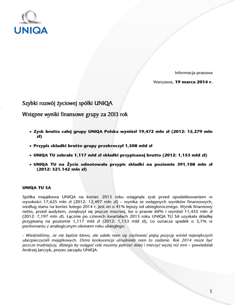 Informacja prasowa Warszawa, 19 marca 2014 r. Szybki rozwój życiowej spółki UNIQA Wstępne wyniki finansowe grupy za 2013 rok Zysk brutto całej grupy UNIQA Polska wyniósł 19,472 mln zł (2012: 15,279 mln zł) Przypis składki brutto grupy przekroczył 1,508 mld zł UNIQA TU zebrała 1,117 mld zł składki przypisanej brutto (2012: 1,153 mld zł) UNIQA TU na Życie odnotowała przypis składki na poziomie 391,108 mln zł (2012: 321,142 mln zł) UNIQA TU SA Spółka majątkowa UNIQA na koniec 2013 roku osiągnęła zysk przed opodatkowaniem w wysokości 17,625 mln zł (2012: 12,497 mln zł) – wynika ze wstępnych wyników finansowych, według stanu na koniec lutego 2014 r. Jest on o 41% lepszy od ubiegłorocznego. Wynik finansowy netto, przed audytem, zwiększył się jeszcze mocniej, bo o prawie 60% i wyniósł 11,455 mln zł (2012: 7,197 mln zł). Łącznie po czterech kwartałach 2013 roku UNIQA TU SA uzyskała składkę przypisaną na poziomie 1,117 mld zł (2012: 1,153 mld zł), co oznacza spadek o 3,1% w porównaniu z analogicznym okresem roku ubiegłego. - Wiedzieliśmy, że nie będzie łatwo, ale udało nam się zachować piątą pozycję wśród największych ubezpieczycieli majątkowych. Ostra konkurencja utrudniała nam to zadanie. Rok 2014 może być jeszcze trudniejszy, dlatego by osiągać cele musimy patrzeć dalej i mierzyć wyżej niż inni – powiedział Andrzej Jarczyk, prezes zarządu UNIQA. 1 Systematyczne polepszanie wyników to efekt m.in. ciągłej poprawy struktury portfela, w którym wzrasta udział najbardziej rentownych produktów. Pozytywne skutki widać było przede wszystkim w ubezpieczeniach majątkowych, w których spółka osiągnęła w 2013 roku prawie 10% wzrost składki przypisanej. Jego źródłem były głównie ubezpieczenia korporacyjne, których udział w portfelu UNIQA nadal rośnie i stanowi już jedną czwartą portfela oraz ubezpieczenia skierowane do szeroko pojętego sektora mieszkalnictwa. Łącznie udział ubezpieczeń majątkowych w składce przypisanej spółki wzrósł w 2013 roku do prawie 45%, z 39,5%. Jednocześnie dzięki racjonalnej polityce oceny ryzyka (underwritingu) szkodowość ubezpieczeń majątkowych za rok 2013 nie przekroczyła 40% pomimo negatywnego wpływu pojedynczych dużych szkód i letniej fali deszczy nawalnych. Spółka zanotowała w 2013 roku spadek sprzedaży w ubezpieczeniach komunikacyjnych o 11,7%. Ponad połowa tego spadku była spowodowana efektami jednorazowymi związanymi przede wszystkim z eliminacją z portfela najbardziej nierentownych umów. Pozostała część zmniejszenia sprzedaży wynika z czynników rynkowych. Według oceny spółki, rynek ubezpieczeń komunikacyjnych zanotował w roku 2013 spadek na poziomie 5-6%, co jest wynikiem utrzymującej się wojny cenowej. - Wiele wskazuje na to, że w roku 2013 spółce udało się zachować 7. pozycję w rankingu ubezpieczycieli komunikacyjnych. W OC awansowała z pozycji 6. na 5., natomiast w AC utrzymała 7. miejsce - dodał Andrzej Jarczyk, prezes zarządu UNIQA. Zwiększanie udziału w portfelu ubezpieczeń majątkowym, przy jednoczesnym utrzymaniu dobrej jakości bieżącego portfela komunikacyjnego przełożyło się na poprawę wskaźnika szkodowości brutto, który wyniósł w 2013 roku 64,7% i był lepszy o 4,4 pkt proc. od zanotowanego w roku 2012. UNIQA TU na Życie S.A. W roku 2013 UNIQA TU na Życie SA osiągnęła bardzo dobre wyniki sprzedażowe – wynika z danych finansowych przed audytem. Składka przypisana brutto za cały 2013 rok wyniosła 391,108 mln zł (2012: 321,142 mln zł), co oznacza wzrost na poziomie 22%, czyli znacznie wyższy niż wykazywany przez rynek po 3 kwartałach (ostatnie dostępne dane rynkowe). - Oceniamy, że UNIQA TU na Życie była jedną z najszybciej rosnących spółek na rynku ubezpieczeń na życie w roku 2013. Wynika to z rozwoju sprzedaży polis z ubezpieczeniowymi funduszami kapitałowymi w kanale bankowym oraz ubezpieczeń grupowych, których sukces podyktowała nowa strategia, wprowadzona w 2012 r. – przekonuje Andrzej Jarczyk. Wartość składki regularnej wyniosła 93,690 mln zł, co oznacza wzrost w porównaniu z rokiem poprzednim o 11,7%. Przypis składki jednorazowej zwiększył się o 25%, a wartość składki 2 ukształtowała się na poziomie 297,418 mln zł. W portfelu ubezpieczeń dla składki regularnej dominowały ubezpieczenia grupowe, których udział w portfelu wyniósł 57,5%. Dynamiczne wzrosty przypisu UNIQA TU na Życie zanotowała również w innych grupach produktowych: ubezpieczenia indywidualne, ubezpieczenia z funduszami kapitałowymi czy produkty sprzedawane we współpracy z partnerami leasingowymi. Składka jednorazowa zrealizowana została głównie za sprawą sprzedaży ubezpieczeń z funduszem kapitałowym (unit-linked), których sprzedaż wyniosła 249,814 mln zł (w porównaniu z 106,335 mln rok wcześniej). Dynamiczny rozwój sprzedaży oraz ścisła kontrola poziomu ponoszonych kosztów przyczyniły się do osiągnięcia wyniku finansowego, zgodnego z założeniami. Według wstępnych danych, według stanu na koniec lutego, zysk netto UNIQA TU na Życie S.A. w 2013 roku wyniósł 1,371 mln (2012: 2,240 mln zł). Wynik finansowy brutto ukształtował się na poziomie 1,847 mln zł (2012: 2,782 mln zł). UNIQA Polska Grupę UNIQA w Polsce reprezentują spółki UNIQA TU SA oraz UNIQA TU na Życie SA, oferujące ubezpieczenia majątkowe, komunikacyjne i życiowe, zarówno dla klientów indywidualnych, jak i instytucjonalnych. Obecnie UNIQA TU SA zajmuje 5. pozycję na rynku ubezpieczeniowym pod względem wysokości składki przypisanej brutto, która w 2012 wyniosła ponad 1,15 mld zł. Dzięki rozbudowanej sieci sprzedaży oraz zaangażowaniu ponad 3 000 agentów, UNIQA jest blisko klientów, zapewniając im profesjonalne doradztwo i pomoc w wyborze ubezpieczenia. Produkty UNIQA można kupić zarówno w ramach sieci wyłącznej, liczącej około 130 plac
