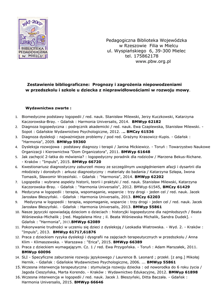 Pedagogiczna Biblioteka Wojewódzka w Rzeszowie Filia w Mielcu ul. Wyspiańskiego 6, 39-300 Mielec tel. 175862178 www.pbw.org.pl Zestawienie bibliograficzne: Prognozy i zagrożenia niepowodzeniami w przedszkolu i szkole u dziecka z nieprawidłowościami w rozwoju mowy. Wydawnictwa zwarte : Biomedyczne podstawy logopedii / red. nauk. Stanisław Milewski, Jerzy Kuczkowski, Katarzyna Kaczorowska-Bray. - Gdańsk : Harmonia Universalis, 2014. BMWyp 62182 2. Diagnoza logopedyczna : podręcznik akademicki / red. nauk. Ewa Czaplewska, Stanisław Milewski. Sopot : Gdańskie Wydawnictwo Psychologiczne, 2012. ... BMCzy 61536 3. Diagnoza dysleksji : najważniejsze problemy / pod red. Grażyny Krasowicz-Kupis. - Gdańsk : "Harmonia", 2009. BMWyp 59360 4. Dysleksja rozwojowa : podstawy diagnozy i terapii / Janina Mickiewicz. - Toruń : Towarzystwo Naukowe Organizacji i Kierownictwa "Dom Organizatora", 2011. BMWyp 61648 5. Jak zachęcić 2-latka do mówienia? : logopedyczny poradnik dla rodziców / Marzena Bekus-Richane. - Kraków : "Impuls", 2015. BMWyp 66720 6. Kwestionariusz diagnostyczny zaburzeń mowy ze szczególnym uwzględnieniem afazji i dysartrii dla młodzieży i dorosłych : arkusz diagnostyczny : materiały do badania / Katarzyna Szłapa, Iwona Tomasik, Sławomir Wrzesiński. - Gdańsk : "Harmonia", 2014. BMWyp 62202 7. Logopedia : wybrane aspekty historii, teorii i praktyki / red. nauk. Stanisław Milewski, Katarzyna Kaczorowska-Bray. - Gdańsk : "Harmonia Universalis", 2012. BMWyp 61545, BMCzy 61429 8. Medycyna w logopedii : terapia, wspomaganie, wsparcie : trzy drogi - jeden cel / red. nauk. Jacek Jarosław Błeszyński. - Gdańsk : Harmonia Universalis, 2013. BMCzy 62203 9. Medycyna w logopedii : terapia, wspomaganie, wsparcie : trzy drogi - jeden cel / red. nauk. Jacek Jarosław Błeszyński. - Gdańsk : Harmonia Universalis, 2013. BMWyp 55861 10. Nasze języczki opowiadają dzieciom o dzieciach : historyjki logopedyczne dla najmłodszych / Beata Wiśniewska-Michalik ; [red. Magdalena Hinz ; il. Beata Wiśniewska Michalik, Sandra Dudek]. Gdańsk : "Harmonia", 2013.BMWyp 62089 11. Pokonywanie trudności w uczeniu się dzieci z dysleksją / Leokadia Wiatrowska. - Wyd. 2. - Kraków : "Impuls", 2013. BMWyp 61717,61876 12. Praca z dzieckiem ryzyka dysleksji i dysgrafii na zajęciach terapeutycznych w przedszkolu / Anna Klim - Klimaszewska. - Warszawa : "Erica", 2015. BMWyp 66389 13. Praca z dzieckiem wymagającym. Cz. 1 / red. Ewa Przygońska. - Toruń : Adam Marszałek, 2011. BMWyp 60096 14. SLI - Specyficzne zaburzenie rozwoju językowego / Laurence B. Leonard ; przekł. [z ang.] Mikołaj Hernik. - Gdańsk : Gdańskie Wydawnictwo Psychologiczne, 2006. ... BMWyp 55861 15. Wczesna interwencja terapeutyczna : stymulacja rozwoju dziecka : od noworodka do 6 roku życia / Jagoda Cieszyńska, Marta Korendo. - Kraków : Wydawnictwo Edukacyjne, 2012. BMWyp 61898 16. Wczesna interwencja w logopedii / red. nauk. Jacek J. Błeszyński, Ditta Baczała. - Gdańsk : Harmonia Universalis, 2015. BMWyp 66646 1. 17. Wokół dysleksji : co warto wiedzieć o dysleksji i nowoczesnych sposobach przeciwdziałania jej / pod red. nauk. Zofii Pomirskiej. - Warszawa : "Difin", 2010. BMWyp 59767 18. Wspomaganie rozwoju dziecka z ryzyka dysleksji / pod red. Anety Rudzińskiej-Rogoży. - Wyd. 2. Kraków : "Impuls", 2014. ... BMWyp 62311, 61560 19. Teksty z ćwiczeniami wspomagającymi rozwój mowy i języka dziecka : zeszyt logopedyczny / Dorota Rumieńczyk. - Kraków : "Impuls", 2007 BMWyp 57060 20. Zabawy logopedyczne i łatwe ćwiczenia / Kinga Kozłowska. - Kielce : Wydawnictwo Pedagogiczne ZNP, 2005. BMWyp 55745 Czasopisma : 1. Diagnoza różnicująca zaburzenia mowy u dzieci z alalią i niepełnosprawnością intelektualną / Raisa I. Lalaeva.// Szkoła Specjalna. - 2009, nr 3, s. 184-191, bibliogr. 2. Dyslalia czy opóźniony rozwój mowy - o trudnościach w określaniu i klasyfikowaniu zaburzeń mowy w okresie przedszkolnym / Kinga Kuszak.// Szkoła Specjalna. - 2007, nr 3, s. 206-213, bibliogr. 3. Dzieci afatyczne – diagnozowanie / Anna paluch, Elżbieta Drewniak-Wołosz. //Forum 4. Logopeda w roli diagnosty / Zbigniew Tarkowski. // Forum Logopedy. – 2016, nr 11, s. 4-8 5. Rozwój mowy dziecka i jego wspomaganie / Aneta Stukan.// Bliżej Przedszkola. - 2012, nr 6, s. 58-60, bibliogr. 6. Wpływ mowy dorosłych na rozwój mowy dziecka w wieku szkolnym / Krystyna Marczewska.// Dyrektor Szkoły. - 2006, nr 1, s. 43-45 7. Zabawy i ćwiczenia wspomagające prawidłowy rozwój mowy / Jadwiga Matyszkiewicz.// Świetlica w Szkole. - 2008, nr 2, s. 9-10 8. Zaburzenia artykulacji u dzieci w wieku przedszkolnym / Kinga Mietz. // Bliżej Przedszkola. – 2016, nr 11, s. 24-26 9. Zadbajmy o prawidłowy rozwój mowy : część pierwsza / Alicja Dorozińska.// Bliżej Przedszkola. - 2011, nr 10, s. 38-39 10. Zadbajmy o prawidłowy rozwój mowy : część druga / Alicja Dorozińska.// Bliżej Przedszkola. - 2011, nr 11, s. 42-45 11. Jak opracować terapię dziecka z uszkodzonym narządem słuchu / Anna Pawluczuk.// Forum Logopedy. – 2016, nr 11, s.14-19 12. Karty oceny logopedycznej dziecka (KOLD) – narzędzie do diagnozy mowy dzieci w wieku od 1 miesiąca do końca 9 roku życia / Joanna Gruba.// Forum Logopedy. – 2016, nr 11, s.37-40 13. Stare i nowe testy rozwoju językowego / Zbigniew Tarkowski.// Forum Logopedy. – 2016, nr 11, s.41-44 14. Metoda werbo-tonalna w terapii logopedycznej dzieci z upośledzeniem umysłowym / Karina Kacprzyk- Mechuła // Forum Logopedy. – 2016, nr 12, s. 41-44 15. Metoda wystukiwania sylab : skuteczny program terapeutyczny w walce z jąkaniem / Iwona Banasiak, Monika Ośko. // Forum Logopedy. – 2016, nr 12, s. 49- 50 16. Tomatis.Problemy dzieci w wieku wczesnoszkolnym (klasy I – III) /Anna Sudoł, Ewa Mojs, Beata Marciniak. // Forum Logopedy. – 2016, nr 13, s. 23-24 17. Niedokształcenie mowy o typie afazji – praktyczne oblicza terapii / Elżbieta DrewniakWołosz.// Forum 