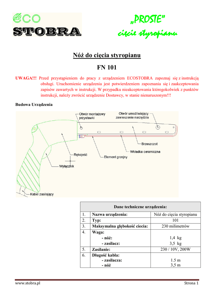 „PROSTE” cięcie styropianu Nóż do cięcia styropianu FN 101 UWAGA!!! Przed przystąpieniem do pracy z urządzeniem ECOSTOBRA zapoznaj się z instrukcją obsługi. Uruchomienie urządzenia jest potwierdzeniem zapoznania się i zaakceptowania zapisów zawartych w instrukcji. W przypadku nieakceptowania któregokolwiek z punktów instrukcji, należy zwrócić urządzenie Dostawcy, w stanie nienaruszonym!!! Budowa Urządzenia Dane techniczne urządzenia: 1. 2. 3. 4. 5. 6. www.stobra.pl Nazwa urządzenia: Typ: Maksymalna głębokość ciecia: Waga: - nóż: - zasilacz: Zasilanie: Długość kabla: - zasilacza: - nóż Nóż do cięcia styropianu 101 230 milimetrów 1,4 kg 3,5 kg 230 / 10V, 200W 1.5 m 3,5 m Strona 1 „PROSTE” cięcie styropianu OGÓLNA INSTRUKCJA BEZPIECZEŃSTWA Przed przystąpieniem do pracy należy dokładnie zapoznać się z poniższymi informacjami. Niezastosowanie się do zapisów instrukcji może narazić użytkownika na niebezpieczeństwo utraty zdrowia oraz doprowadzi do pożaru, poparzenia, porażenia prądem lub zniszczenia urządzenia. Przeznaczenia urządzenia: Nóż Termiczny ECOSTOBRA 101 jest przeznaczony do ręcznego cięcia styropianu, opracowywania otworów okiennych przy użyciu zestawu przystawek oraz wycinania geometrycznych otworów. Nóż termiczny nie jest przeznaczony do wycinania otworów owalnych, zaokrąglania krawędzi ani do cięcia drewna, metalu, szkła itp. A. Zasady ogólne: W czasie pracy z urządzeniem nie wolno dotykać elementów grzejnych, wkładki ceramicznej ani brzeszczotu, gdyż może to spowodować groźne poparzenia. Nie wolno zanurzać urządzenia w wodzie i/lub używać w stanie wilgotnym oraz stosować do cięcia mokrego materiału. Nie wolno stosować urządzenia w jakichkolwiek warunkach stwarzających ryzyko wybuchu, pożaru lub w obecności środków żrących (aktywnych chemicznie). W czasie prac budowlanych należy się upewnić, że nie ma możliwości, aby części robocze Noża mogły wejść w kontakt z instalacją elektryczną, gazową, wodną itp. W trakcie cięcia może pojawić się niewielka ilość dymu oraz drażniący zapach. Należy unikać wdychania oparów. W przypadku zaobserwowania jakichkolwiek niepokojących objawów świadczących o zatruciu i mogących mieć związek z urządzeniem, zaleca się natychmiastowy kontakt z lekarzem. Na narzędzie nie wolno wywierać nadmiernego nacisku. Może to spowodować uszkodzenie części roboczych. Wszystkie narzędzia należy utrzymywać w czystości i konserwować zgodnie z instrukcją obsługi. Wszelkie czynności serwisowe, które nie zostały opisane w niniejszej instrukcji, jako wykonywane przez użytkownika, należy bezwzględnie powierzać osobie posiadającej odpowiednie kwalifikacje. Producent nie ponosi odpowiedzialności za szkody spowodowane nieprawidłowym użyciem swoich produktów, stosowanie niezgodne z przeznaczeniem i nieumiejętnym użyciem urządzenia. W razie zaobserwowania zachowań nienaturalnych dla tego narzędzia, należy niezwłocznie przerwać pracę i skontaktować się z serwisem. B. Miejsce Pracy Miejsce pracy powinno być suche, dobrze oświetlone i wyposażone w instalację elektryczną odpowiednią do potrzeb używanych narzędzi. Zaleca się przeprowadzenie wszelkich możliwych prac na otwartej przestrzeni a w szczególności unikanie niewielkich, zamkniętych pomieszczeń pozbawionych wentylacji. W przypadku pracy pomieszczeniu zamkniętym, należy sprawdzić czy jest ono wyposażone w odpowiednią wentylację lub instalację wyciągową. Wszystkie tego typu instalacje powinny sprawne, spełniać aktualne normy i być zainstalowane przez osoby uprawnione. www.stobra.pl Strona 2 Stanowisko pracy należy utrzymywać w czystości i porządku. „PROSTE” cięcie styropianu C. Informacje dotyczące połączeń elektrycznych Urządzenie spełnia wszystkie aktualne normy krajowe. Narzędzie wyposażone jest w odpowiedni kabel zasilający wyposażony we wtyczkę umożliwiającą podłączenie do gniazda zasilacza. W razie jakiegokolwiek uszkodzenia kabla należy zlecić jego wymianę uprawnionej osobie. Nie należy ciągnąć kabla w celu wyjęcia wtyczki z gniazdka. Kabel zasilacza jest wyposażony we wtyczkę pasującą do gniazdka z bolcem uziemiającym. Dopuszczalne jest stosowanie przedłużaczy o przekroju spełniającym wymogi narzędzia. Przedłużacze na szpulach należy zawsze j rozwijać całkowicie. W myśl aktualnych przepisów narzędzie to wymaga stosowania gniazdek i przedłużaczy przystosowanych do wtyczki z dwoma bolcami i uziemieniem. PRZYGOTOWANIE URZĄDZENIA DO PRACY 1) 2) 3) 4) 5) 6) 7) 8) 9) 10) 11) Wyjąć urządzenie z pudełka lub skrzynki narzędziowej. Dokładnie sprawdzić czy urządzenie oraz przewody nie są uszkodzone. Podłączyć zasilacz do gniazda 230V z bolcem uziemiającym. Do gniazda zasilania podłączyć przewód Noża Termicznego. Element prowadzący zwilżyć sprayem sylikonowym. Przesunąć przełącznik na zasilaczu z pozycji OFF na ON. Gotowość do pracy zostanie zasygnalizowana czerwoną diodą umieszczoną w obudowie zasilacza. Urządzenie jest gotowe do pracy. Nacisnąć włącznik Noża i wykonać cięcie. Po skończeniu cięcia zwolnić włącznik. Odłożyć Nóż na przygotowane wcześniej miejsce i odczekać aż ostygnie. Odłączyć urządzenie od zasilania. Schować urządzenie do pudełka lub skrzynki narzędziowej. WŁAŚCIWA TECHNIKA PRACY Włącznik Noża należy nacisnąć na 1-2 sekundy przed wykonaniem cięcia. Po zakończeniu cięcia należy niezwłocznie zwolnić przycisk wyłącznika Noża. Cięcie należy wykonywać jednostajnym ruchem, nie wywierając nadmiernego nacisku na ostrze. Zmiana prędkości ruchu może spowodować powstanie nierówności lub deformacji na płaszczyźnie cięcia. Zbyt powolne cięcie może powodować przywieranie elementów tnących Noża do ciętego materiału. Zatrzymanie włączonego Noża w jednym położeniu może spowodować n