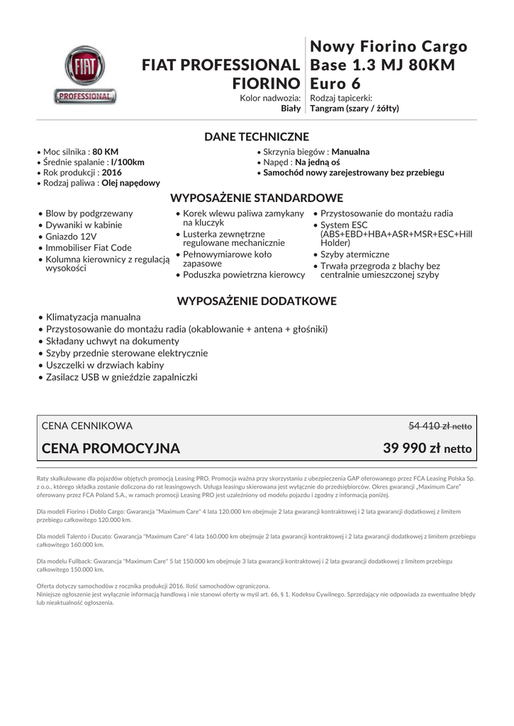 Nowy Fiorino Cargo FIAT PROFESSIONAL Base 1.3 MJ 80KM FIORINO Euro 6 Kolor nadwozia: Biały Rodzaj tapicerki: Tangram (szary / żółty) DANE TECHNICZNE • Moc silnika : 80 KM • Średnie spalanie : l/100km • Rok produkcji : 2016 • Rodzaj paliwa : Olej napędowy • Skrzynia biegów : Manualna • Napęd : Na jedną oś • Samochód nowy zarejestrowany bez przebiegu WYPOSAŻENIE STANDARDOWE • Blow by podgrzewany • Korek wlewu paliwa zamykany na kluczyk • Dywaniki w kabinie • Lusterka zewnętrzne • Gniazdo 12V regulowane mechanicznie • Immobiliser Fiat Code • Pełnowymiarowe koło • Kolumna kierownicy z regulacją zapasowe wysokości • Poduszka powietrzna kierowcy • Przystosowanie do montażu radia • System ESC (ABS+EBD+HBA+ASR+MSR+ESC+Hill Holder) • Szyby atermiczne • Trwała przegroda z blachy bez centralnie umieszczonej szyby WYPOSAŻENIE DODATKOWE • Klimatyzacja manualna • Przystosowanie do montażu radia (okablowanie + antena + głośniki) • Składany uchwyt na dokumenty • Szyby przednie sterowane elektrycznie • Uszczelki w drzwiach kabiny • Zasilacz USB w gnieździe zapalniczki CENA CENNIKOWA CENA PROMOCYJNA 54 410 zł netto 39 990 zł netto Raty skalkulowane dla pojazdów objętych promocją Leasing PRO. Promocja ważna przy skorzystaniu z ubezpieczenia GAP oferowanego przez FCA Leasing Polska Sp. z o.o., którego składka zostanie doliczona do rat leasingowych. Usługa leasingu skierowana jest wyłącznie do przedsiębiorców. Okres gwarancji „Maximum Care” oferowany przez FCA Poland S.A., w ramach promocji Leasing PRO jest uzależniony od modelu pojazdu i zgodny z informacją poniżej. Dla modeli Fiorino i Doblo Cargo: Gwarancja "Maximum Care" 4 lata 120.000 km obejmuje 2 lata gwarancji kontraktowej i 2 lata gwarancji dodatkowej z limitem przebiegu całkowitego 120.000 km. Dla modeli Talento i Ducato: Gwarancja "Maximum Care" 4 lata 160.000 km obejmuje 2 lata gwarancji kontraktowej i 2 lata gwarancji dodatkowej z limitem przebiegu całkowitego 160.000 km. Dla modelu Fullback: Gwarancja "Maximum Care" 5 lat 150.000 km obejmuje 3 lata gwarancji kontraktowej i 2 lata gwarancji dodatkowej z limitem przebiegu całkowitego 150.000 km. Oferta dotyczy samochodów z rocznika produkcji 2016. Ilość samochodów ograniczona. Niniejsze ogłoszenie jest wyłącznie informacją handlową i nie stanowi oferty w myśl art. 66, § 1. Kodeksu Cywilnego. Sprzedający nie odpowiada za ewentualne błędy lub nieaktualność ogłoszenia.
