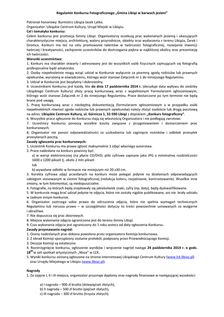 Regulamin Konkursu Fotograficznego „Gmina Libiąż w barwach jesieni” Patronat honorowy: Burmistrz Libiąża Jacek Latko. Organizator: Libiąskie Centrum Kultury, Urząd Miejski w Libiążu. Cel i tematyka konkursu: Celem konkursu jest promocja Gminy Libiąż. Organizatorzy oczekują prac wykonanych jesienią i ukazujących charakterystyczne miejsca, architekturę, walory przyrodnicze, obiekty oraz wydarzenia z terenu Libiąża, Żarek i Gromca. Konkurs ma też na celu promowanie talentów w twórczości fotograficznej, rozwijanie inwencji twórczej i kreatywności, zachęcenie uczestników do dostrzegania piękna w najbliższej okolicy oraz prezentację ich twórczości. Warunki uczestnictwa: 1. Konkurs ma charakter otwarty i adresowany jest do wszystkich osób fizycznych zajmujących się fotografią profesjonalnie bądź amatorsko. 2. Osoby niepełnoletnie mogą wziąć udział w Konkursie wyłącznie za pisemną zgodą rodziców lub prawnych opiekunów, wyrażoną w oświadczeniu, którego wzór stanowi Załącznik nr 1 do niniejszego Regulaminu. 3. Udział w Konkursie jest bezpłatny i dobrowolny. 4. Uczestnikiem Konkursu jest każdy, kto do dnia 17 października 2014 r. (decyduje data wpływu do siedziby Libiąskiego Centrum Kultury) złoży pracę konkursową wraz z wypełnionym Formularzem zgłoszeniowym, którego wzór stanowi Załącznik nr 2 do niniejszego Regulaminu. Prace dostarczone po tym terminie nie będą brane pod uwagę. 5. Pracę konkursową wraz z niezbędną dokumentacją (formularzem zgłoszeniowym a w przypadku osób niepełnoletnich również zgoda rodziców lub prawnych opiekunów) należy złożyć osobiście lub drogą pocztową na adres: Libiąskie Centrum Kultury, ul. Górnicza 1, 32-590 Libiąż z dopiskiem „Konkurs fotograficzny”. 6. Wszystkie prace zgłoszone do Konkursu stają się własnością Organizatora i nie podlegają zwrotowi. 7. Uczestnicy Konkursu ponoszą wszelkie koszty związane z przygotowaniem i dostarczeniem prac konkursowych. 8. Organizator nie ponosi odpowiedzialności za uszkodzenia lub zaginięcie nośników i odbitek przesyłek przesyłanych pocztą. Zasady zgłaszania prac konkursowych: 1. Uczestnik Konkursu ma prawo zgłosić maksymalnie 3 zdjęć własnego autorstwa. 2. Prace nadesłane na konkurs powinny być: a) w wersji elektronicznej (na płycie CD/DVD; pliki cyfrowe zapisane jako JPG o minimalnej rozdzielczości 1600 x 1200 pikseli tj. około 2 mln pikseli lub b) wywołane odbitki w formacie nie mniejszym niż 20 x30 cm. 3. Korekta cyfrowa zdjęć przesłanych na konkurs może polegać jedynie na działaniach odpowiadających zabiegom stosowanym w ciemni fotograficznej (redukcja koloru, rozjaśnianie, kontrastowanie). Wszelkie inne zmiany, w tym fotomontaż, są niedopuszczalne. 4. Fotografie, na których będą znajdowały się jakiekolwiek znaki, cyfry (np. daty), będą dyskwalifikowane. 5. W konkursie mogą brać udział jedynie te zdjęcia, które nie zostały nigdzie publikowane, ani nie brały udziału w żadnym innym konkursie. 6. Organizator zastrzega sobie prawo do odrzucenia zdjęcia, które nie spełnia wymagań technicznych Regulaminu lub narusza prawo – w szczególności dotyczy to treści powszechnie uznawanych za wulgarne i obraźliwe. 7. Nie dopuszcza się prac zbiorowych. 8. Miejsce wykonania zdjęcia ograniczone jest do terenu Gminy Libiąż. 9. Czas wykonania zdjęcia jest ograniczony do 1 roku wstecz od daty ogłoszenia Konkursu. Zasady przyznawania nagród: 1. Oceny nadesłanych prac dokona powołana przez organizatora Komisja konkursowa. 2. Z obrad Komisji sporządzony zostanie protokół, podpisany przez Przewodniczącego Komisji. 3. Decyzje Komisji są ostateczne. 4. Rozstrzygnięcie konkursu, ogłoszenie wyników i wręczenie nagród nastąpi 24 października 2014 r. o godz. 00 18 w sali spotkań artystycznych „Nisza” w LCK. 5. Wyniki konkursu zostaną ogłoszone na stronie internetowej Libiąskiego Centrum Kultury (www.lck.libiaz.pl) oraz Urzędu Miejskiego w Libiążu (www.libiaz.pl). Nagrody 1. Za zajęcie I, II i III miejsca, organizator przyznaje dyplomy oraz nagrody finansowe w następującej wysokości: a) I nagroda – 900 zł brutto (dziewięćset złotych), b) II nagroda – 500 zł brutto (pięćset złotych), c) III nagroda – 300 zł brutto (trzysta złotych). 2. Organizator Konkursu uprawniony jest do potrącenia z kwoty przyznanej nagrody wszelkich podatków wymaganych na podstawie przepisów powszechnie obowiązującego prawa. Ochrona danych osobowych 1. Przystąpienie do Konkursu oznacza wyrażenie zgody na przetwarzanie danych osobowych uczestników przez Organizatora w celu przeprowadzenia i rozstrzygnięcia Konkursu, identyfikacji jego uczestników i laureatów, wydania nagród oraz publicznego podania imion i nazwisk osób nagrodzonych, zgodnie z ustawą o ochronie danych osobowych. 2. Dane Uczestników Konkursu, zawarte w Formularzach zgłoszeniowych, którzy nie zostali nagrodzeni lub wyróżnieni, nie będą upublicznione. 3. Uczestnik Konkursu ma prawo wglądu i poprawiania swoich danych osobowych. Prawa autorskie 1. Uczestnik Konkursu poprzez dokonanie zgłoszenia prac konkursowych, oświadcza, że przysługują mu do niej autorskie prawa osobiste i nieograniczone prawa majątkowe, jest uprawniony do rozpowszechniania wizerunku osób sportretowanych na fotografii, a także przyjmuje na siebie odpowiedzialność wobec Organizatora za wady prawne zgłoszonych fotografii, w tym brak praw wymienionych powyżej. 2. Uczestnik Konkursu upoważnia nieodpłatnie Organizatora do korzystania ze zdjęć (w sposób nieograniczony czasowo i terytorialnie) w dowolnym celu, a w szczególności w działaniach promocyjnych podejmowanych przez Organizatora. 3. Uczestnik uprawnia Organizatora do udzielania dalszej licencji. 4. Uczestnik zgadza się na posługiwanie się przez Organizatora jego imieniem i nazwiskiem w celach informacyjnych. 5. Ponadto Uczestnik zrzeka się jakieg