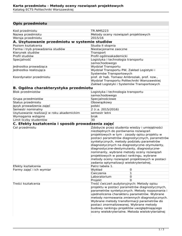 Karta przedmiotu - Wydział Transportu Politechniki Warszawskiej