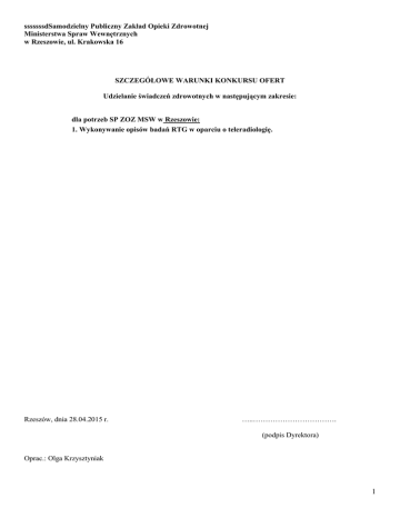 sssssssdSamodzielny Publiczny Zakład Opieki Zdrowotnej Ministerstwa Spraw Wewnętrznych w Rzeszowie, ul. Krakowska 16 SZCZEGÓŁOWE WARUNKI KONKURSU OFERT Udzielanie świadczeń zdrowotnych w następującym zakresie: dla potrzeb SP ZOZ MSW w Rzeszowie: 1. Wykonywanie opisów badań RTG w oparciu o teleradiologię. Rzeszów, dnia 28.04.2015 r. …..……………………………. (podpis Dyrektora) Oprac.: Olga Krzysztyniak 1 I. Przedmiot zamówienia Przedmiotem zamówienia jest udzielanie świadczeń zdrowotnych w zakresie: dla potrzeb SP ZOZ MSW w Rzeszowie: 1. Wykonywanie opisów badań RTG w oparciu o teleradiologię. II. Termin realizacji przedmiotu zamówienia Umowy zostaną zawarte na okres od 20.05.2015 r. do 19.05.2017 r. III. Warunki przystąpienia do konkursu 1. Posiadanie uprawnień oraz udokumentowanego doświadczenia w zakresie udzielania świadczeń zdrowotnych objętych konkursem. 2. Miejscem wykonywania świadczeń będzie placówka Oferenta 4. Świadczenia zdrowotne mają być udzielane całodobowo 5. Posiadanie tytułu lekarza specjalisty lub II stopnia specjalizacji w dziedzinie radiologii przez lekarzy udzielających świadczeń zdrowotnych objętych konkursem 6. Wymagany czas opisu badań RTG: a) Planowe- do 24 godzin od otrzymania badania b) Pilne (oznaczone „CITO”)- do 2 godzin od otrzymania badania 7. Przyjmujący zamówienie ma zapewnić konfigurację urządzeń radiologicznych w taki sposób, aby było moŜliwe wysyłanie zdjęć do opisu przez dostarczone przez niego rozwiązanie bez ograniczenia aktualnie funkcjonującego rozwiązania łączącego aparaty, serwer PACS oraz system HIS/RIS 8. Posiadanie sprzętu i systemu informatycznego zintegrowanego ze sprzętem i systemem informatycznym wykorzystywanym przez Udzielającego Zamówienie. 9. Oprogramowanie Udzielającego Zamówienie: • System RIS i PACS firmy Pixel Technology zintegrowany z systemem HIS • lekarska stacja diagnostyczna 2MP Exhibeon • skaner radiologii pośredniej firmy Carestream classic CR system IV. Opis sposobu przygotowania oferty 1. Oferent sporządza ofertę zgodnie z wymogami określonymi w niniejszej specyfikacji. Ofertę moŜna złoŜyć na drukach załączonych do niniejszej specyfikacji (załącznik nr 1). 2. Druki, które naleŜy wypełnić i podpisać (wyłącznie przez osoby uprawnione do reprezentowania Oferenta) – dotyczy wszystkich przystępujących do postępowania konkursowego bez względu na charakter prawny działalności: 1) oferta zawierająca: - wypełniony formularz cenowy , - wypełnione oświadczenie o zapoznaniu się i akceptacji treści ogłoszenia, warunków konkursu ofert oraz wzoru umowy (załącznik nr 2), Pozostałe wymagane dokumenty zaleŜne od przedmiotu zamówienia: 1) kopia polisy ubezpieczeniowej od odpowiedzialności cywilnej, 2) dyplom ukończenia studiów medycznych, 3) aktualne prawo wykonywania zawodu medycznego, 4) dyplom specjalizacji, 5) inne dokumenty potwierdzające kwalifikacje zawodowe, 6) wpis do ewidencji działalności gospodarczej, 7) potwierdzenie nadania NIP, 9) potwierdzenie nadania REGON. Dokumenty naleŜy złoŜyć w odpisach lub kserokopiach poświadczonych za zgodność z oryginałem przez Oferenta.\ Uwaga: Wyciąg z aktu prawnego o wpisie dotyczącym wpisu do działalności jednostki winien odzwierciedlać stan faktyczny na dzień złoŜenia oferty. 2 V. Forma przygotowania i składania ofert 1. Ofertę naleŜy złoŜyć na załączonych drukach (lub na ich podstawie) wypełniając je czytelnym pismem maszynowym lub drukowanym. 2. Ofertę i wszystkie wymagane dokumenty naleŜy sporządzić w języku polskim z wyłączeniem pojęć medycznych. 3. KaŜdy dokument naleŜy sygnować oryginalnym podpisem osoby upowaŜnionej do reprezentowania firmy na zewnątrz, natomiast strony naleŜy zaparafować. Parafowane muszą być wszystkie miejsca, w których Oferent naniósł zmiany. 4. Ofertę wraz z wymaganymi załącznikami naleŜy umieścić w zapieczętowanej kopercie i opatrzyć następującymi danymi: Samodzielny Publiczny Zakład Opieki Zdrowotnej MSW 35-111 Rzeszów ul. Krakowska 16 konkurs ofert w zakresie… (podać rodzaj świadczenia zdrowotnego) VI. Miejsce i termin składania ofert Ofertę naleŜy złoŜyć w Kancelarii Zamawiającego: 1. Samodzielny Publiczny Zakład Opieki Zdrowotnej MSW 35-111 Rzeszów, ul. Krakowska 16 najpóźniej do dnia 08.05.2015 r. do godz. 11.15 2. Oferty złoŜone po w/w terminie nie będą rozpatrywane. VII. Termin otwarcia złoŜonych ofert 1. Komisja konkursowa dokona otwarcia ofert w dniu 08.05.2015 r. o godz. 11.30 w siedzibie Zamawiającego tj. w Samodzielnym Publicznym Zakładzie Opieki Zdrowotnej MSW 35-111 Rzeszów, ul. Krakowska 16. 2. Dalsze czynności w Komisji odbędą się bez udziału Oferentów. VIII. Przewidywany termin rozstrzygnięcia konkursu ofert 1. Przewidywany termin rozstrzygnięcia konkursu ofert to 13.05.2015 r. 2. Zamawiający zastrzega sobie prawo do odwołania konkursu, przesunięcia terminu składania ofert, przesunięcia terminu rozstrzygnięcia konkursu ofert bez podania przyczyny. IX. Wybór Oferenta i ogłoszenie wyniku konkursu 1. Komisja konkursowa dokona wyboru najkorzystniejszej oferty w oparciu o złoŜoną dokumentację oraz informacje zawarte w formularzu ofertowym, w szczególności oceniając cenę. 2. Zamawiający udzieli zamówienia Oferentowi, którego oferta odpowiadać będzie warunkom zamówienia, a takŜe zostanie uznana za najkorzystniejszą. 3. Komisja moŜe nie przyjąć ofert, których cena przewyŜsza kwotę przeznaczoną na finansowanie zamówienia. 4. Zamawiający niezwłocznie powiadomi o wyniku konkursu podając nazwę (firmę) albo imię i nazwisko i siedzibę albo miejsce zamieszkania i adres świadczeniodawcy, który został wybrany. X. Związanie ofertą Składający ofertę jest nią związany przez okres 30 dni od daty upływu terminu składania ofert. XI. Istotne warunki umowy Ubezpieczenie OC 1. Oferent zobowiązany je