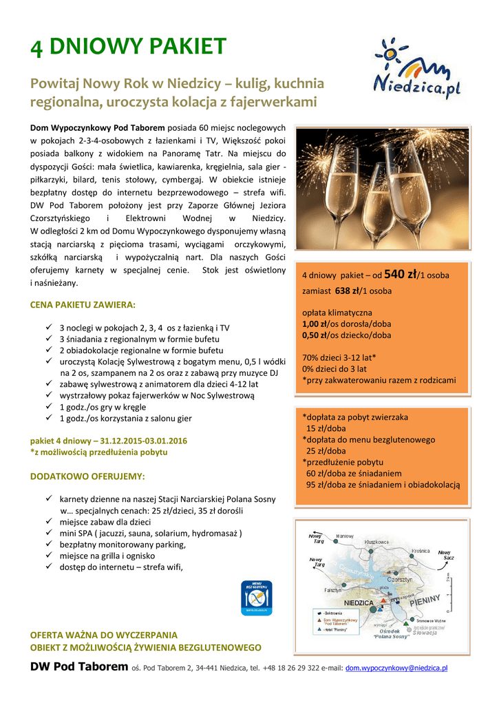 4 DNIOWY PAKIET Powitaj Nowy Rok w Niedzicy – kulig, kuchnia regionalna, uroczysta kolacja z fajerwerkami Dom Wypoczynkowy Pod Taborem posiada 60 miejsc noclegowych w pokojach 2-3-4-osobowych z łazienkami i TV, Większość pokoi posiada balkony z widokiem na Panoramę Tatr. Na miejscu do dyspozycji Gości: mała świetlica, kawiarenka, kręgielnia, sala gier piłkarzyki, bilard, tenis stołowy, cymbergaj. W obiekcie istnieje bezpłatny dostęp do internetu bezprzewodowego – strefa wifi. DW Pod Taborem położony jest przy Zaporze Głównej Jeziora Czorsztyńskiego i Elektrowni Wodnej w Niedzicy. W odległości 2 km od Domu Wypoczynkowego dysponujemy własną stacją narciarską z pięcioma trasami, wyciągami orczykowymi, szkółką narciarską i wypożyczalnią nart. Dla naszych Gości oferujemy karnety w specjalnej cenie. Stok jest oświetlony i naśnieżany. CENA PAKIETU ZAWIERA: 3 noclegi w pokojach 2, 3, 4 os z łazienką i TV 3 śniadania z regionalnym w formie bufetu 2 obiadokolacje regionalne w formie bufetu uroczystą Kolację Sylwestrową z bogatym menu, 0,5 l wódki na 2 os, szampanem na 2 os oraz z zabawą przy muzyce DJ zabawę sylwestrową z animatorem dla dzieci 4-12 lat wystrzałowy pokaz fajerwerków w Noc Sylwestrową 1 godz./os gry w kręgle 1 godz./os korzystania z salonu gier pakiet 4 dniowy – 31.12.2015-03.01.2016 *z możliwością przedłużenia pobytu DODATKOWO OFERUJEMY: 4 dniowy pakiet – od 540 zł/1 osoba zamiast 638 zł/1 osoba opłata klimatyczna 1,00 zł/os dorosła/doba 0,50 zł/os dziecko/doba 70% dzieci 3-12 lat* 0% dzieci do 3 lat *przy zakwaterowaniu razem z rodzicami *dopłata za pobyt zwierzaka 15 zł/doba *dopłata do menu bezglutenowego 25 zł/doba *przedłużenie pobytu 60 zł/doba ze śniadaniem 95 zł/doba ze śniadaniem i obiadokolacją karnety dzienne na naszej Stacji Narciarskiej Polana Sosny w… specjalnych cenach: 25 zł/dzieci, 35 zł dorośli miejsce zabaw dla dzieci mini SPA ( jacuzzi, sauna, solarium, hydromasaż ) bezpłatny monitorowany parking, miejsce na grilla i ognisko dostęp do internetu – strefa wifi, OFERTA WAŻNA DO WYCZERPANIA OBIEKT Z MOŻLIWOŚCIĄ ŻYWIENIA BEZGLUTENOWEGO DW Pod Taborem oś. Pod Taborem 2, 34-441 Niedzica, tel. +48 18 26 29 322 e-mail: [email protected]