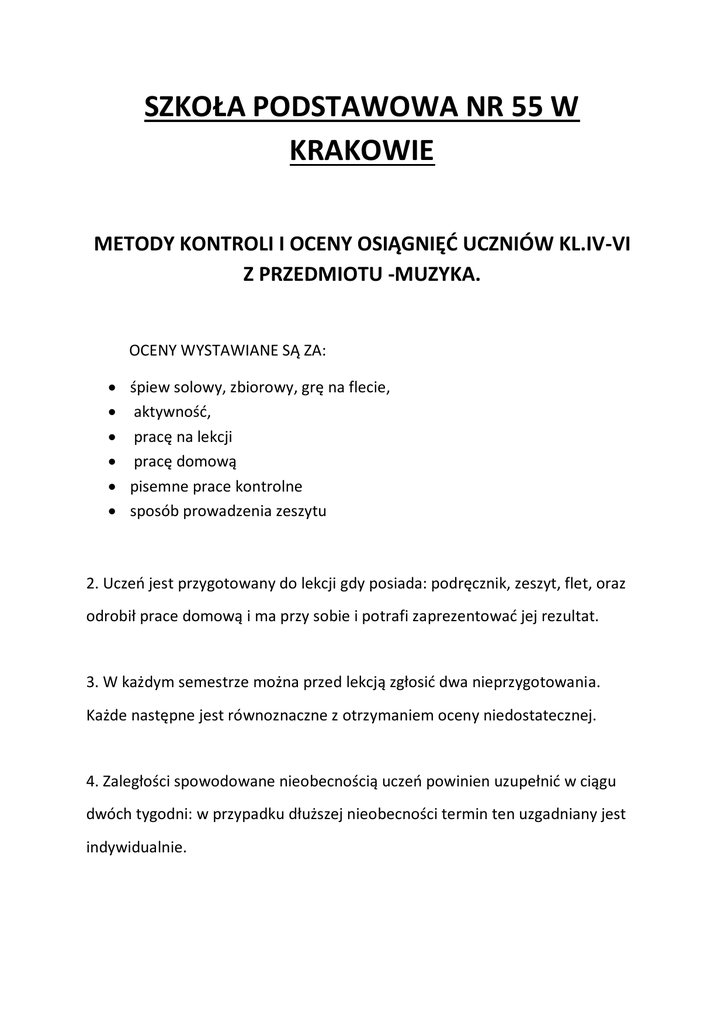 SZKOŁA PODSTAWOWA NR 55 W KRAKOWIE METODY KONTROLI I OCENY OSIĄGNIĘĆ UCZNIÓW KL.IV-VI Z PRZEDMIOTU -MUZYKA. OCENY WYSTAWIANE SĄ ZA: śpiew solowy, zbiorowy, grę na flecie, aktywność, pracę na lekcji pracę domową pisemne prace kontrolne sposób prowadzenia zeszytu 2. Uczeń jest przygotowany do lekcji gdy posiada: podręcznik, zeszyt, flet, oraz odrobił prace domową i ma przy sobie i potrafi zaprezentować jej rezultat. 3. W każdym semestrze można przed lekcją zgłosić dwa nieprzygotowania. Każde następne jest równoznaczne z otrzymaniem oceny niedostatecznej. 4. Zaległości spowodowane nieobecnością uczeń powinien uzupełnić w ciągu dwóch tygodni: w przypadku dłuższej nieobecności termin ten uzgadniany jest indywidualnie. KRYTERIA I ZAKRES OCENIANIA NA LEKCJACH MUZYKI W KLASACH IV-VI Ocenę celującą(6) otrzymuje uczeń, który: prawidłowo i samodzielnie śpiewa piosenkę z podręcznika oraz repertuaru dodatkowego, prawidłowo i samodzielnie gra na różnych instrumentach melodycznych melodie z podręcznika i repertuaru dodatkowego, samodzielnie odczytuje i wykonuje dowolny utwór, potrafi rozpoznać budowę utworu muzycznego, posiada wiedzę i umiejętności wykraczające poza poziom wymagań na ocenę bardzo dobrą, jest bardzo aktywny muzycznie, wykonuje różne zadania twórcze, np. układa melodie do wiersza, akompaniament perkusyjny do piosenki, Ocenę bardzo dobrą(5) otrzymuje uczeń, który: prawidłowo i samodzielnie śpiewa większość piosenek przewidzianych w programie nauczania, prawidłowo i samodzielnie gra na instrumentach melodycznych większość melodii przewidzianych w programie nauczania, umie bezbłędnie wykonywać rytmy- gestodźwiękami i na instrumentach perkusyjnych, potrafi rytmizować teksty, rozumie zapis nutowy i potrafi się nim posługiwać, zna podstawowe terminy muzyczne omawiane w danej klasie, podaje nazwiska wybitnych kompozytorów z programu danej klasy. Ocenę dobrą(4) otrzymuje uczeń, który: poprawnie i z niewielka pomocą nauczyciela śpiewa pieśni i piosenki jednogłosowe, poprawnie i z niewielka pomocą nauczyciela gra kilka melodii oraz akompaniamentów do piosenek na używanym na lekcji instrumencie melodycznym, wykonuje proste rytmy- gestodźwiękami i na instrumentach perkusyjnych niemelodycznych, rytmizuje łatwe teksty, zna podstawowe terminy muzyczne omawiane w danej klasie i wie, co one oznaczają, prowadzi systematycznie i starannie zeszyt przedmiotowy. Ocenę dostateczną (3) otrzymuje uczeń, który: niezbyt poprawnie z dużą pomocą nauczyciela śpiewa niektóre piosenki przewidziane w programie nauczania, niezbyt poprawnie z dużą pomocą nauczyciela gra na używanym na lekcji instrumencie melodycznym niektóre melodie przewidziane w programie nauczania, wykonuje najprostsze ćwiczenia rytmiczne- gestodźwiękami i na instrumentach perkusyjnych niemelodycznych zna tylko niektóre terminy muzyczne, prowadzi zeszyt niesystematycznie i niestarannie. Ocenę dopuszczającą(2) otrzymuje uczeń, który: niedbale, nie starając się poprawić błędów, śpiewa kilka najprostszych piosenek przewidzianych w programie nauczania, niedbale, nie starając się poprawić błędów, gra na instrumencie melodycznym gamę i kilka najprostszych utworów przewidzianych w programie nauczania, niechętnie podejmuje działania muzyczne, myli terminy muzyczne, dysponuje tylko fragmentaryczną wiedzą, najprostsze polecenia-ćwiczenia rytmiczne- wykonuje z pomocą nauczyciela. Ocenę niedostateczną(1) otrzymuje uczeń, który: otrzymuje uczeń tylko w sytuacjach wyjątkowych, np. pomimo usilnych starań nauczyciela wykazuje negatywny stosunek do przedmiotu oraz ma bardzo duże braki w zakresie podstawowych wymagań edukacyjnych dotyczących przedmiotu.