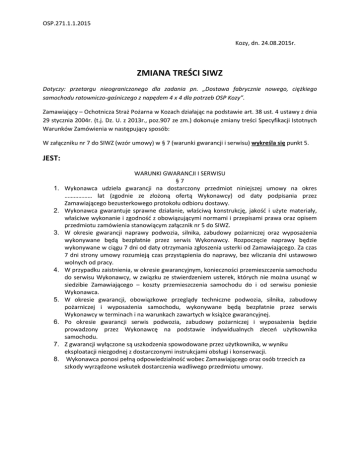 OSP.271.1.1.2015 Kozy, dn. 24.08.2015r. ZMIANA TREŚCI SIWZ Dotyczy: przetargu nieograniczonego dla zadania pn. „Dostawa fabrycznie nowego, ciężkiego samochodu ratowniczo-gaśniczego z napędem 4 x 4 dla potrzeb OSP Kozy”. Zamawiający – Ochotnicza Straż Pożarna w Kozach działając na podstawie art. 38 ust. 4 ustawy z dnia 29 stycznia 2004r. (t.j. Dz. U. z 2013r., poz.907 ze zm.) dokonuje zmiany treści Specyfikacji Istotnych Warunków Zamówienia w następujący sposób: W załączniku nr 7 do SIWZ (wzór umowy) w § 7 (warunki gwarancji i serwisu) wykreśla się punkt 5. JEST: 1. 2. 3. 4. 5. 6. 7. 8. WARUNKI GWARANCJI I SERWISU §7 Wykonawca udziela gwarancji na dostarczony przedmiot niniejszej umowy na okres ……………… lat (zgodnie ze złożoną ofertą Wykonawcy) od daty podpisania przez Zamawiającego bezusterkowego protokołu odbioru dostawy. Wykonawca gwarantuje sprawne działanie, właściwą konstrukcję, jakość i użyte materiały, właściwe wykonanie i zgodność z obowiązującymi normami i przepisami prawa oraz opisem przedmiotu zamówienia stanowiącym załącznik nr 5 do SIWZ. W okresie gwarancji naprawy podwozia, silnika, zabudowy pożarniczej oraz wyposażenia wykonywane będą bezpłatnie przez serwis Wykonawcy. Rozpoczęcie naprawy będzie wykonywane w ciągu 7 dni od daty otrzymania zgłoszenia usterki od Zamawiającego. Za czas 7 dni strony umowy rozumieją czas przystąpienia do naprawy, bez wliczania dni ustawowo wolnych od pracy. W przypadku zaistnienia, w okresie gwarancyjnym, konieczności przemieszczenia samochodu do serwisu Wykonawcy, w związku ze stwierdzeniem usterek, których nie można usunąć w siedzibie Zamawiającego – koszty przemieszczenia samochodu do i od serwisu poniesie Wykonawca. W okresie gwarancji, obowiązkowe przeglądy techniczne podwozia, silnika, zabudowy pożarniczej i wyposażenia samochodu, wykonywane będą bezpłatnie przez serwis Wykonawcy w terminach i na warunkach zawartych w książce gwarancyjnej. Po okresie gwarancji serwis podwozia, zabudowy pożarniczej i wyposażenia będzie prowadzony przez Wykonawcę na podstawie indywidualnych zleceń użytkownika samochodu. Z gwarancji wyłączone są uszkodzenia spowodowane przez użytkownika, w wyniku eksploatacji niezgodnej z dostarczonymi instrukcjami obsługi i konserwacji. Wykonawca ponosi pełną odpowiedzialność wobec Zamawiającego oraz osób trzecich za szkody wyrządzone wskutek dostarczenia wadliwego przedmiotu umowy. OSP.271.1.1.2015 WINNO BYĆ: 1. 2. 3. 4. 5. 6. 7. WARUNKI GWARANCJI I SERWISU §7 Wykonawca udziela gwarancji na dostarczony przedmiot niniejszej umowy na okres ……………… lat (zgodnie ze złożoną ofertą Wykonawcy) od daty podpisania przez Zamawiającego bezusterkowego protokołu odbioru dostawy. Wykonawca gwarantuje sprawne działanie, właściwą konstrukcję, jakość i użyte materiały, właściwe wykonanie i zgodność z obowiązującymi normami i przepisami prawa oraz opisem przedmiotu zamówienia stanowiącym załącznik nr 5 do SIWZ. W okresie gwarancji naprawy podwozia, silnika, zabudowy pożarniczej oraz wyposażenia wykonywane będą bezpłatnie przez serwis Wykonawcy. Rozpoczęcie naprawy będzie wykonywane w ciągu 7 dni od daty otrzymania zgłoszenia usterki od Zamawiającego. Za czas 7 dni strony umowy rozumieją czas przystąpienia do naprawy, bez wliczania dni ustawowo wolnych od pracy. W przypadku zaistnienia, w okresie gwarancyjnym, konieczności przemieszczenia samochodu do serwisu Wykonawcy, w związku ze stwierdzeniem usterek, których nie można usunąć w siedzibie Zamawiającego – koszty przemieszczenia samochodu do i od serwisu poniesie Wykonawca. Po okresie gwarancji serwis podwozia, zabudowy pożarniczej i wyposażenia będzie prowadzony przez Wykonawcę na podstawie indywidualnych zleceń użytkownika samochodu. Z gwarancji wyłączone są uszkodzenia spowodowane przez użytkownika, w wyniku eksploatacji niezgodnej z dostarczonymi instrukcjami obsługi i konserwacji. Wykonawca ponosi pełną odpowiedzialność wobec Zamawiającego oraz osób trzecich za szkody wyrządzone wskutek dostarczenia wadliwego przedmiotu umowy. Jednocześnie zamawiający informuje, iż pozostałe postanowienia Specyfikacji pozostają bez zmian.