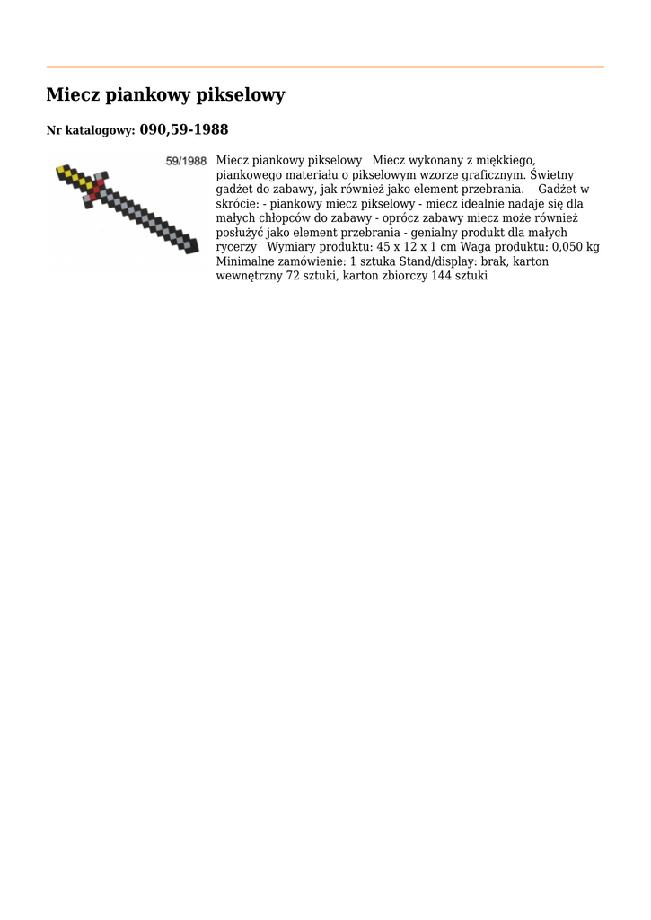 Miecz piankowy pikselowy Nr katalogowy: 090,59-1988 Miecz piankowy pikselowy Miecz wykonany z miękkiego, piankowego materiału o pikselowym wzorze graficznym. Świetny gadżet do zabawy, jak również jako element przebrania. Gadżet w skrócie: - piankowy miecz pikselowy - miecz idealnie nadaje się dla małych chłopców do zabawy - oprócz zabawy miecz może również posłużyć jako element przebrania - genialny produkt dla małych rycerzy Wymiary produktu: 45 x 12 x 1 cm Waga produktu: 0,050 kg Minimalne zamówienie: 1 sztuka Stand/display: brak, karton wewnętrzny 72 sztuki, karton zbiorczy 144 sztuki