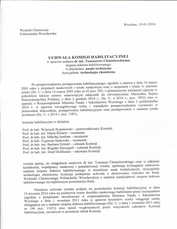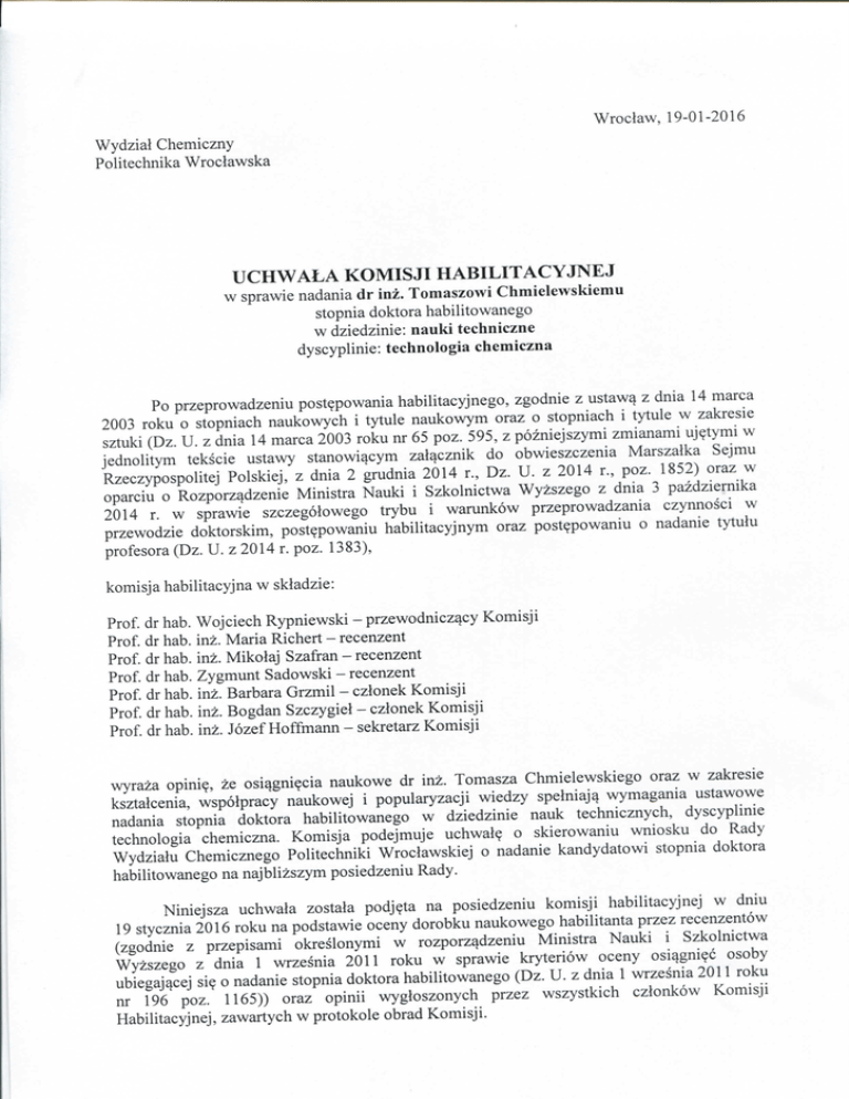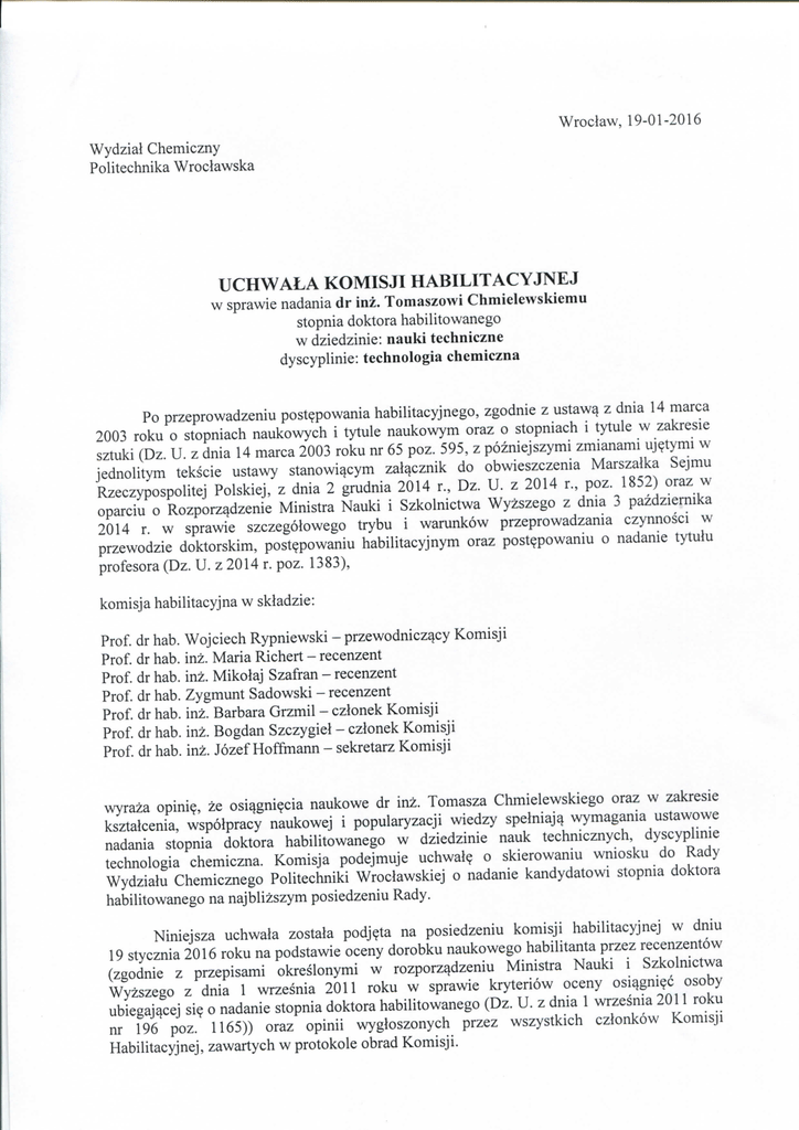Wroclaw, 19-01-2016 Wydzial Chemiczny Politechnika Wroclawska U C H W A L A KOMISJI H A B I L I T A C Y J N E J w sprawie nadania dr inz. Tomaszowi Chmielewskiemu stopnia doktora habilitowanego w dziedzinie: nauki techniczne dyscyplinie: technologia chemiczna Po przeprowadzeniu post^powania habilitacyjnego, zgodnie z ustaw^ z dnia 14 marca 2003 roku o stopniach naukowych i tytule naukowym oraz o stopniach i tytule w zakresie sztuki (Dz. U. z dnia 14 marca 2003 roku nr 65 poz. 595, z pozniejszymi zmianami uj^tymi w jednolitym tekscie ustawy stanowi^cym zal^cznik do obwieszczenia Marszalka Sejmu Rzeczypospolitej Polskiej, z dnia 2 grudnia 2014 r., Dz. U . z 2014 r., poz. 1852) oraz w oparciu o Rozporz^dzenie Ministra Nauki i Szkolnictwa Wyzszego z dnia 3 pazdziernika 2014 r. w sprawie szczegolowego trybu i warunkow przeprowadzania czynnosci w przewodzie doktorskim, post^powaniu habilitacyjnym oraz post^powaniu o nadanie tytuiu profesora (Dz. U. z 2014 r. poz. 1383), komisja habilitacyjna w skladzie: Prof, Prof, Prof, Prof Prof Prof Prof dr hab. dr hab. dr hab. dr hab. dr hab. dr hab. dr hab. Wojciech Rypniewski - przewodnicz^cy Komisji inz. Maria Richert - recenzent inz. Mikolaj Szafran - recenzent Zygmunt Sadowski - recenzent inz. Barbara Grzmil - cztonek Komisji inz. Bogdan Szczygiet - czlonek Komisji inz. Jozef Hoffmann - sekretarz Komisji wyraza opini?, ze osi^gni^cia naukowe dr inz. Tomasza Chmielewskiego oraz w zakresie ksztalcenia, wspotpracy naukowej i popularyzacji wiedzy spetniaj^ wymagania ustawowe nadania stopnia doktora habilitowanego w dziedzinie nauk technicznych, dyscyplinie technologia chemiczna. Komisja podejmuje uchwal^ o skierowaniu wniosku do Rady Wydziaiu Chemicznego Politechniki Wroclawskiej o nadanie kandydatowi stopnia doktora habilitowanego na najblizszym posiedzeniu Rady. Niniejsza uchwala zostala podj^ta na posiedzeniu komisji habilitacyjnej w dniu 19 stycznia 2016 roku na podstawie oceny dorobku naukowego habilitanta przez recenzentow (zgodnie z przepisami okreslonymi w rozporz^dzeniu Ministra Nauki i Szkolnictwa Wyzszego z dnia 1 wrzesnia 2011 roku w sprawie kryteriow oceny osi^gni^c osoby ubiegaj^cej si§ o nadanie stopnia doktora habilitowanego (Dz. U. z dnia 1 wrzesnia 2011 roku nr 196 poz. 1165)) oraz opinii wygioszonych przez wszystkich cztonkow Komisji Habilitacyjnej, zawartych w protokole obrad Komisji. Wynik jawnego gtosowania cztonkow komisji tiabilitacyjnej: Uprawnionycti do gtosowania Obecnycli na posiedzeniu: Za wnioskiem: Przeciw: Wstrzymuj^cych si?: 7 7 7 0 0 Uzasadnienie uchwaty: Dorobek naukowy dr inz. Tomasza Climielewskiego oraz osi^gni^cia w zakresie ksztatcenia, wspotpracy naukowej i popularyzacji wiedzy spetniaj^ kryteria ustawowe i zwyczajowe do ubiegania si? o uzyskanie stopnia naukowego doktora habilitowanego w dziedzinie nauk technicznych, dyscyplinie technologia chemiczna. Podpisy cztonkow Komisji: Prof, dr hab. Wojciech Rypniewski Prof, dr hab. inz. Maria Richert Prof dr hab. int. Mikolaj Szafran Prof dr hab. Zygmunt Sadowski Prof dr hab. inz. Barbara Grzmil Prof dr hab. inz. Bogdan Szczygiel Prof dr hab. int. Jozef Hoffmann