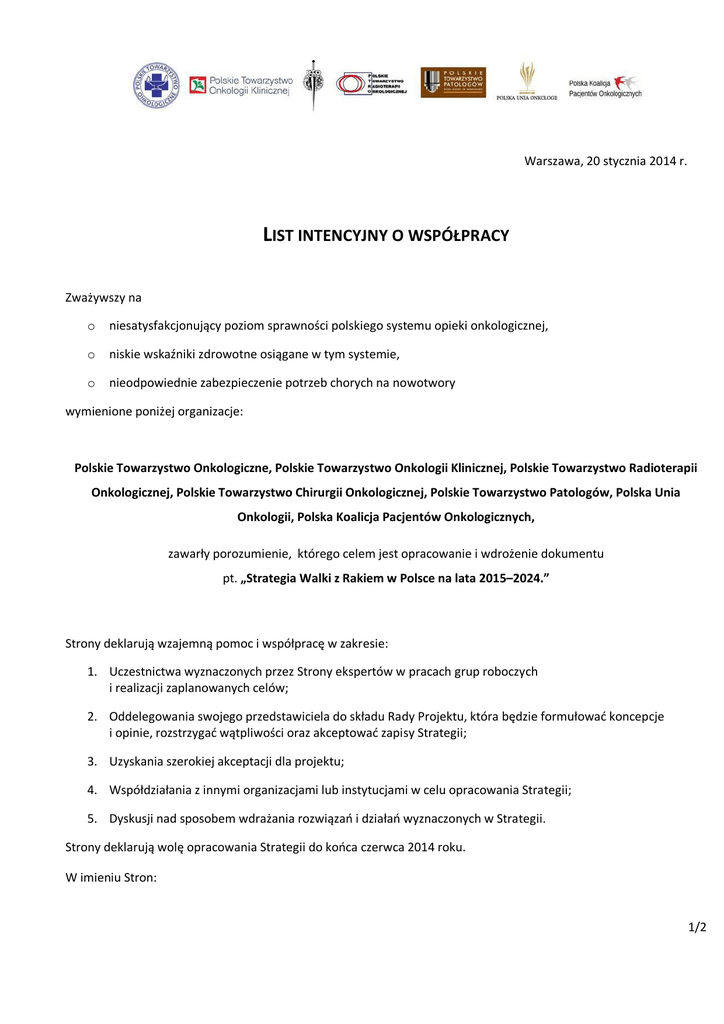 Warszawa, 20 stycznia 2014 r. LIST INTENCYJNY O WSPÓŁPRACY Zważywszy na o niesatysfakcjonujący poziom sprawności polskiego systemu opieki onkologicznej, o niskie wskaźniki zdrowotne osiągane w tym systemie, o nieodpowiednie zabezpieczenie potrzeb chorych na nowotwory wymienione poniżej organizacje: Polskie Towarzystwo Onkologiczne, Polskie Towarzystwo Onkologii Klinicznej, Polskie Towarzystwo Radioterapii Onkologicznej, Polskie Towarzystwo Chirurgii Onkologicznej, Polskie Towarzystwo Patologów, Polska Unia Onkologii, Polska Koalicja Pacjentów Onkologicznych, zawarły porozumienie, którego celem jest opracowanie i wdrożenie dokumentu pt. „Strategia Walki z Rakiem w Polsce na lata 2015–2024.” Strony deklarują wzajemną pomoc i współpracę w zakresie: 1. Uczestnictwa wyznaczonych przez Strony ekspertów w pracach grup roboczych i realizacji zaplanowanych celów; 2. Oddelegowania swojego przedstawiciela do składu Rady Projektu, która będzie formułować koncepcje i opinie, rozstrzygać wątpliwości oraz akceptować zapisy Strategii; 3. Uzyskania szerokiej akceptacji dla projektu; 4. Współdziałania z innymi organizacjami lub instytucjami w celu opracowania Strategii; 5. Dyskusji nad sposobem wdrażania rozwiązań i działań wyznaczonych w Strategii. Strony deklarują wolę opracowania Strategii do końca czerwca 2014 roku. W imieniu Stron: 1/2 Polska Koalicja Pacjentów Onkologicznych Jacek Gugulski Polska Unia Onkologii Dr Janusz Meder Polskie Towarzystwo Chirurgii Onkologicznej Prof. Wojciech Zegarski Polskie Towarzystwo Onkologiczne Prof. Jacek Jassem Polskie Towarzystwo Onkologii Klinicznej Prof. Maciej Krzakowski Polskie Towarzystwo Patologów Prof. Anna Nasierowska – Guttmejer Polskie Towarzystwo Radioterapii Onkologicznej Prof. Krzysztof Składowski 2/2